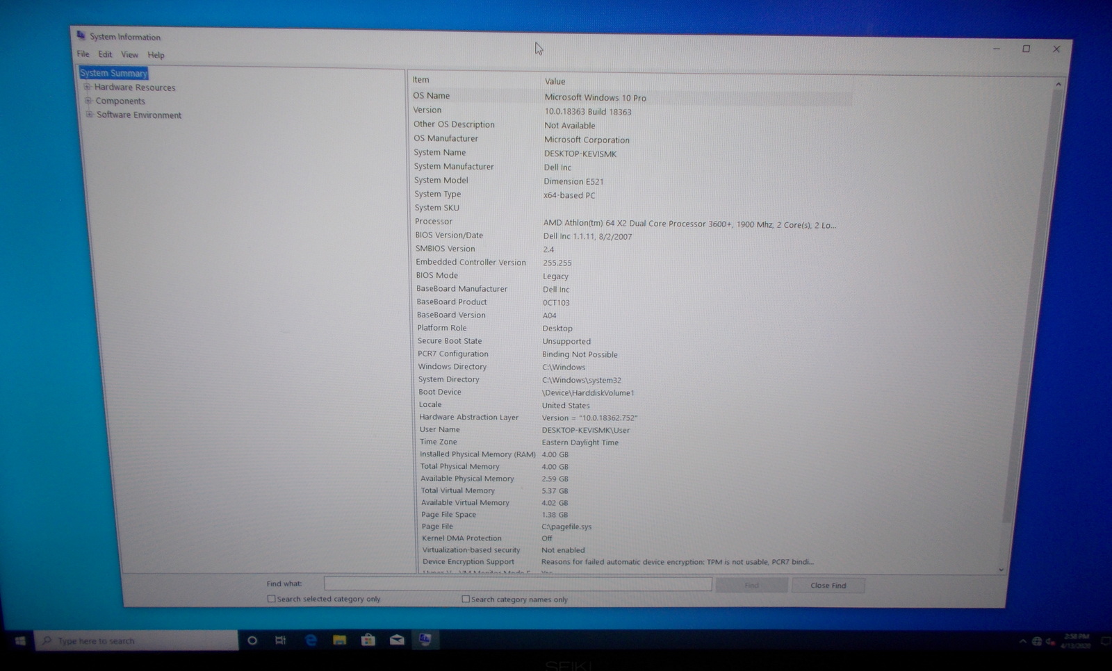 Up for sale is a used Dell Dimension E521 Desktop PC in good used condition. The SSD has been wiped and a there is a clean install of Windows 10 Pro version 1909 on it – this originally came with Windows XP Home Edition on it – the product key for Windows XP Home is on a sticker on the top of the case. We upgraded to Windows 8 Pro during the promotion Microsoft had for upgrading to Windows 8 Pro for $15, then we upgraded again to Windows 10 Pro under the free upgrade period. It is really remarkable that a PC manufactured in 2007 can still run a current operating system – albeit rather slowly. We finally retired this one and replaced it with a newer, faster machine.