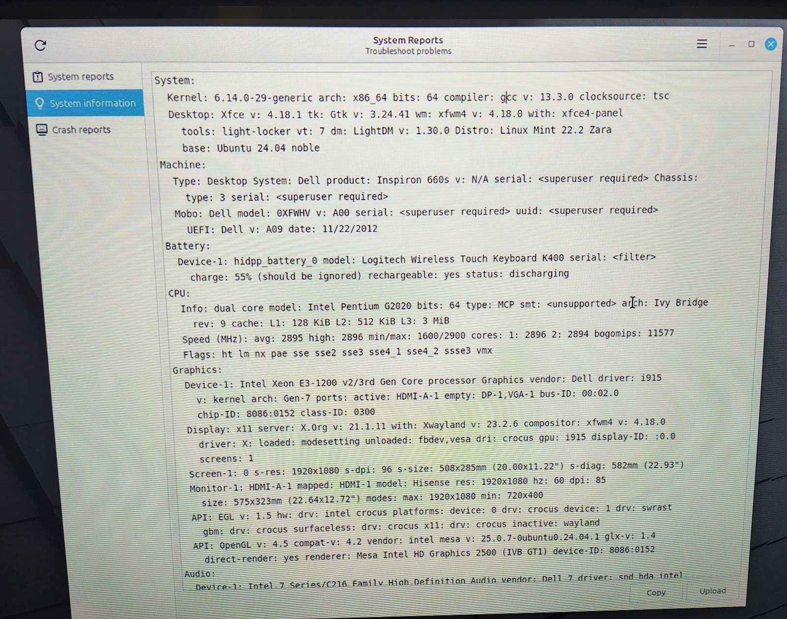 Up for sale is a Dell Inspiron 660s SFF (Small Form Factor) slim desktop PC in good used condition. This originally came with a conventional hard drive and it was upgraded to SSD – the original HDD is NOT included. This was put into service in April of 2013 and recently retired. The SSD has been wiped and a there is a clean install of Linux Mint 22.2 xfce on it – this originally came with Windows 8 on it and had been upgraded to Windows 10, but there is NO PRODUCT KEY included. It runs Linux a lot faster than Windows 10! We retired this PC when it was replaced with something faster and newer. The password for Linux is password – we recommend you change this. The case is in ok shape with minor scratches/scrapes – see pictures. Please keep these things in mind when considering your purchase. If you would like to save on the shipping cost, you’re welcome to schedule an appointment and stop by to pick it up.
