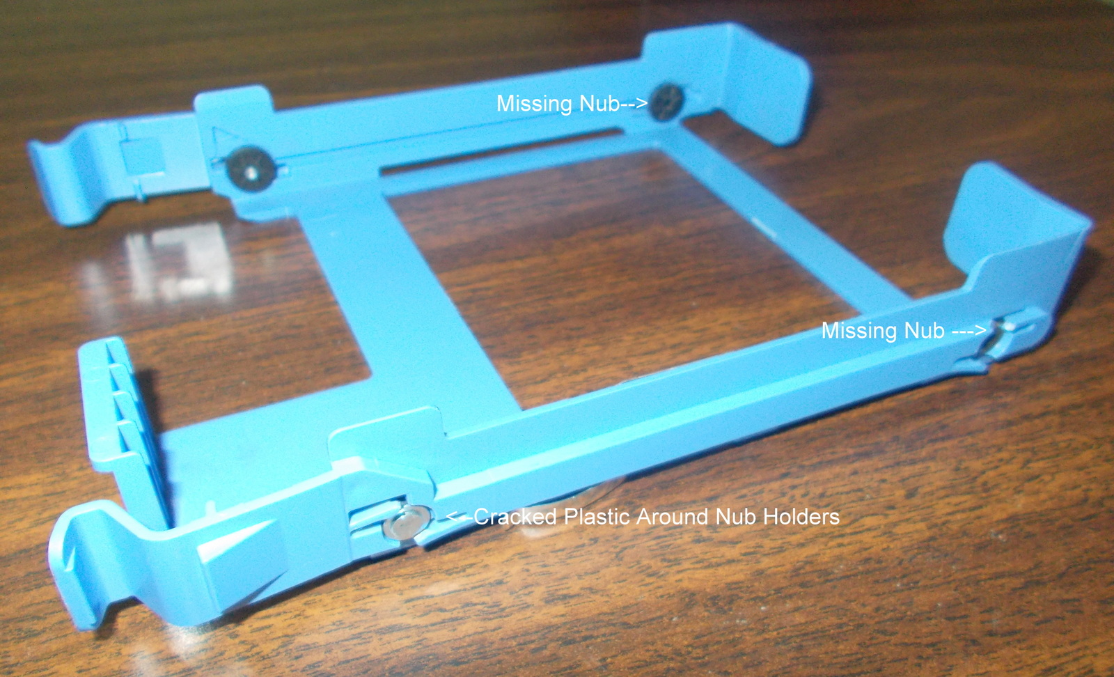 - 3.5″ Hard Drive Bracket is missing two of the metal nubs which go into the screw holes on the hard drive AND the plastic where the nubs fit into the bracket is broken – SEE PICTURE!