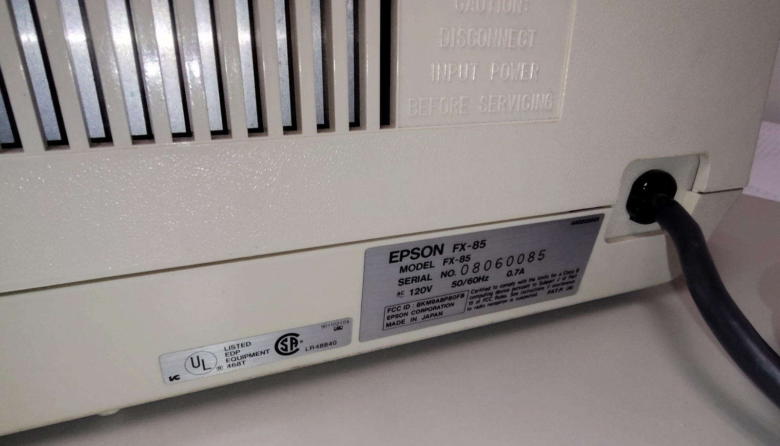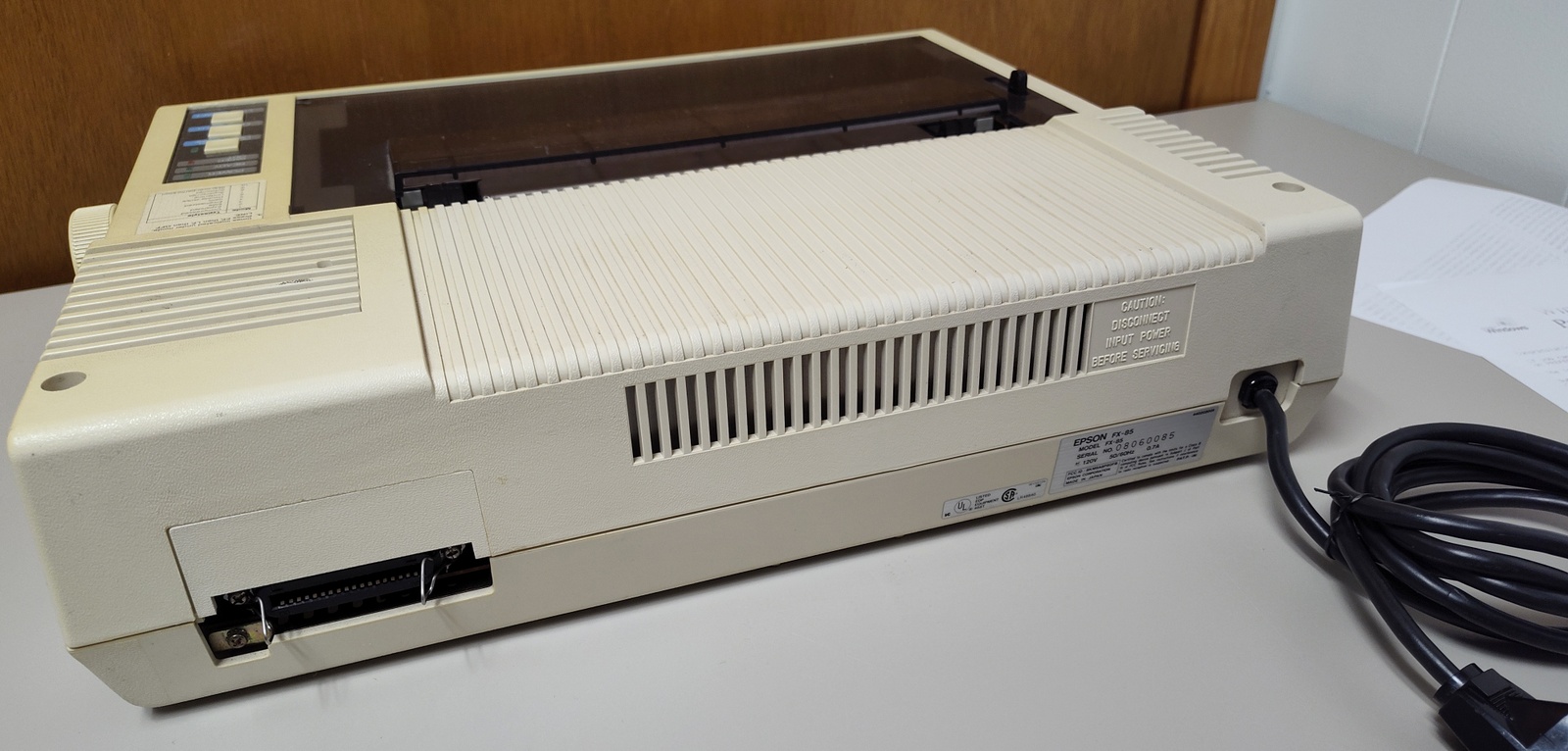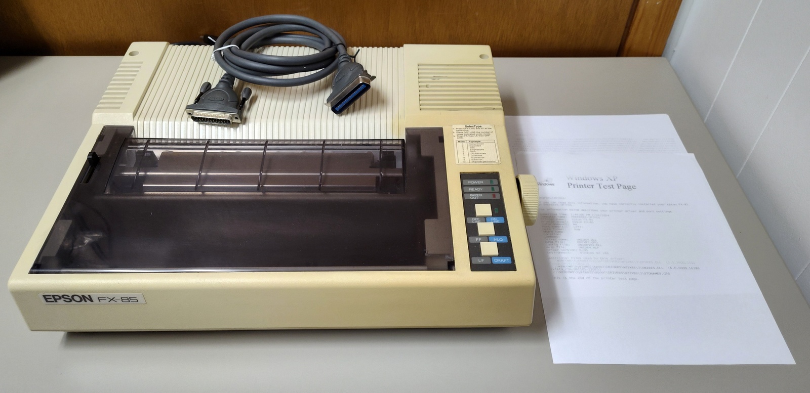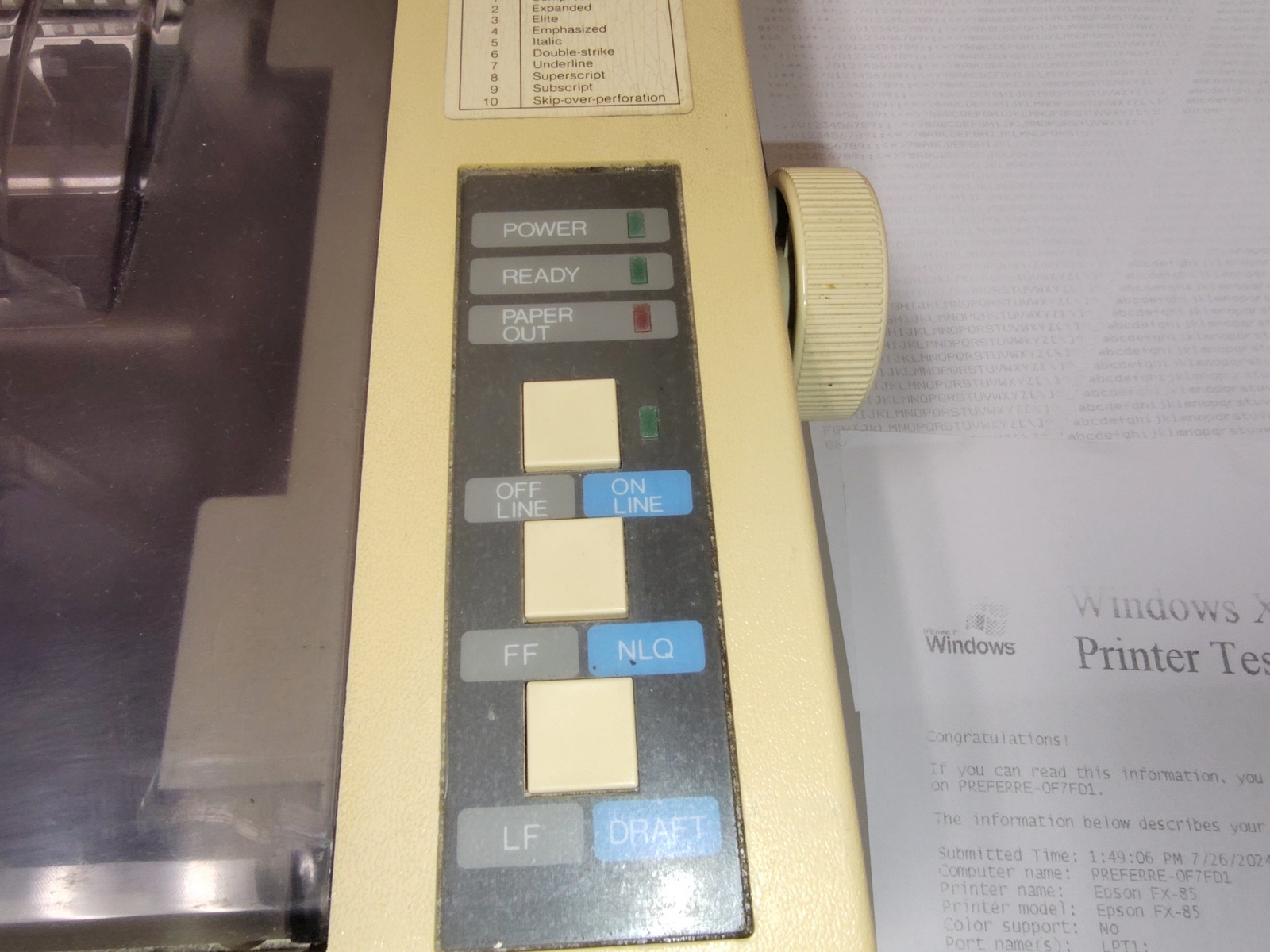 Up for sale is an old Epson FX-85 parallel port dot matrix printer. We powered it on and were successfully able to print a self test page by holding the line feed button while powering on the printer – see pictures, we also connected it to an old Windows XP computer and we were able to get it to print a test page connected via the parallel port. The driver was built-in with Windows XP/ The test pages are are a bit on the light side considering they were printed with a ribbon which has been in the printer from decades ago! This printer supports tractor paper also (NOT tested as we don’t have any tractor feed paper available.) This was likely surplus from a government auction years ago and has the word ‘surplus’ written on the side – SEE PICTURES!