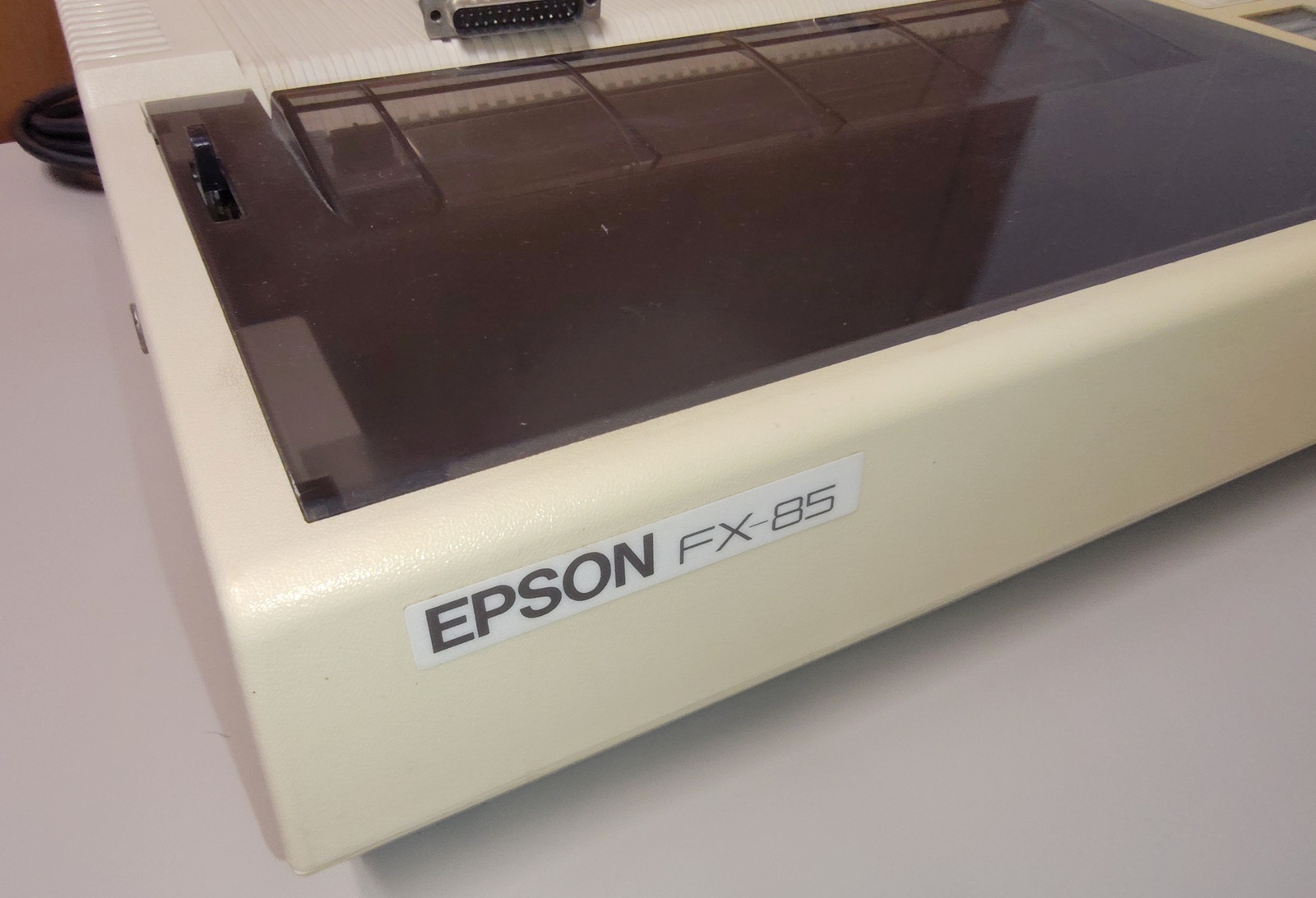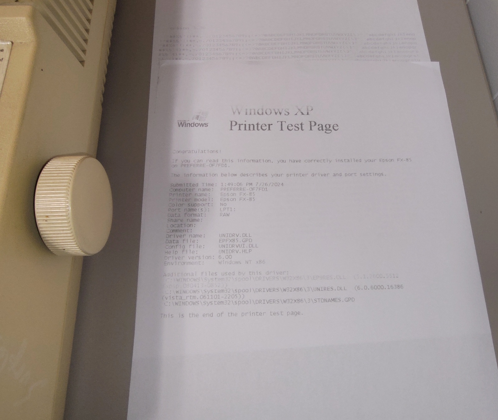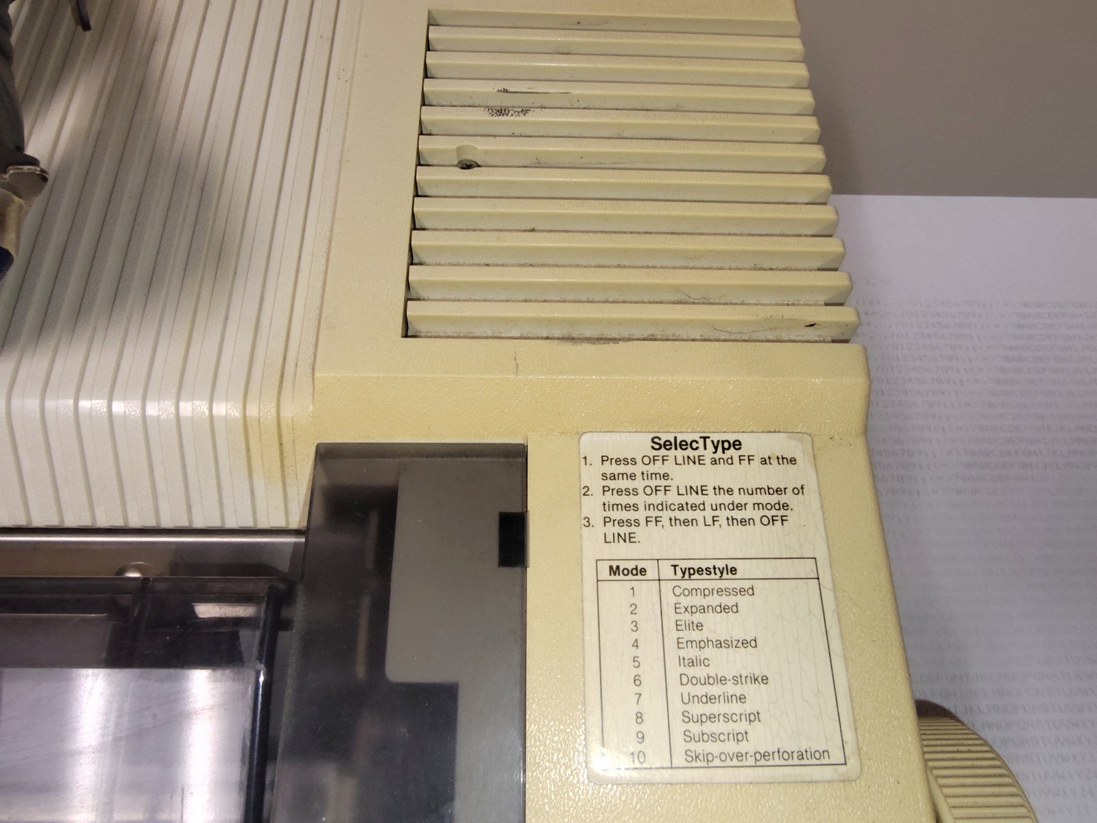 Up for sale is an old Epson FX-85 parallel port dot matrix printer. We powered it on and were successfully able to print a self test page by holding the line feed button while powering on the printer – see pictures, we also connected it to an old Windows XP computer and we were able to get it to print a test page connected via the parallel port. The driver was built-in with Windows XP/ The test pages are are a bit on the light side considering they were printed with a ribbon which has been in the printer from decades ago! This printer supports tractor paper also (NOT tested as we don’t have any tractor feed paper available.) This was likely surplus from a government auction years ago and has the word ‘surplus’ written on the side – SEE PICTURES!