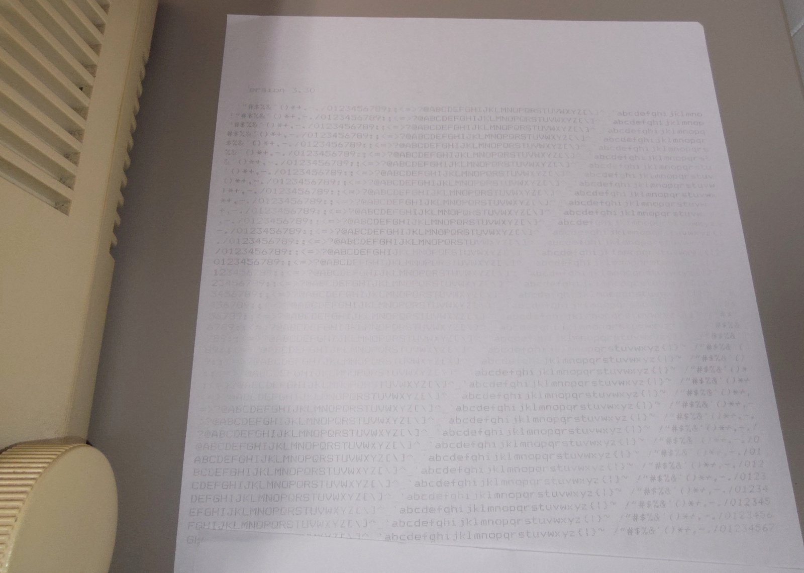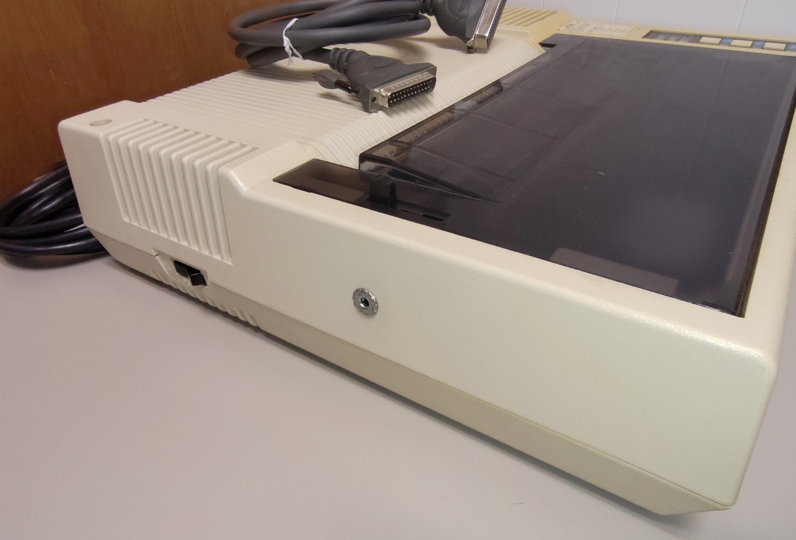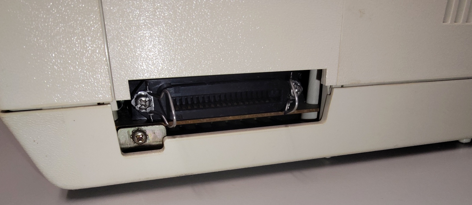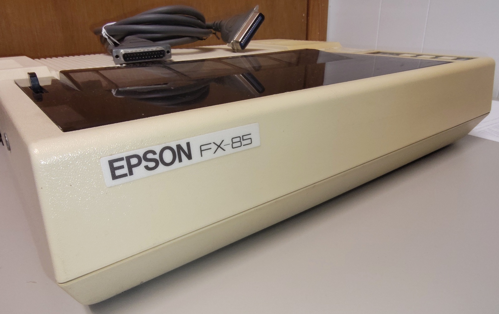 Up for sale is an old Epson FX-85 parallel port dot matrix printer. We powered it on and were successfully able to print a self test page by holding the line feed button while powering on the printer – see pictures, we also connected it to an old Windows XP computer and we were able to get it to print a test page connected via the parallel port. The driver was built-in with Windows XP/ The test pages are are a bit on the light side considering they were printed with a ribbon which has been in the printer from decades ago! This printer supports tractor paper also (NOT tested as we don’t have any tractor feed paper available.) This was likely surplus from a government auction years ago and has the word ‘surplus’ written on the side – SEE PICTURES!