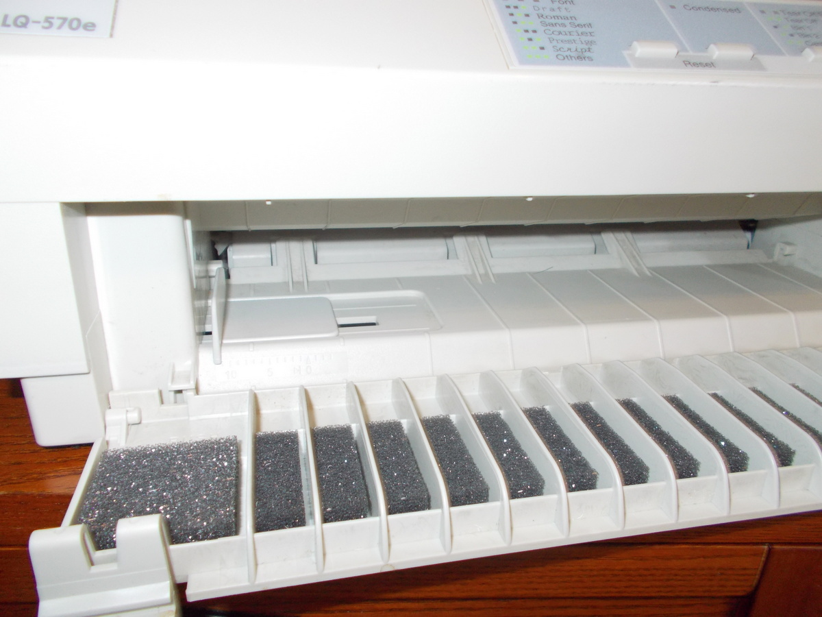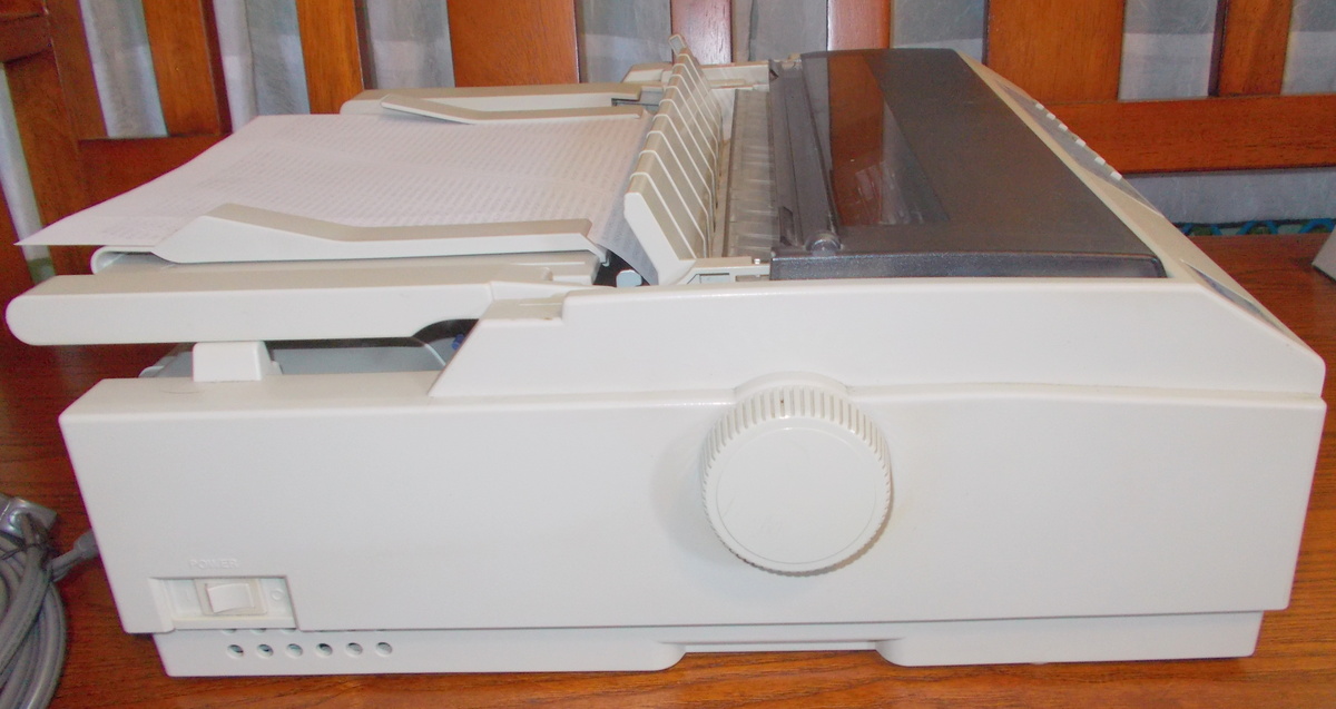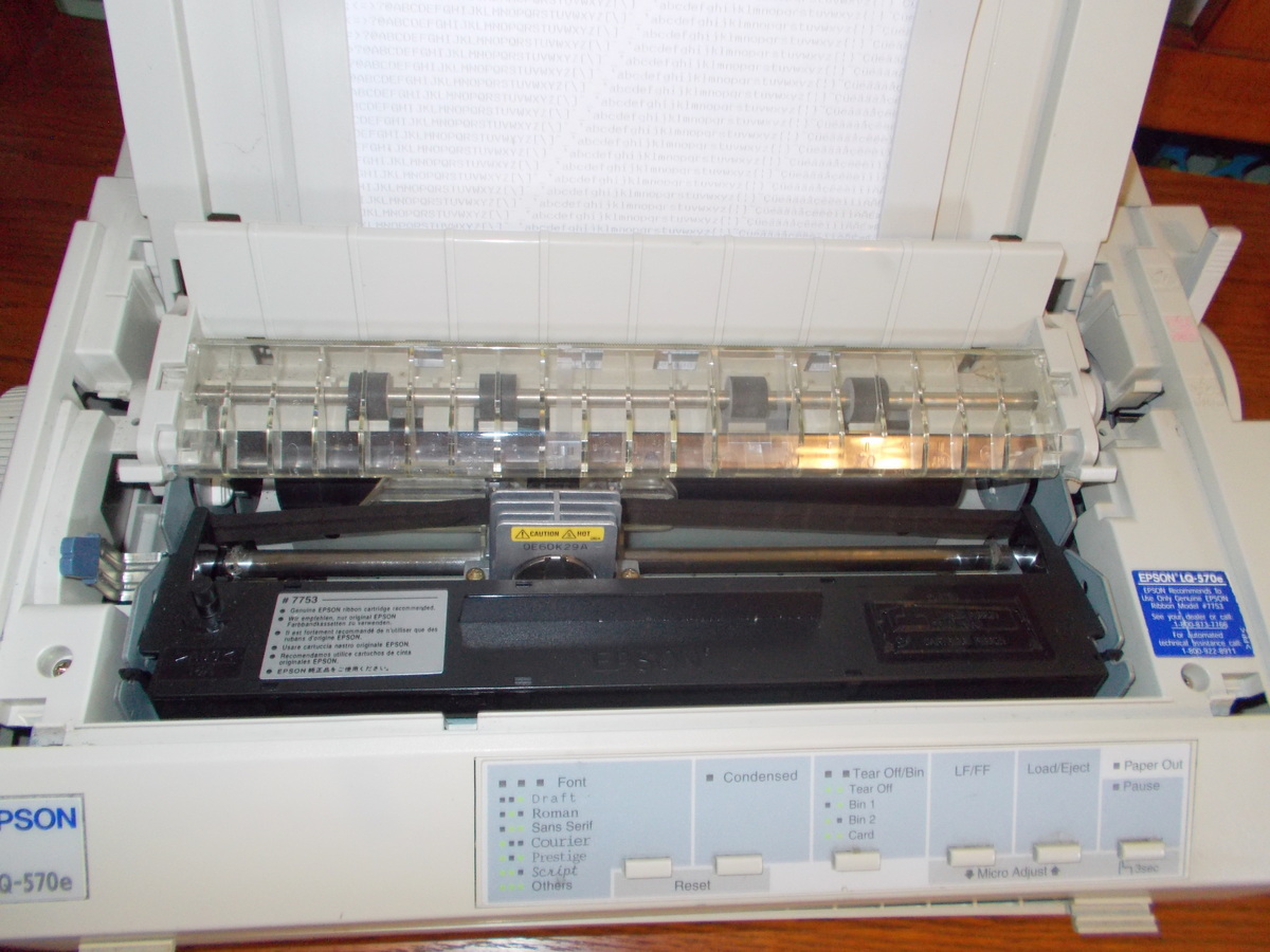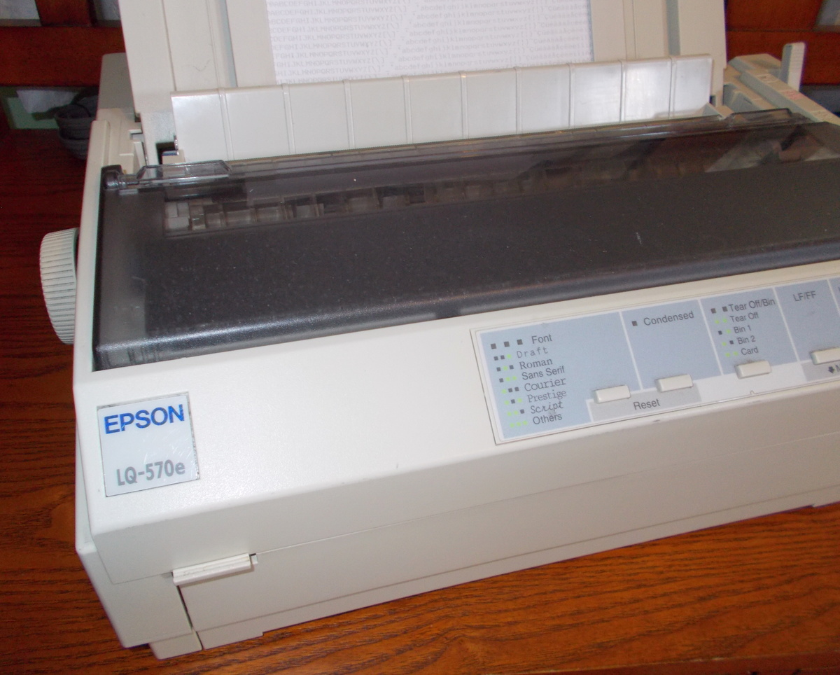 Up for sale is an old Epson LQ-570e dot matrix printer. We powered it on and were successfully able to print a test page – see pictures. The test page is a bit faded, but it was printed on the the ribbon which was installed in the printer. This comes with two extra ribbons in the original boxes – dated 2001. We are unable to test the connectivity. If you would like to save on the shipping, you’re welcome to schedule an appointment and stop by to pick it up.