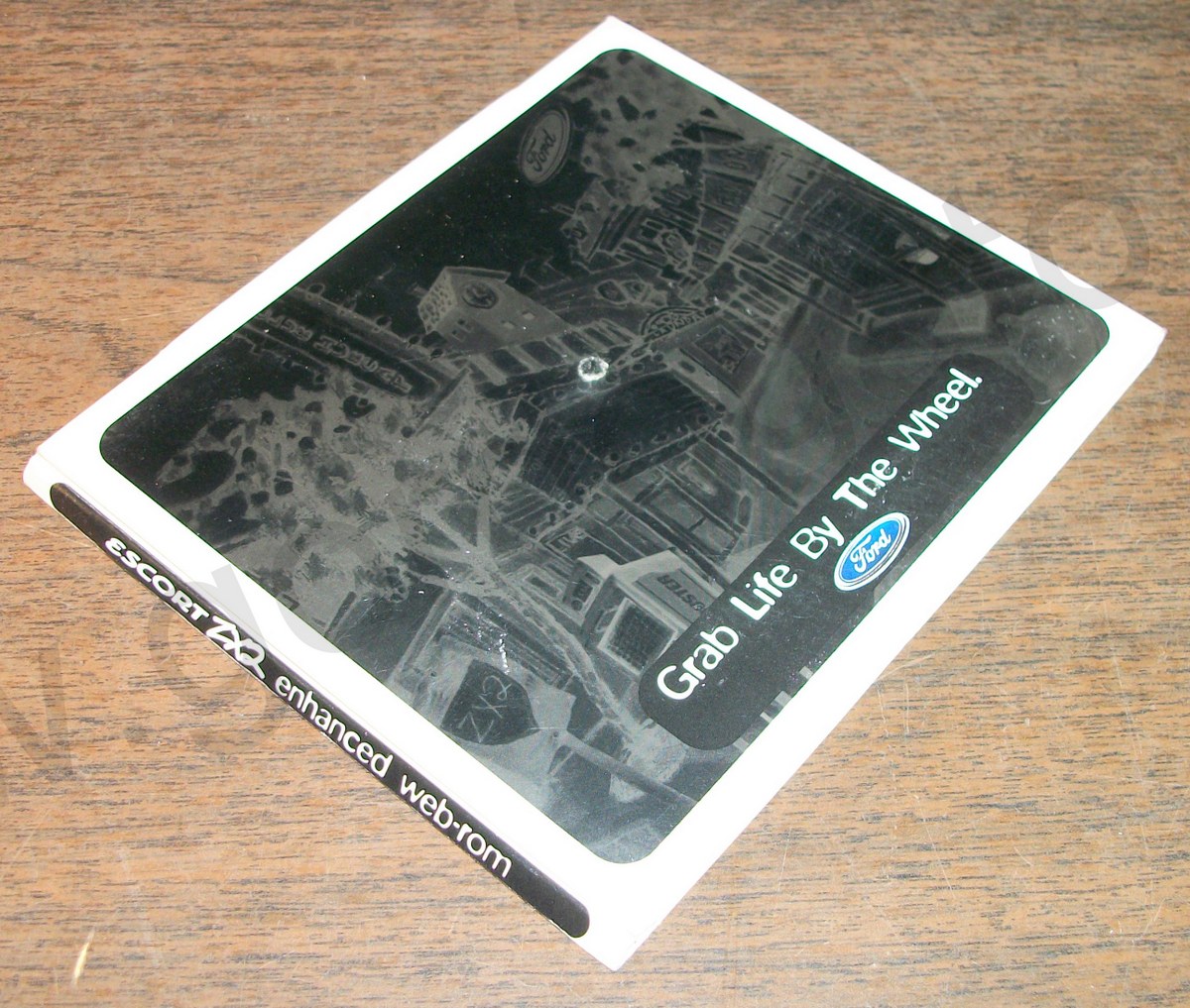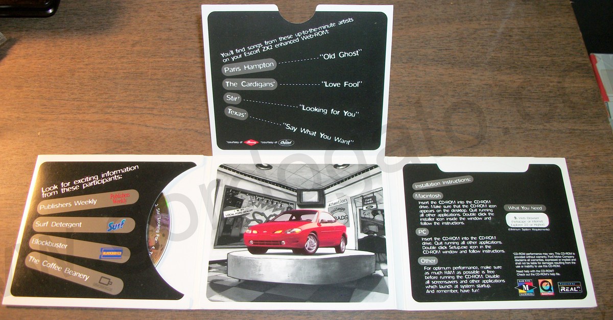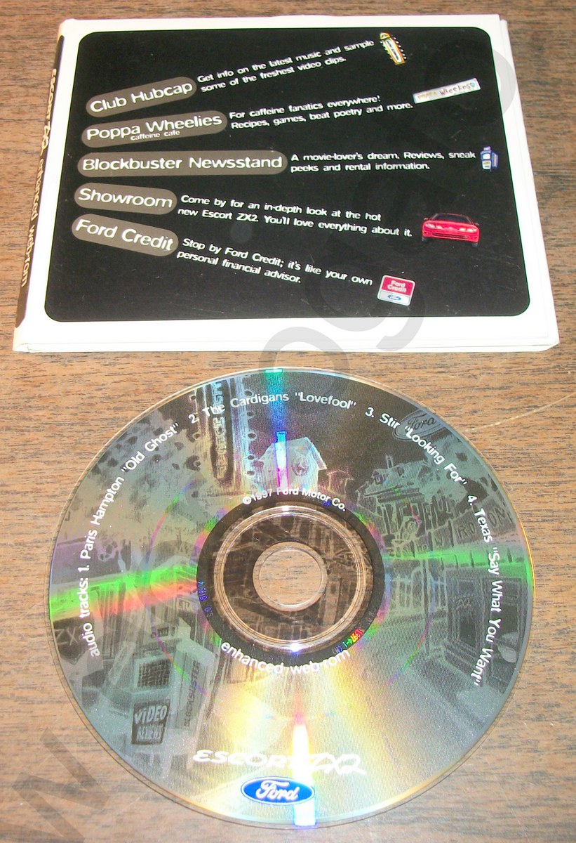 This is a promotional CD-ROM for the Ford Escort ZX2 from 1997 – It is in good used condition. There is a note from Brian Miller, Ford Division, Youthful Brand Manager. The CD-ROM requires a Pentium 75 MHz or higher for PC or Power PC with System 7.5.1 or higher for Macintosh.