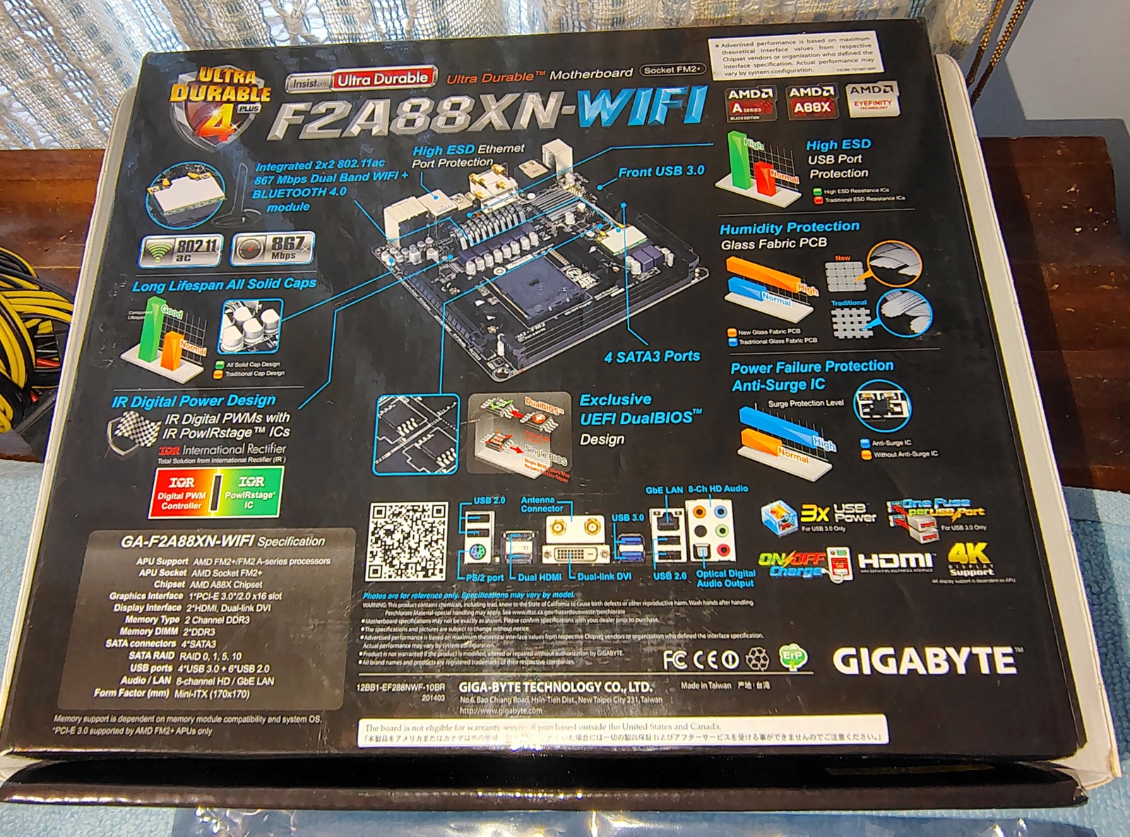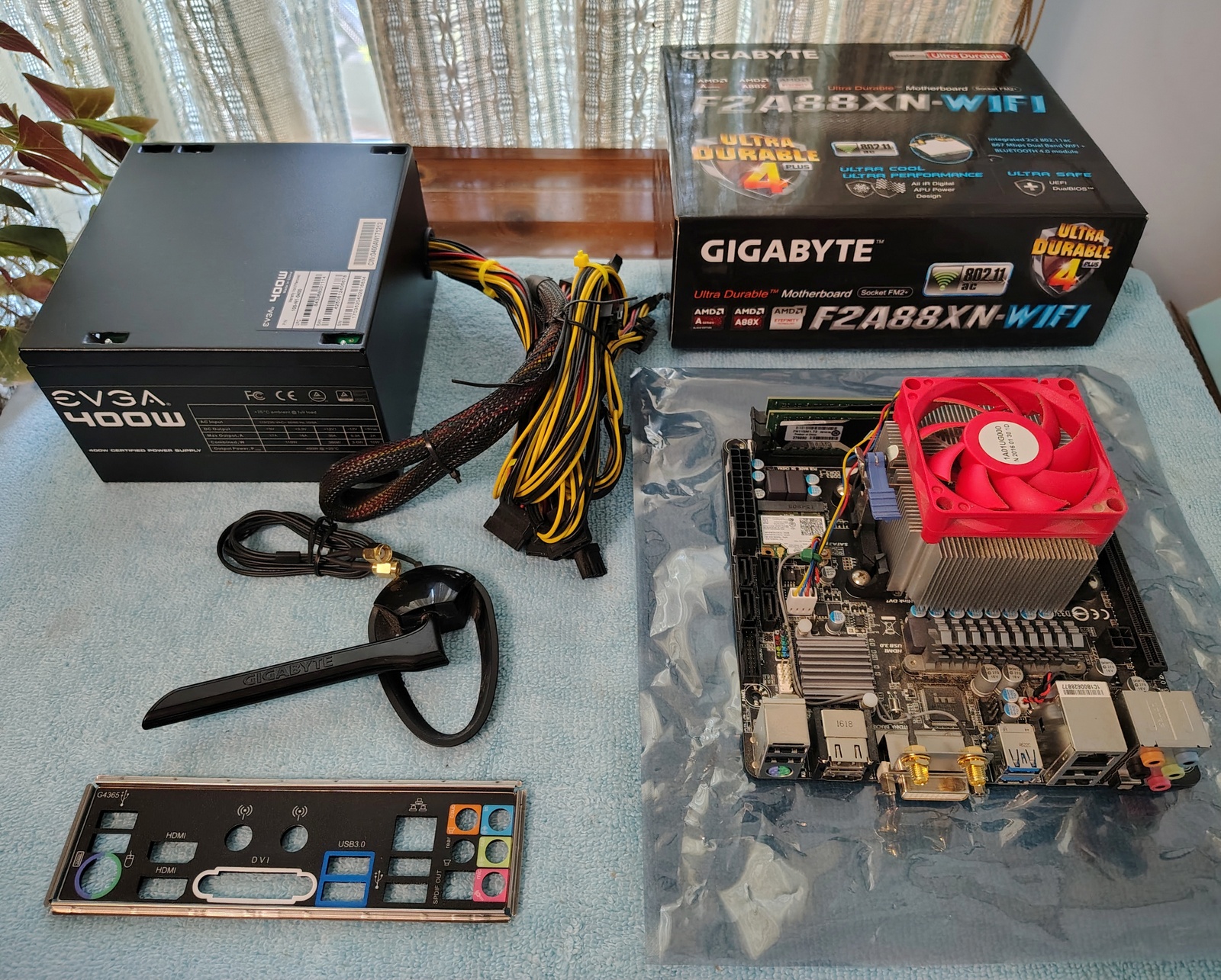 Up for sale is a Gigabyte GA-F2A88XN-WIFI Socket FM2+ ITX Motherboard with an AMD A10-7860K APU (CPU + Graphics) AND 16GB RAM (2 x 8GB Modules). This motherboard was put into service in February of 2018 and in June 2025 the system was upgraded to a newer, faster motherboard, processor, & RAM. So, we have this one left over. Hope someone out there on the internet can put it to use. This originally had Windows 8 Pro on it and had been upgraded to Windows 10 Pro during the free upgrade period, so you might be able to activate Windows 10 Pro on it without a product key, but NO WINDOWS PRODUCT KEY is included. The power supply is included in the listing, but it has a capacitor rattling around inside of it – LOOK AT THE PICTURES. However, it was still powering on the system ok, but we replaced it with a new one. We also used a PCIe NVMe SSD with this system and was able to boot from it just fine – NOT INCLUDED. Good luck!