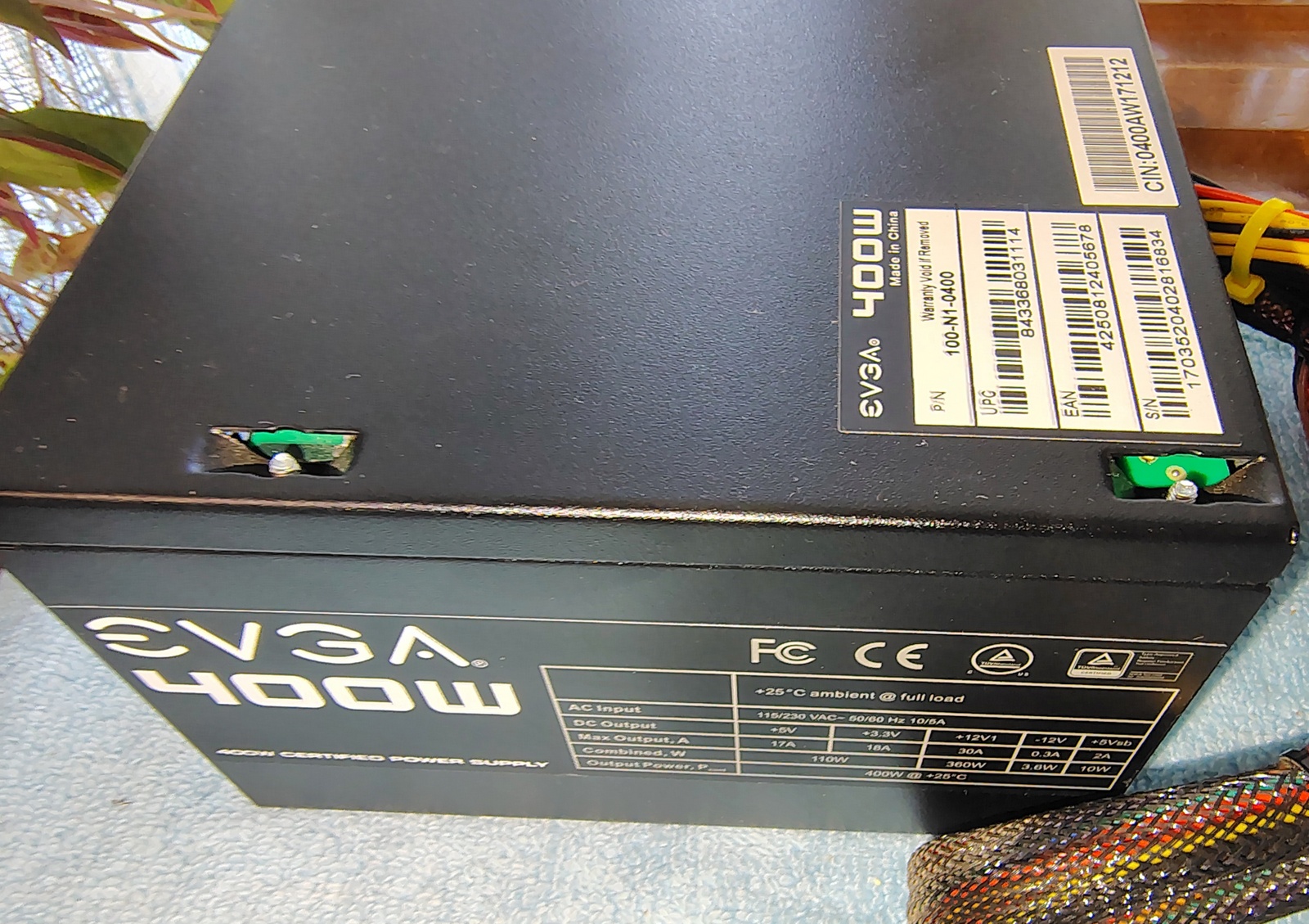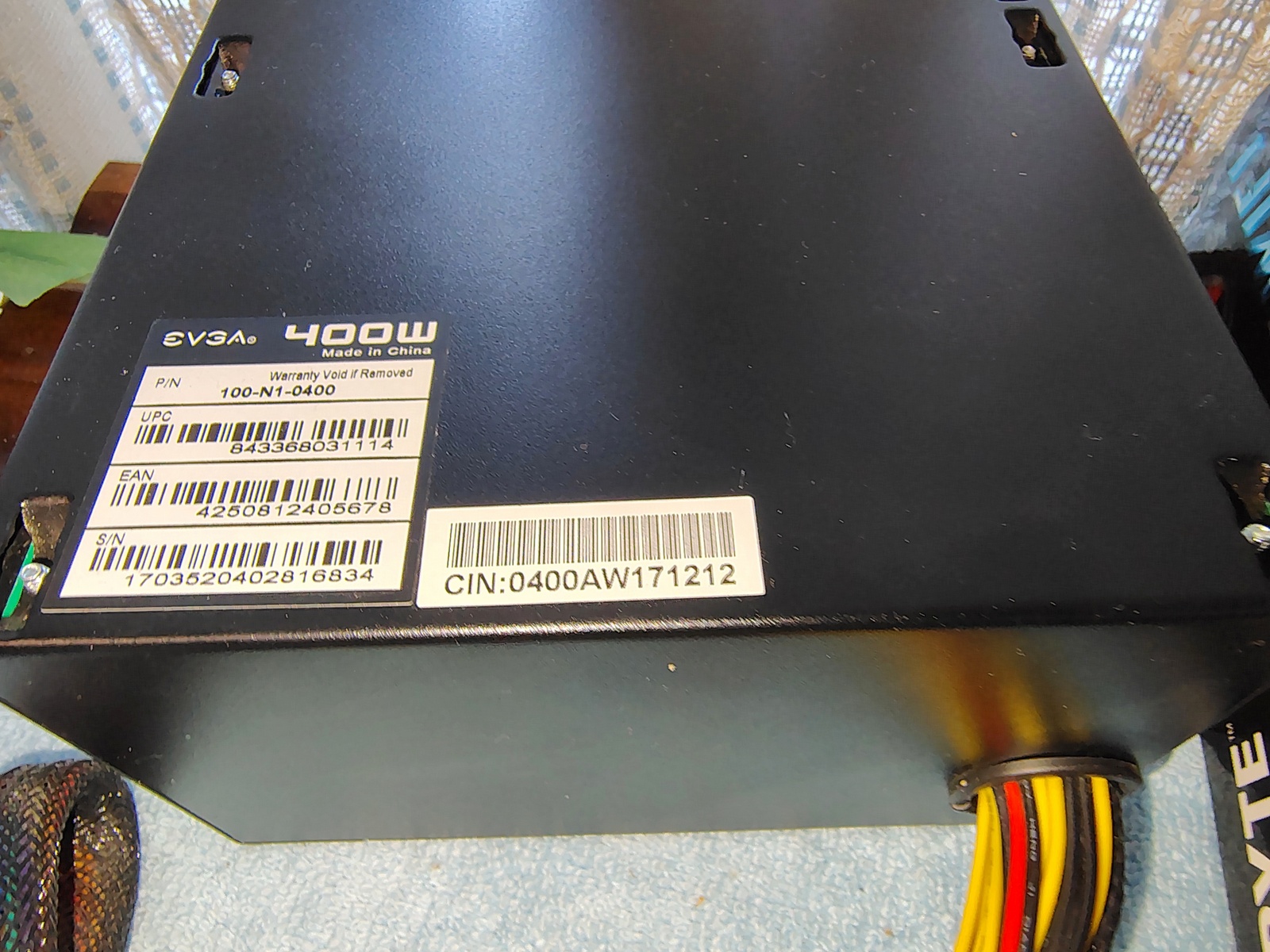 - 1 x EVGA 400W Power Supply – 100-N1-0400 – Has a capacitor rattling around inside and needs to be repaired, but did power on the computer just fine.
