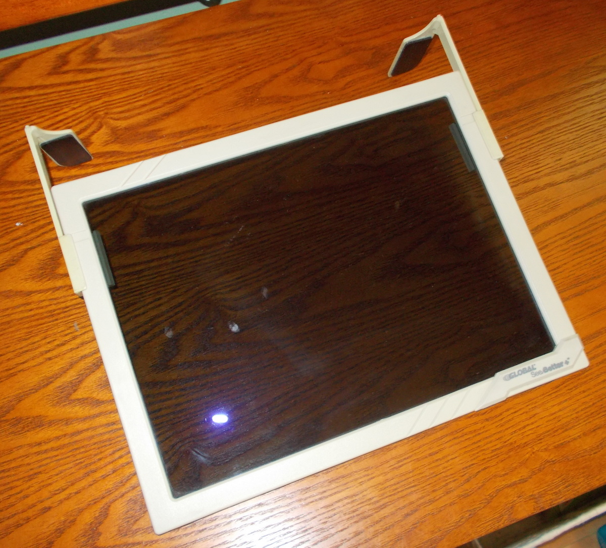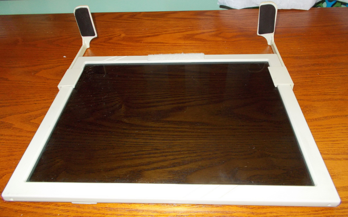 This is for reducing the glare on older CRT type monitors. This one measures about 12.75 inches diagonally and will probably fit most 12-13 inch CRT monitors / terminals. The arms are adjustable and removable- see picture. Made in USA. The screen is glass. Global See/Better+
