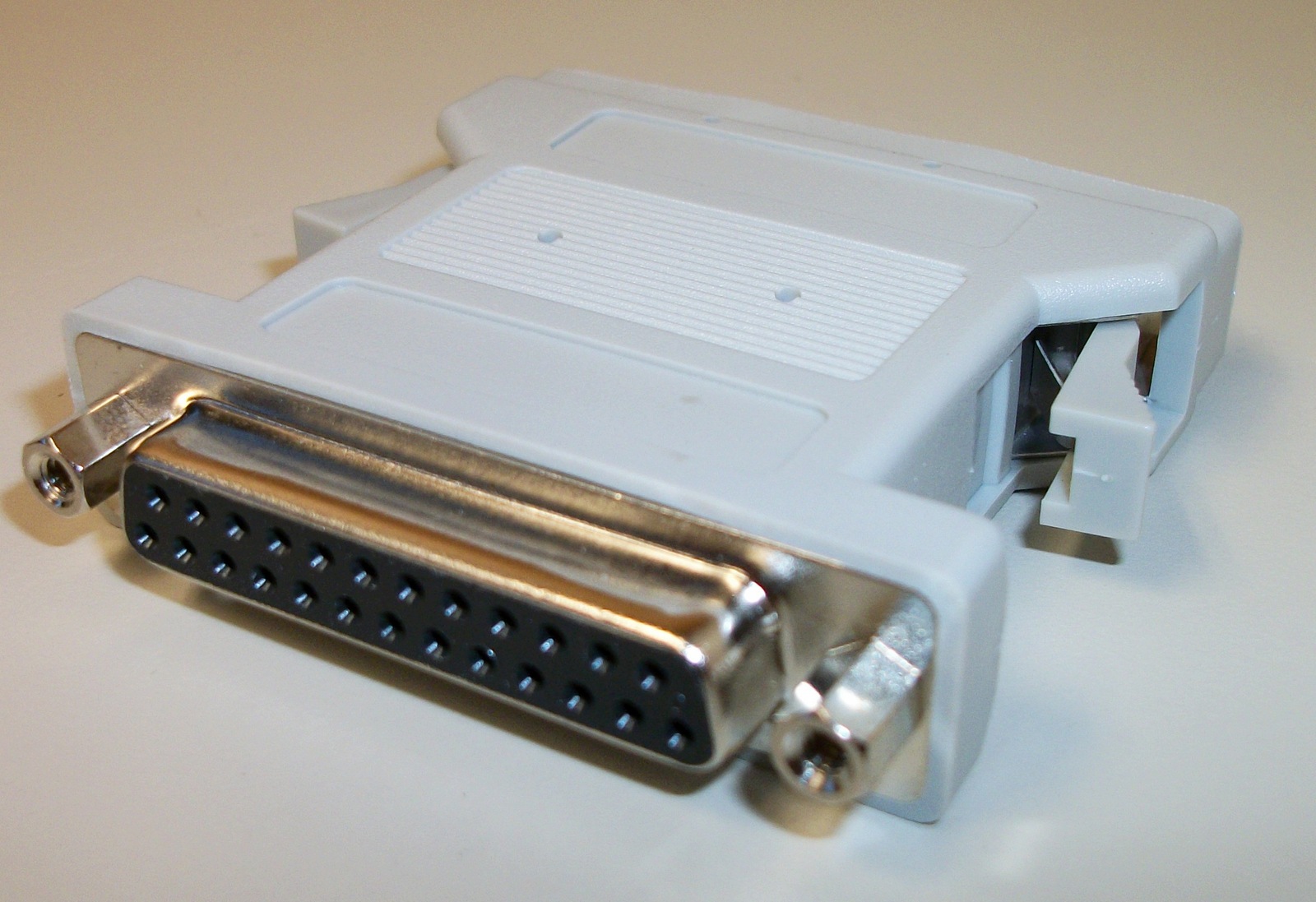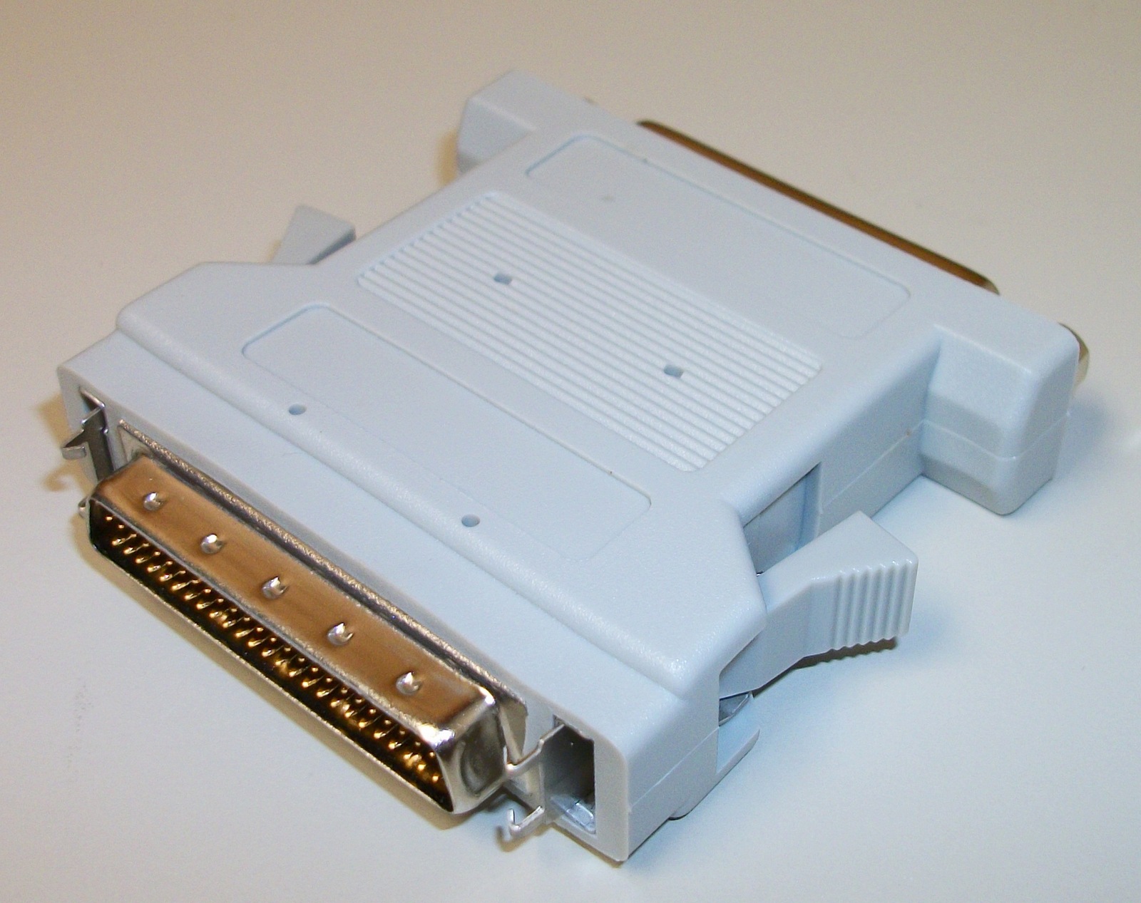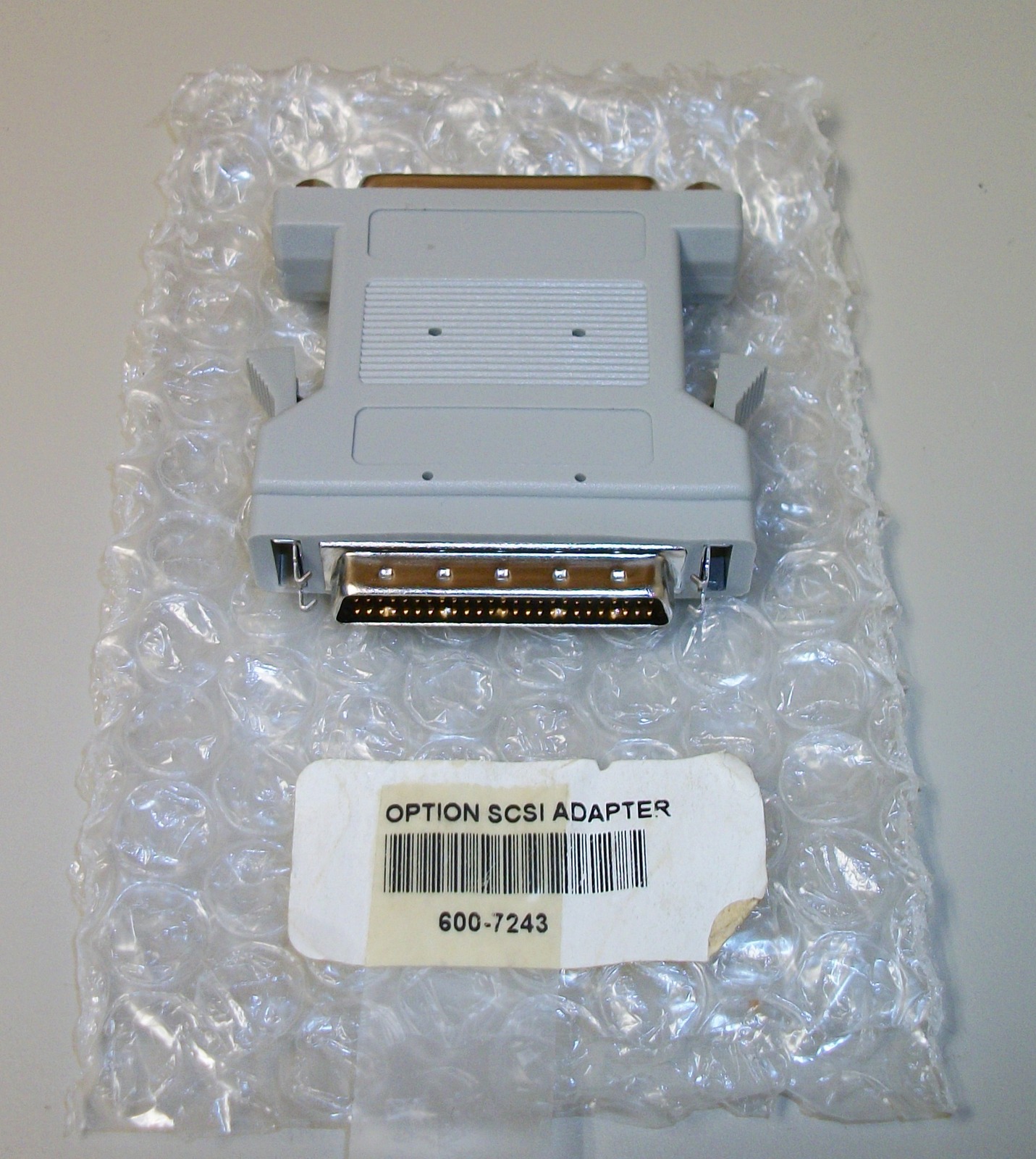 This is for adapting your 50-pin HD SCSI cable to a DB-25 pin cable – it has a DB-25 pin female connector on one end and a male HD DB-50 pin connector on the other. We believe it was manufactured by Sun.