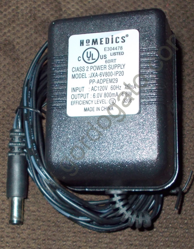 Input: 120VAC 60Hz 75mA, Output: 6V 800mA, 4.8W Model No.: JXA-6V800-IP20, SLD81308, Made in China. Barrel type plug.