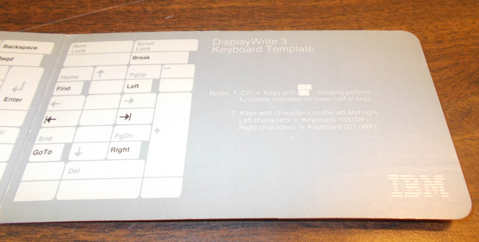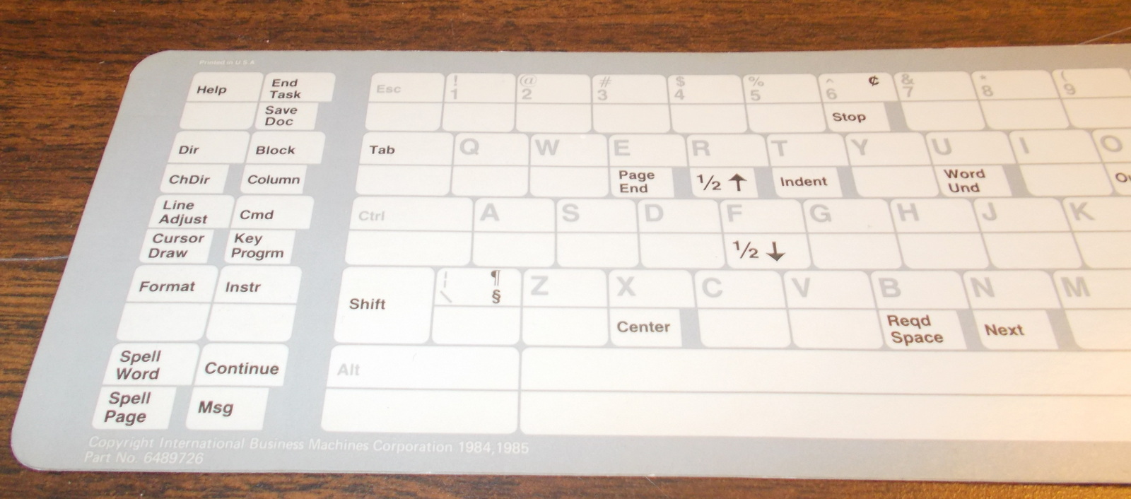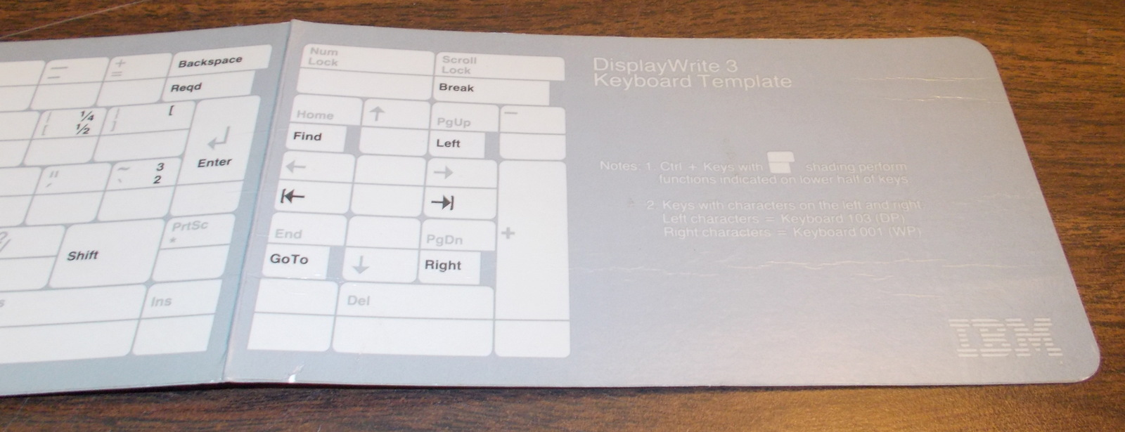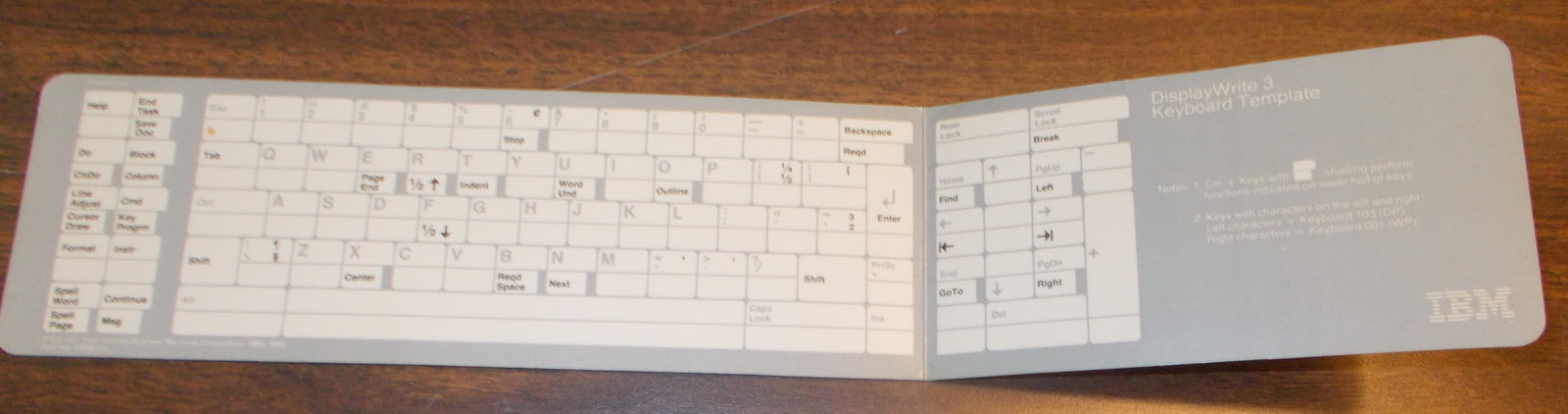 This is the keyboard template for DisplayWrite 3 by IBM from 1985. This is made out of cardboard and has a handy quick reference for keys used in IBM DisplayWrite 3. It is reversible and seems to have the same thing printed on the front and back. It also has some light creases – see pictures! Printed in USA – 1985. Part No. 6489726.
