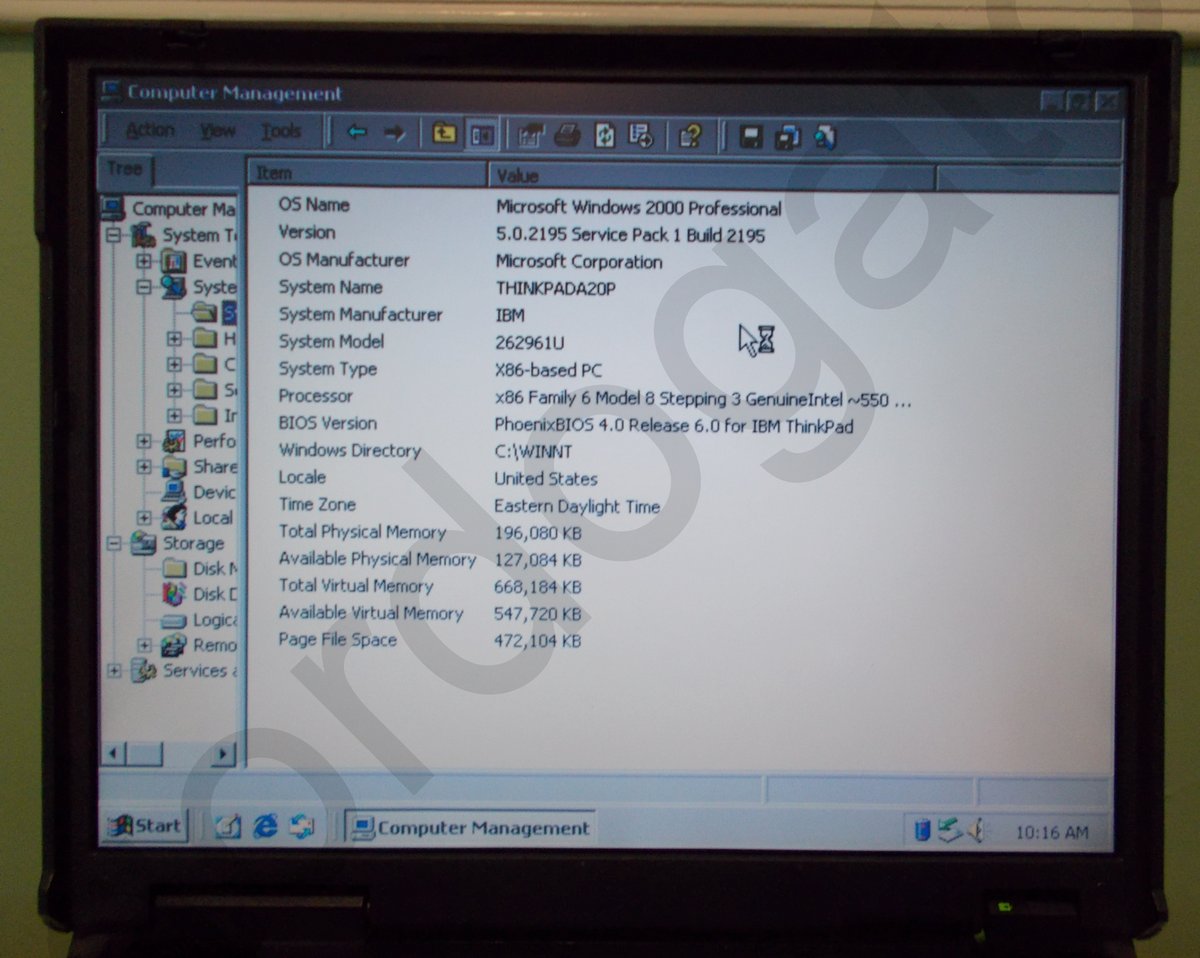 Up for sale is an IBM Thinkpad A20p laptop notebook PC. This originally had Windows 98 on it as there is a Windows 98 product key on a sticker on the bottom. The hard drive was wiped with DBAN and Windows 2000 was installed onto the laptop cleanly from the built in optical drive. It still needs some of the device drivers installed – ‘unknown device’ and the video drivers – these device drivers are NOT included and you will need to provide your own. The laptop does not remember it’s date and time and needs a new BIOS battery – you have to set the date and time every time you boot. The battery is close to two decades old and does NOT hold a charge. And, the AC adapter is NOT included – you will need to provide your own. If you would like to save on the shipping, you’re welcome to schedule a time to come and pick it up.