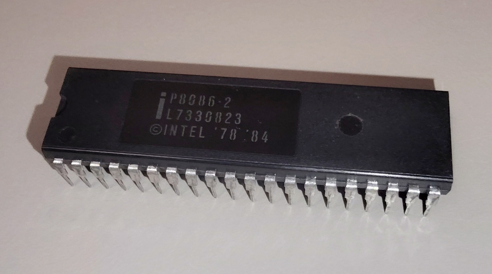 Up for sale is an Intel P8086-2 CPU in a black plastic 40-pin package; It is in used condition.