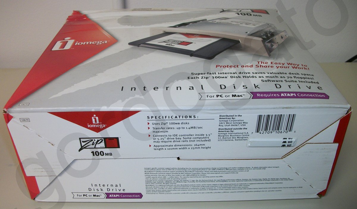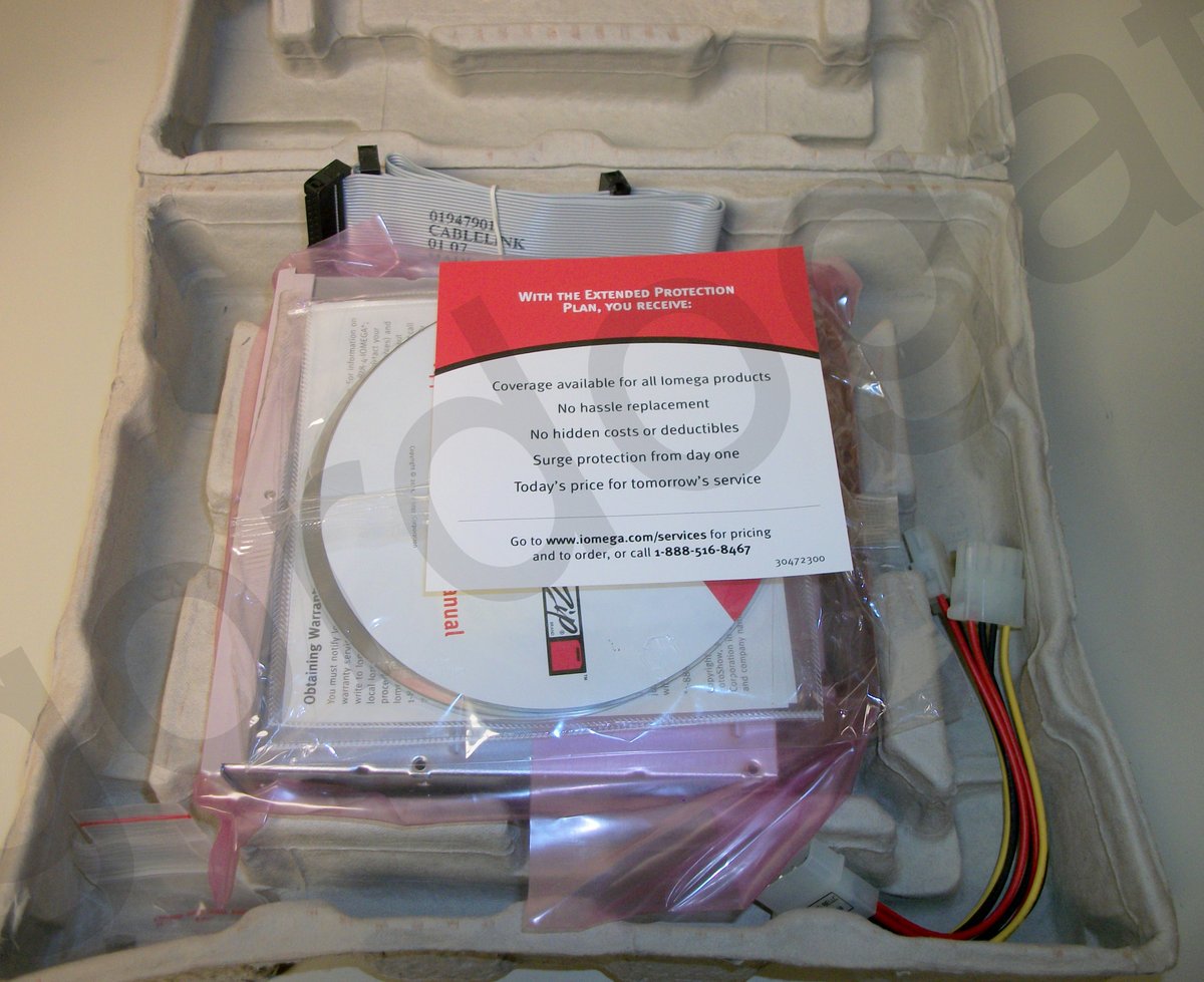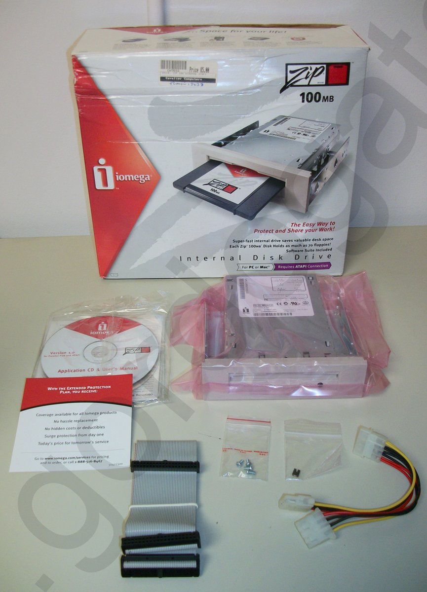 Up for sale is an original Iomega internal ATAPI zip drive in new, old stock condition. This was purchased years ago and never installed. The box is a bit crushed on the top – see the pictures.