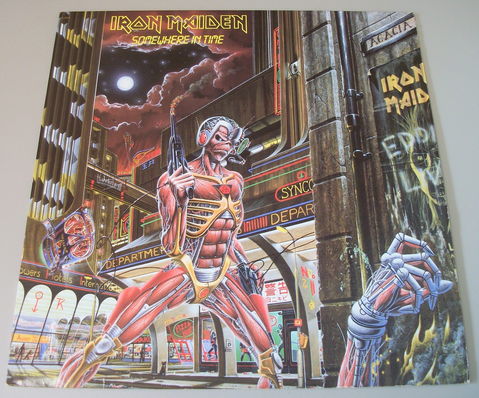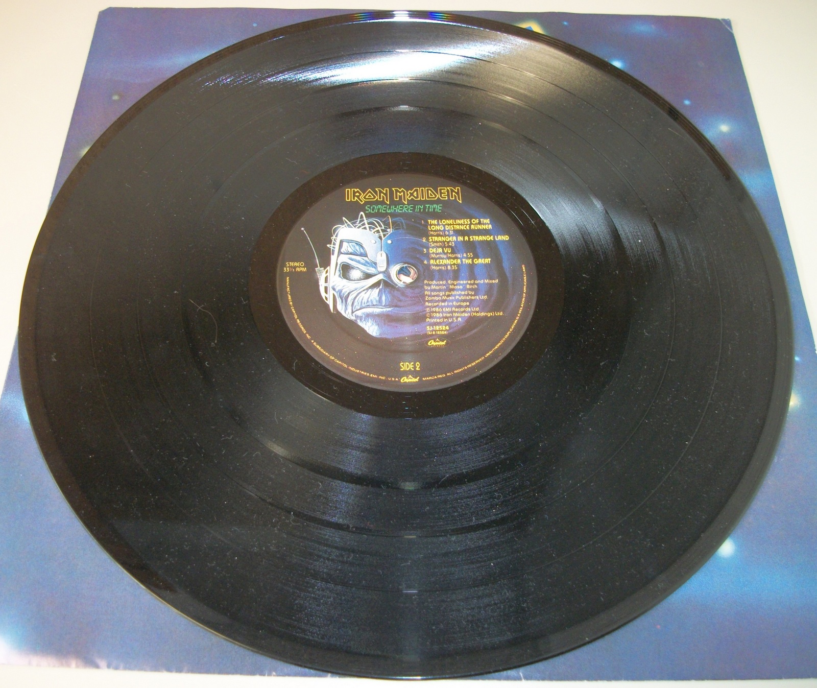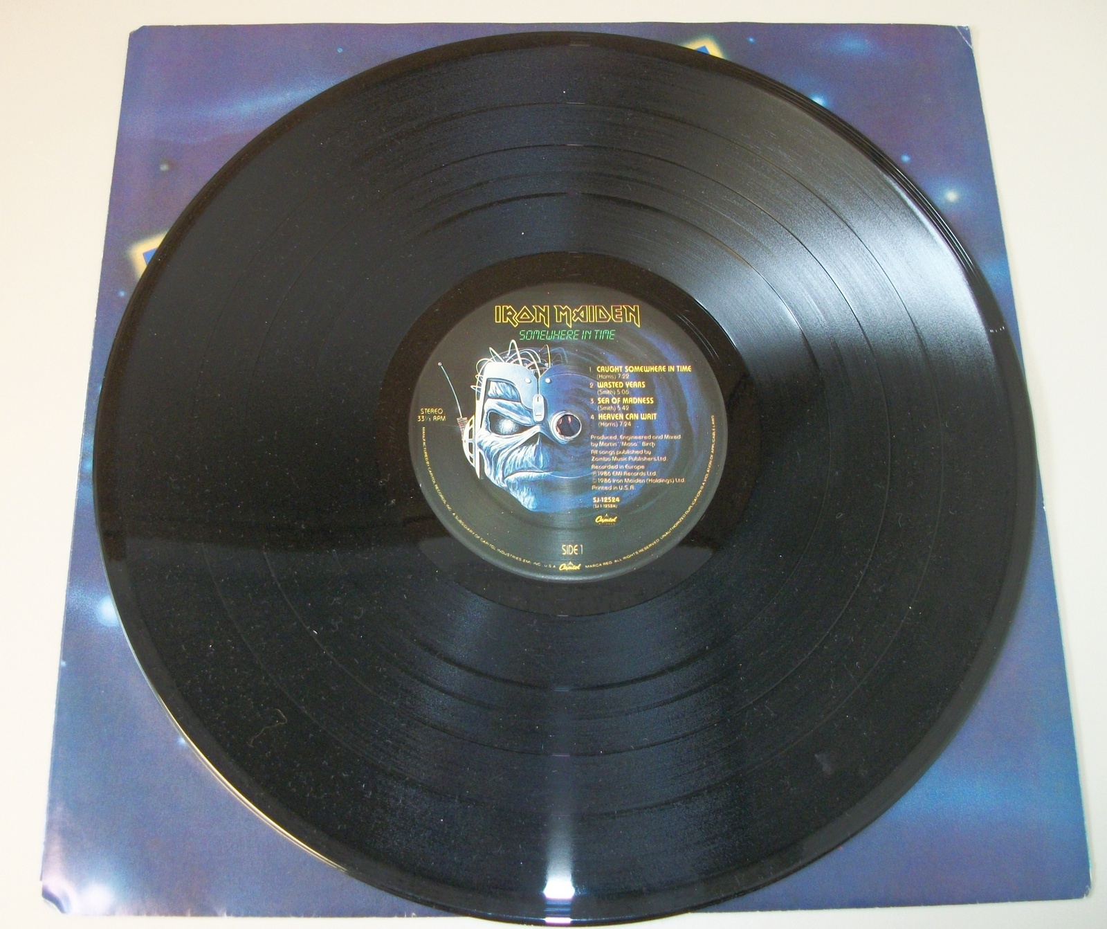 Up for sale is Iron Maiden’s Somewhere In Time album on 12″ vinyl. LOOK AT THE PICTURES! Excellent used condition with minor wear, record breaking through the sides of the insert.