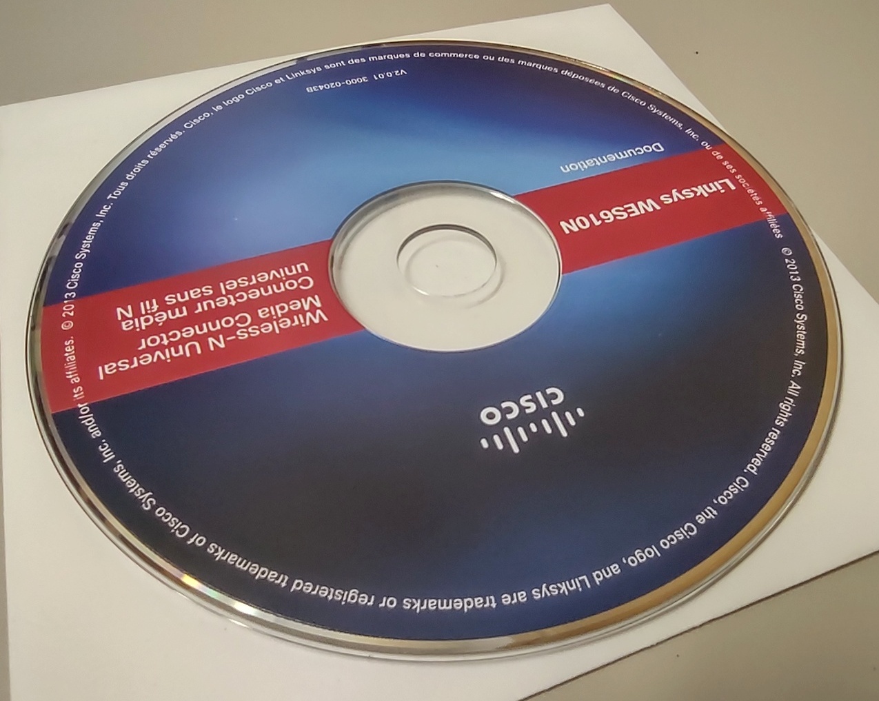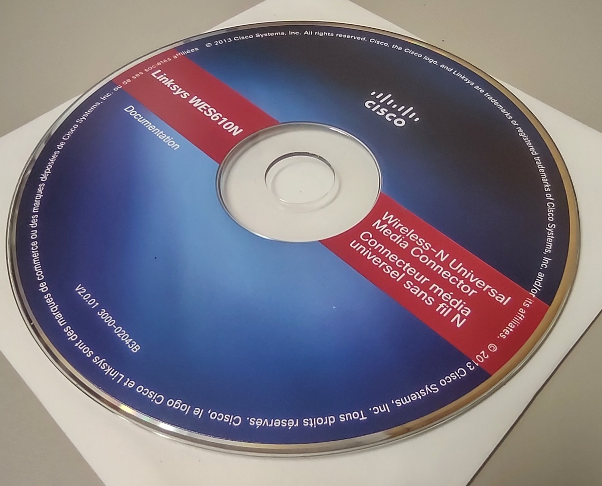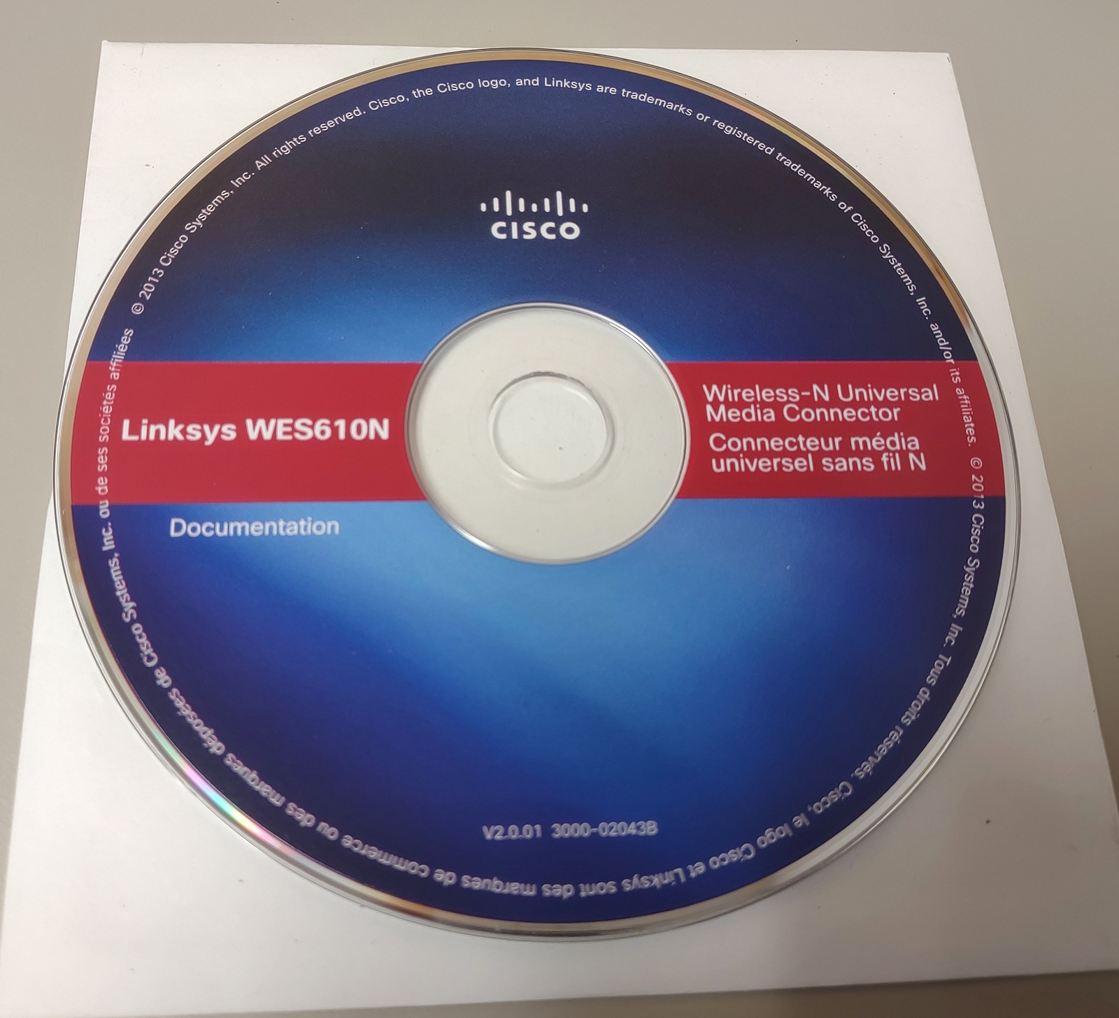 Up for sale is a downloadable ISO image file of the documentation CD which originally came with a Linksys WES610N Wireless-N Universal Media Connector (wireless bridge) from 2012. You do NOT get the disc, only a download of an image file of the disc. Just download the zip file, extract the ISO file, and burn the image. The download link is set to expire after 7 days. File size of the .zip file for download is 8.46 MB (8,873,649 bytes) and the file size of the uncompressed .iso image file is 26.4 MB (27,721,728 bytes).