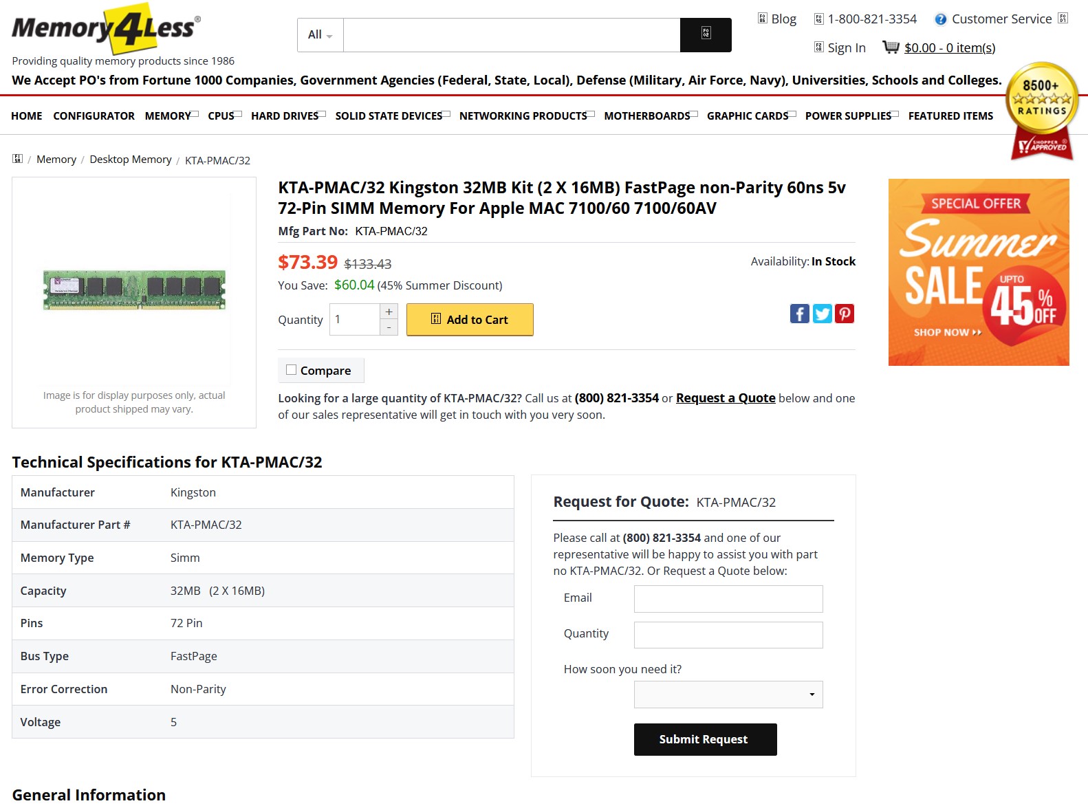 Up for sale is a 16MB 72-pin SIMM of Kingston 60ns Memory RAM. We found this old module in our old computer parts drawer and are now offering it on the internet in the hopes that it can find a loving home in your old Mac parts drawer! We don’t know the functional status of this module, but it looks to be in good physical condition. It’s sold AS-IS for a collectible only as it is pushing 30 years old! According to the internet, this was part of a 2 module kit – 32MB total for Apple Power Macintosh 7100/60 and 7100/60AV. Please check with the manufacturer of your computer for compatibility BEFORE you make your decision to purchase. You get one 16MB 72-pin module from the 1990s.