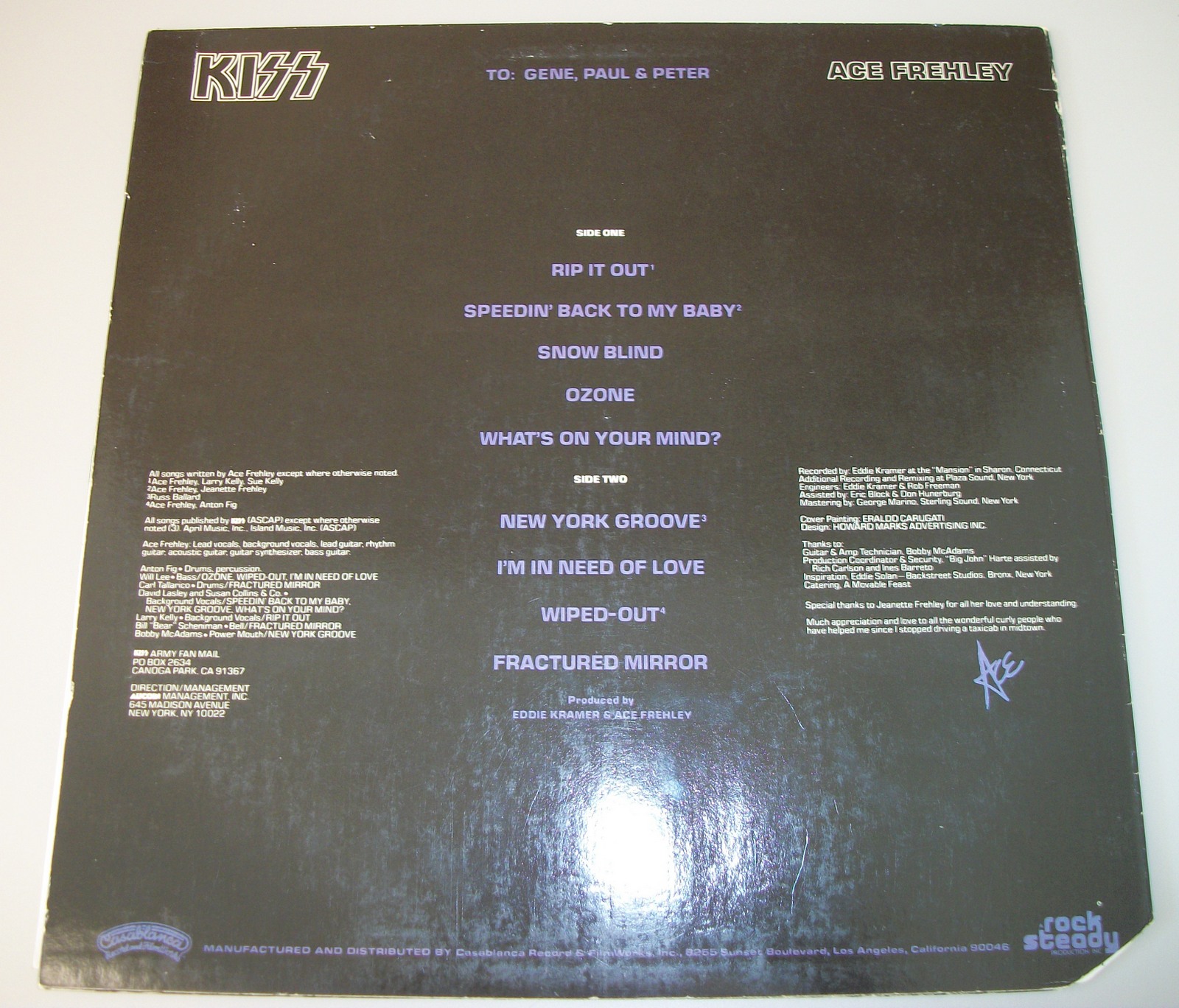 Up for sale is Ace Frehley’s solo album on 12″ vinyl. LOOK AT THE PICTURES! Good used condition with some wear, corner is clipped, the record is breaking through the sides of the insert – SEE PICTURES!