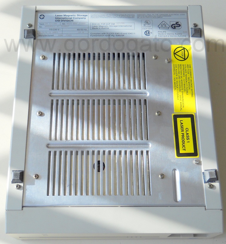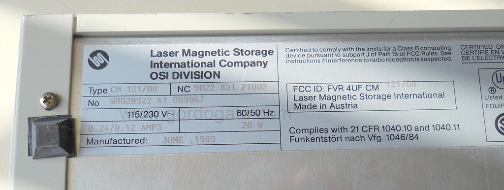 Laser Magnetic Storage International OSI Division CM 121/00 Optical Drive 1989. What you see in the pictures is what you get. This is a Laser Magnetic Storage International OSI Division CM 121/00 Optical drive. It was manufactured in June 1989 and has some sort of interface plug which we don’t recognize. We powered it on and the green light came on – this is all the testing we’re able to do because of its age and since we don’t have any media for it, much less any way to connect it to a PC. So, this is sold as-is for parts or a collectible only.