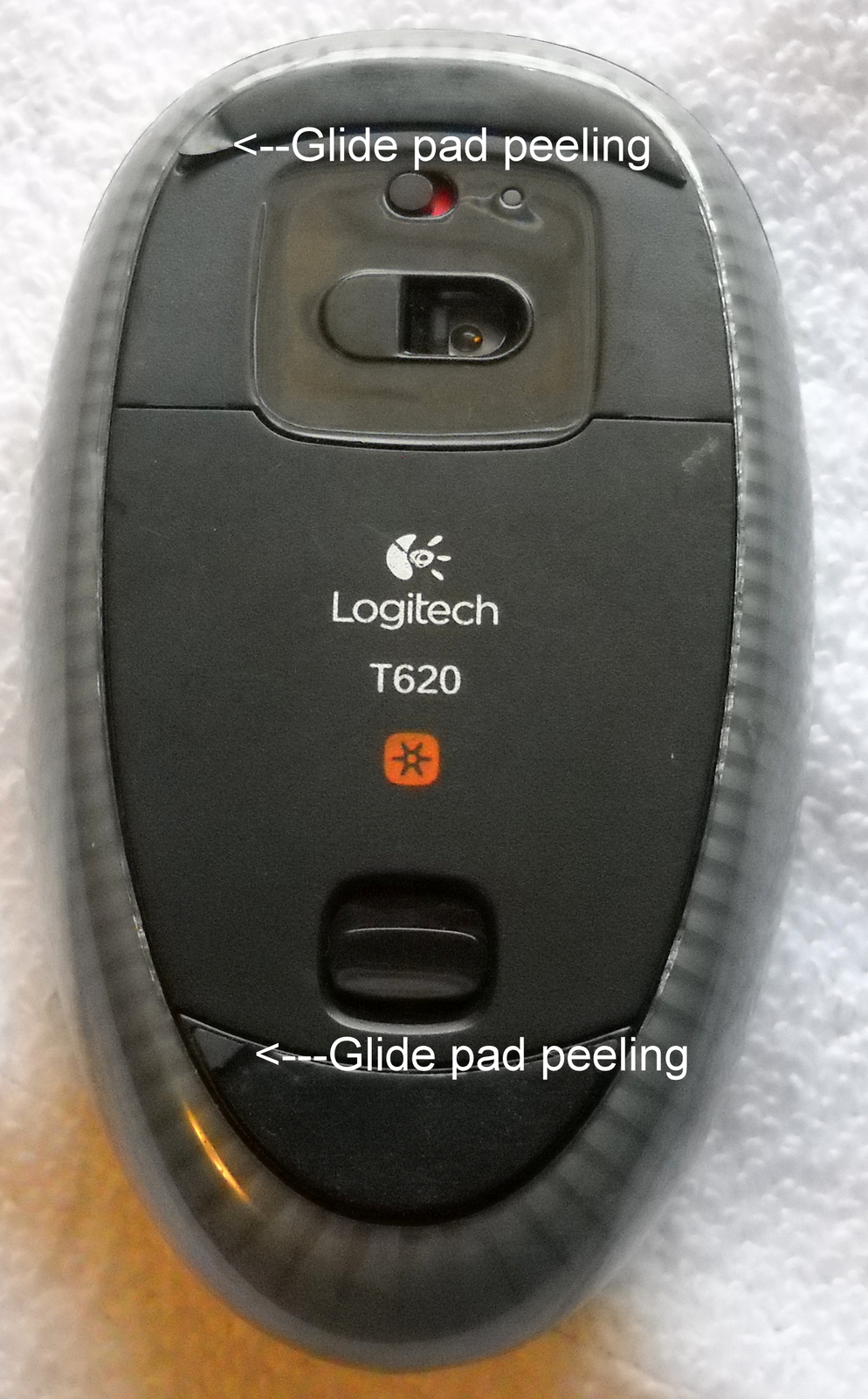 Up for sale is a good used Logitech T620 USB wireless touch mouse. This mouse has some wear / peeling on the glide pads – SEE PICTURES!