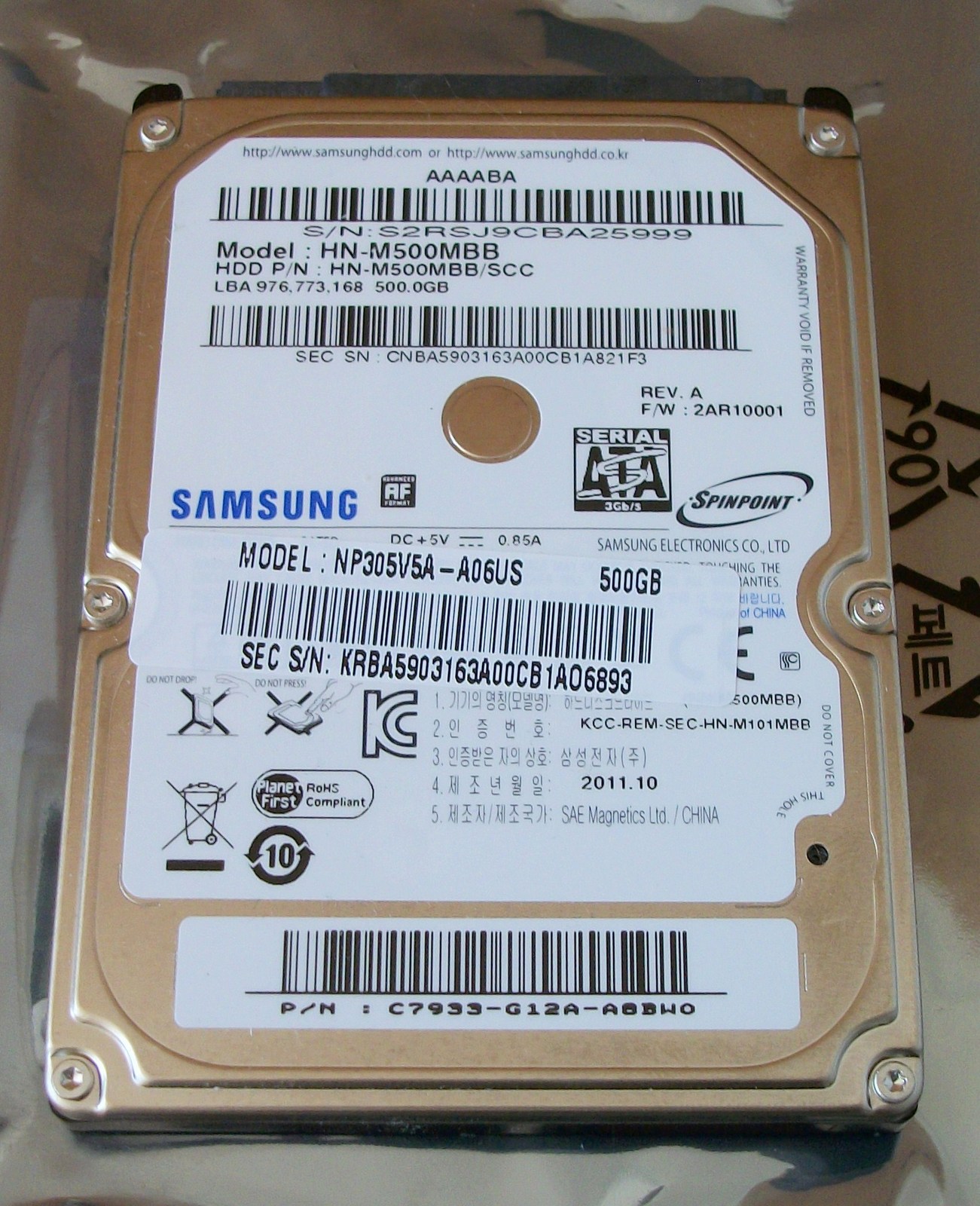 Drive #3: Samsung HN-M500MBB 500GB Notebook Laptop 9mm 2.5″ SATA Hard Disk Drive Oct 2011