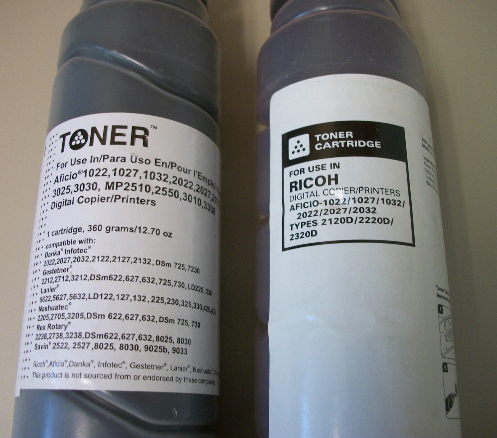 Up for sale is a lot of 2 new, old stock compatible (NOT OEM) toner for Ricoh 1027 copiers. We hope someone out there on the interwebs can put them to use. These are left over from copiers past and were found in the desk drawer when we were cleaning it out. What you see in the pictures is what you get. Made in USA.