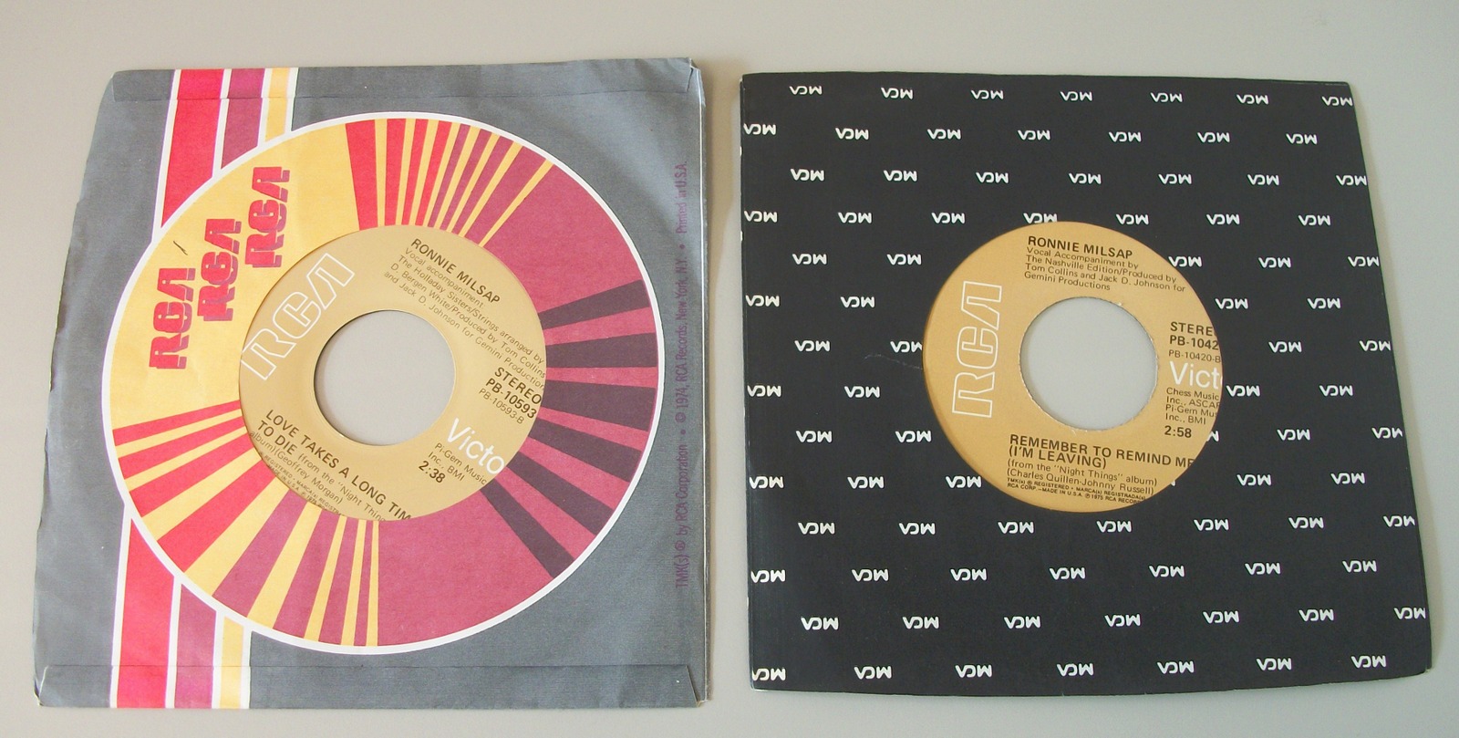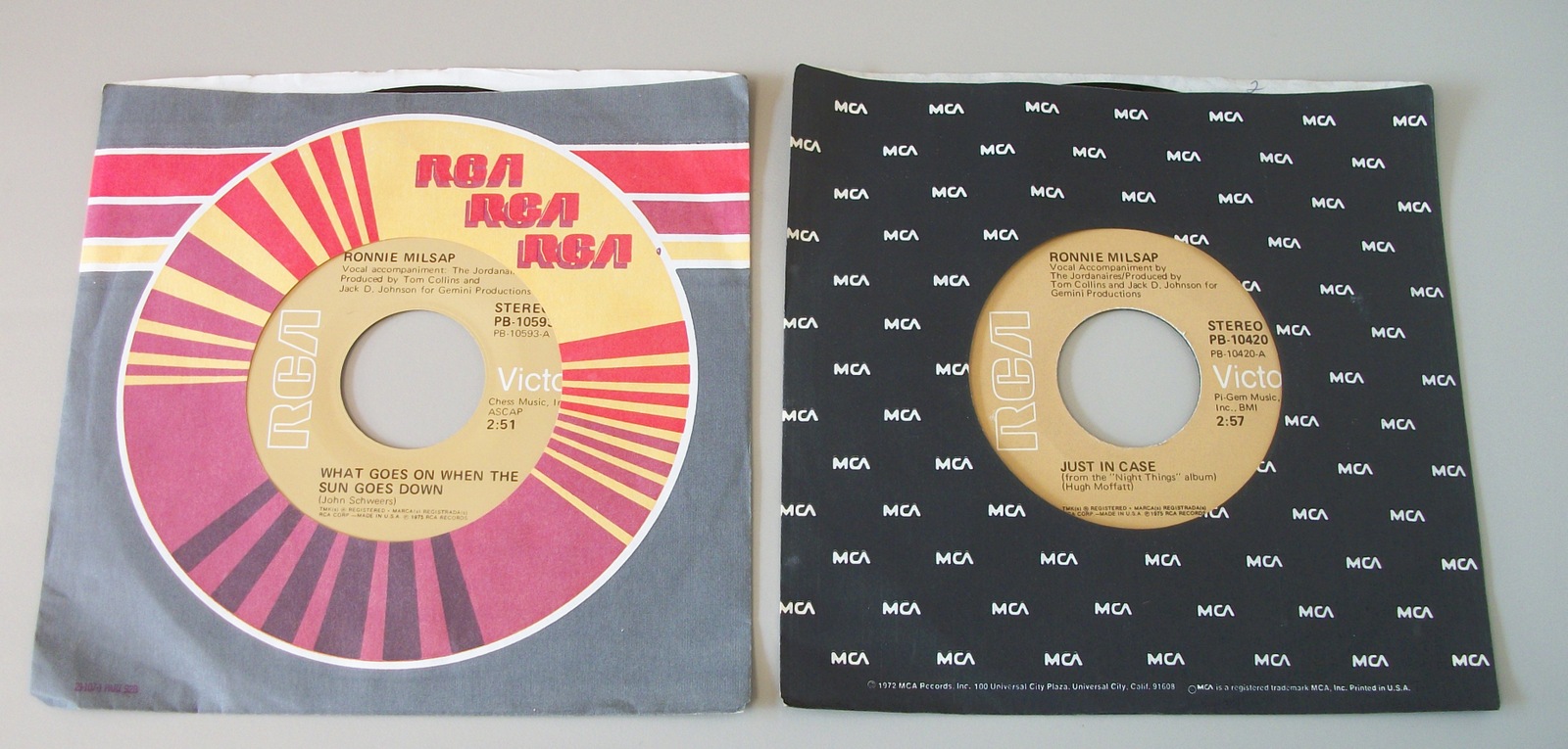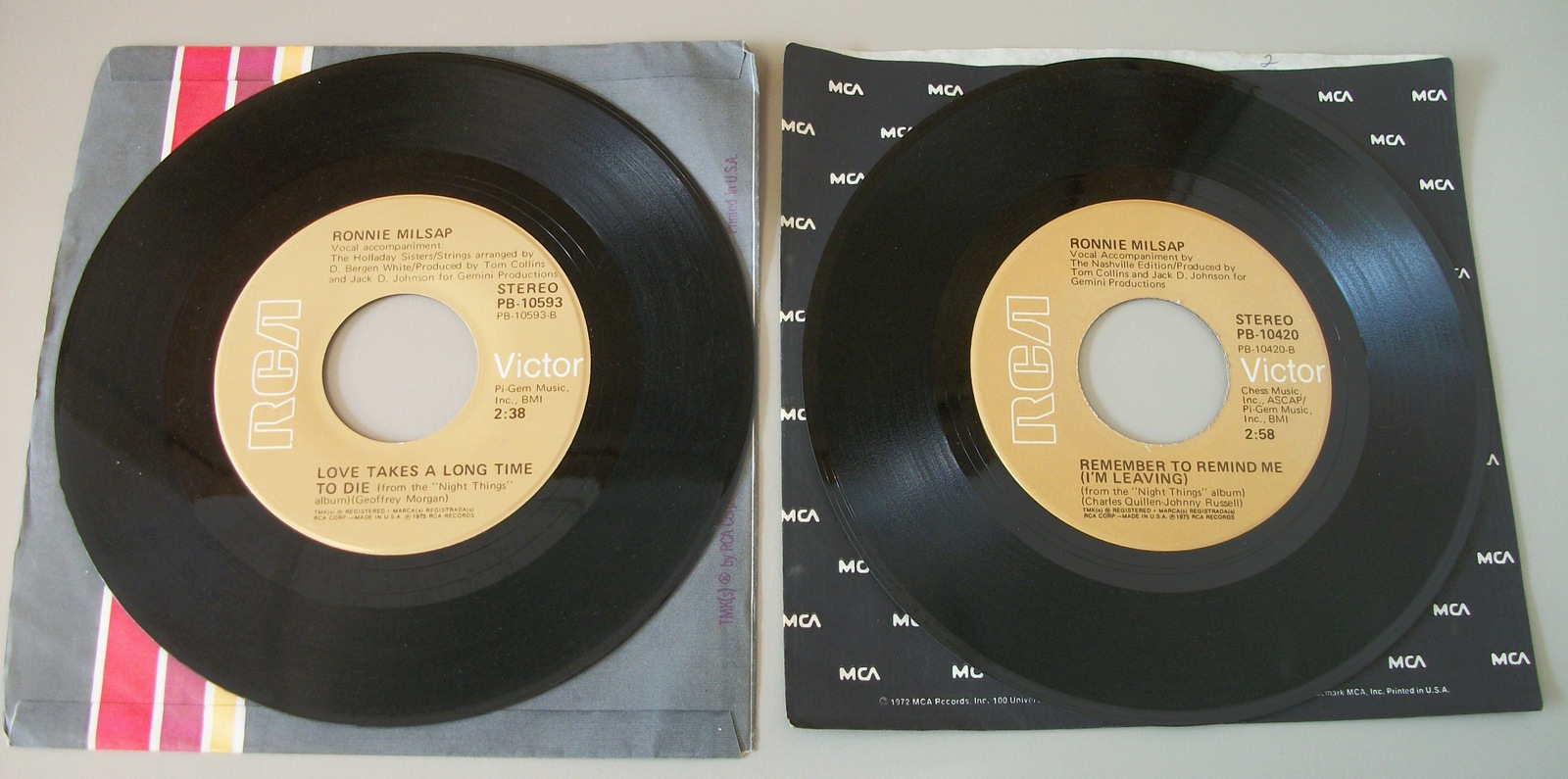 Up for sale is a lot of two of Ronnie Milsap’s 45 RPM records from 1975 on 7″ vinyl. LOOK AT THE PICTURES! Used condition, some wear around the edges and light creases. One has an MCA sleeve dated 1972, even though it is an RCA record from 1975 – see pictures! These are in pretty good shape for 45+ year old records.