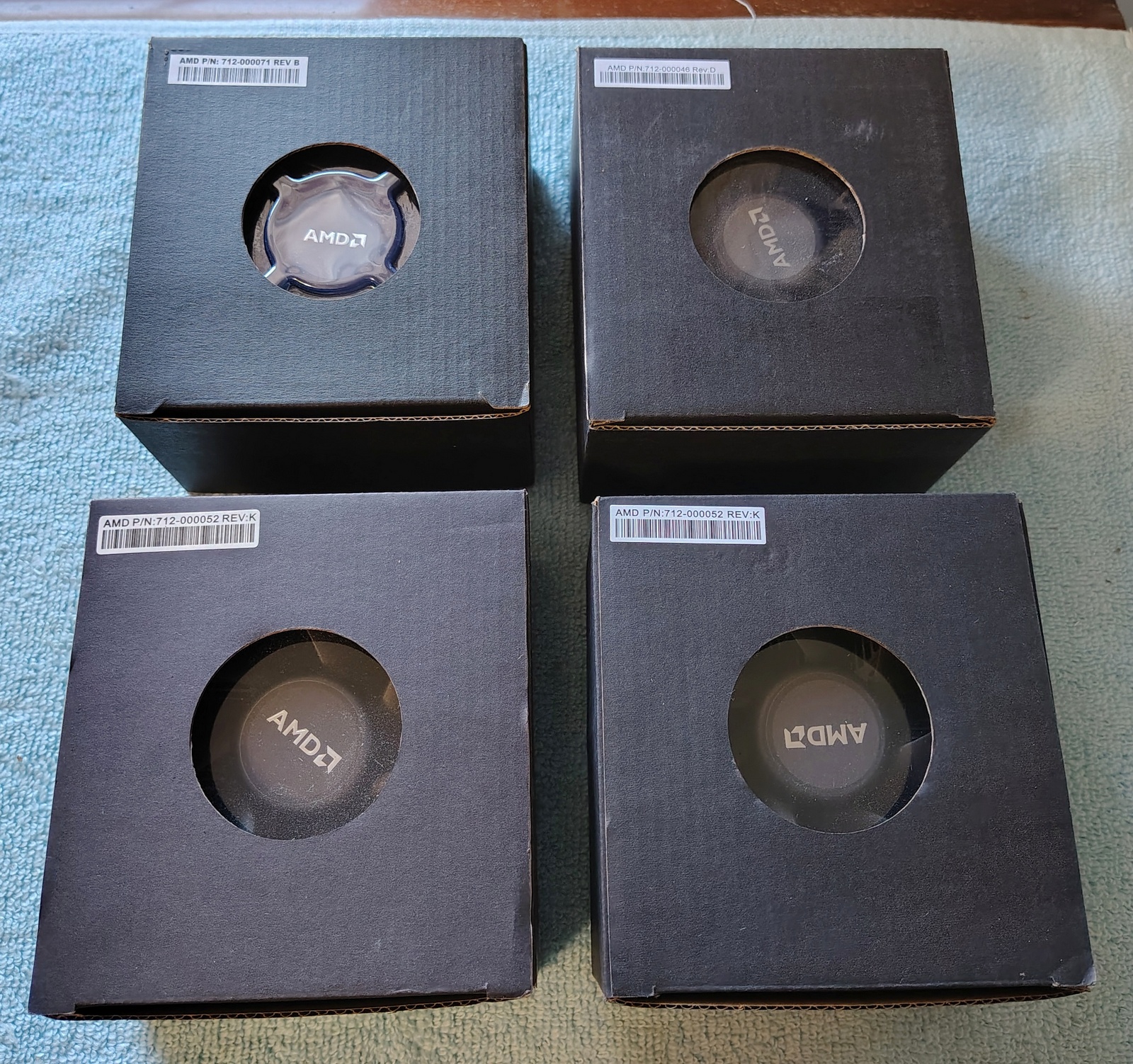 Up for sale is a lot of 4 AMD Wraith Stealth CPU coolers which came with Ryzen processors. These came with Ryzen 5 7600 processors. We built the systems that these processors went into with low profile cases and used aftermarket low profile coolers, so we have these left over. Two are AMD Part number: 712-000052 Rev. K, one is 712-000046 Rev D, and one is 712-000071 Rev B. The only difference we can really notice is that one has a circular application of thermal compound on the bottom and the others are square.