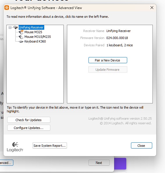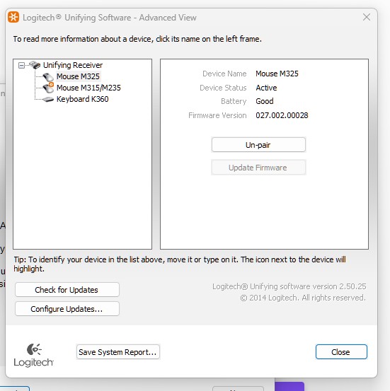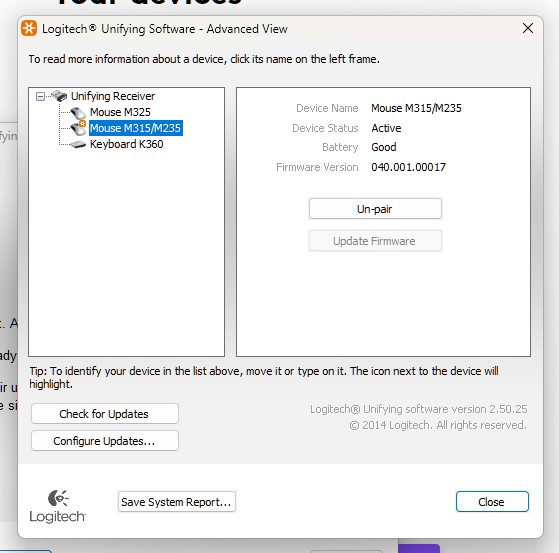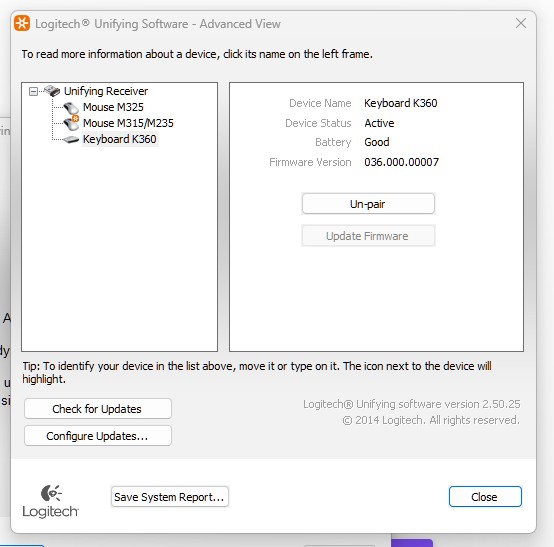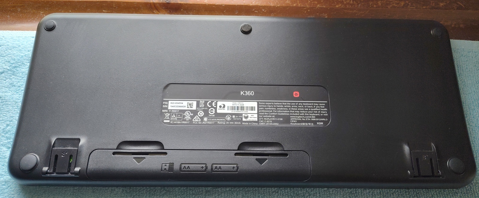 - Paired to the receiver in the battery compartment – Logi USB, not unifying, but the mouse is unifying capable.