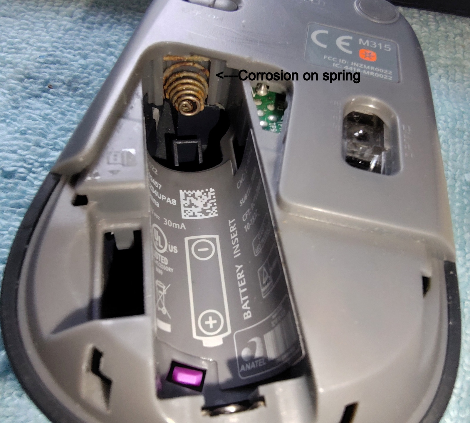 - There is some corrosion on the spring in the battery compartment from a leaky battery, but seems to make the connection with a new battery just fine.