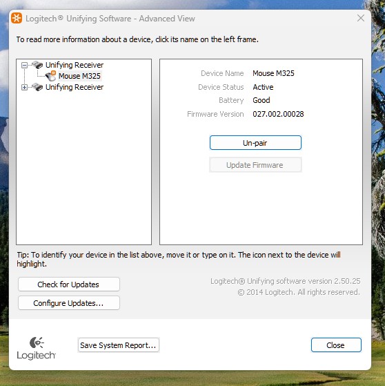 - Paired to the one Unifying receiver included inside of the black M325 mouse