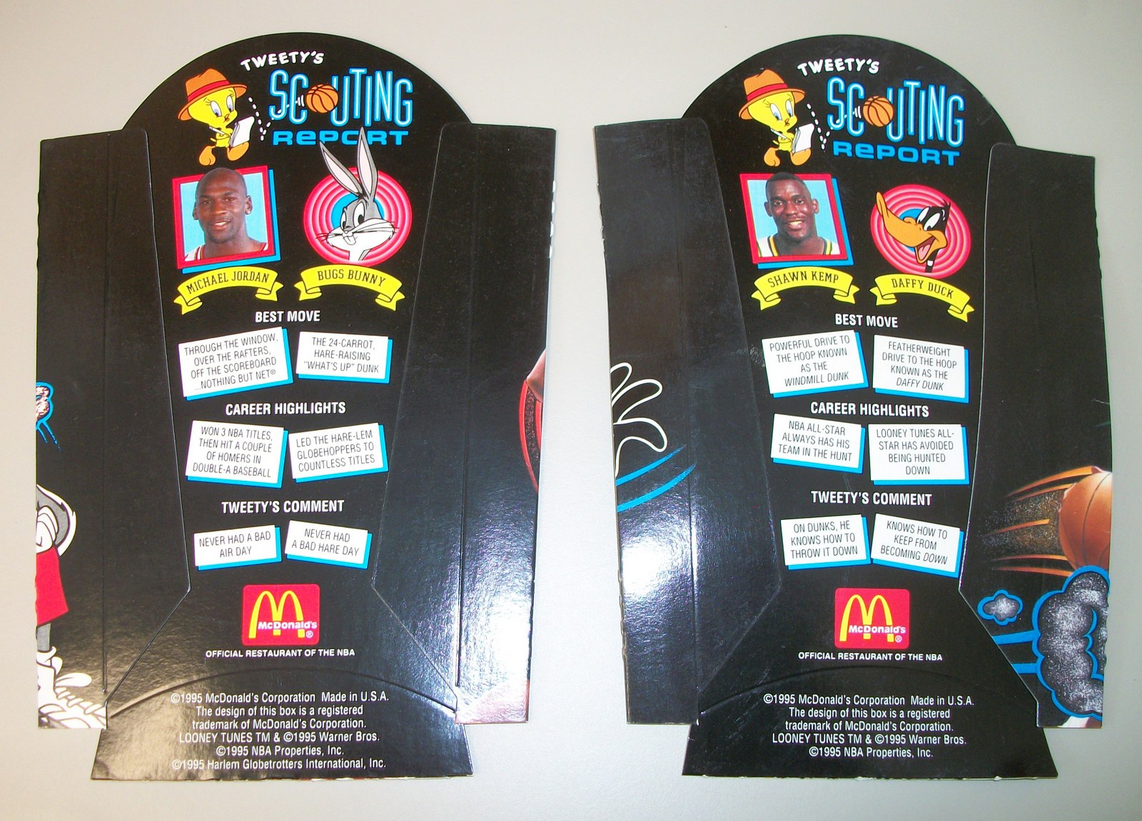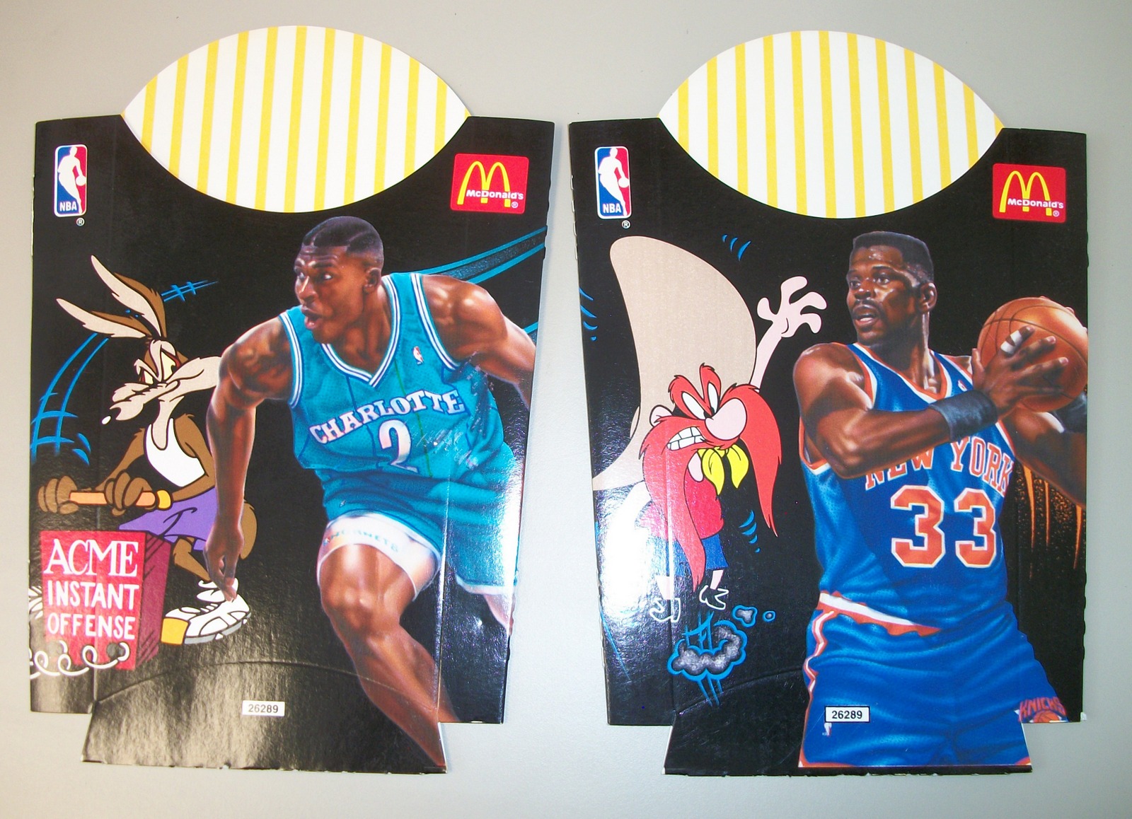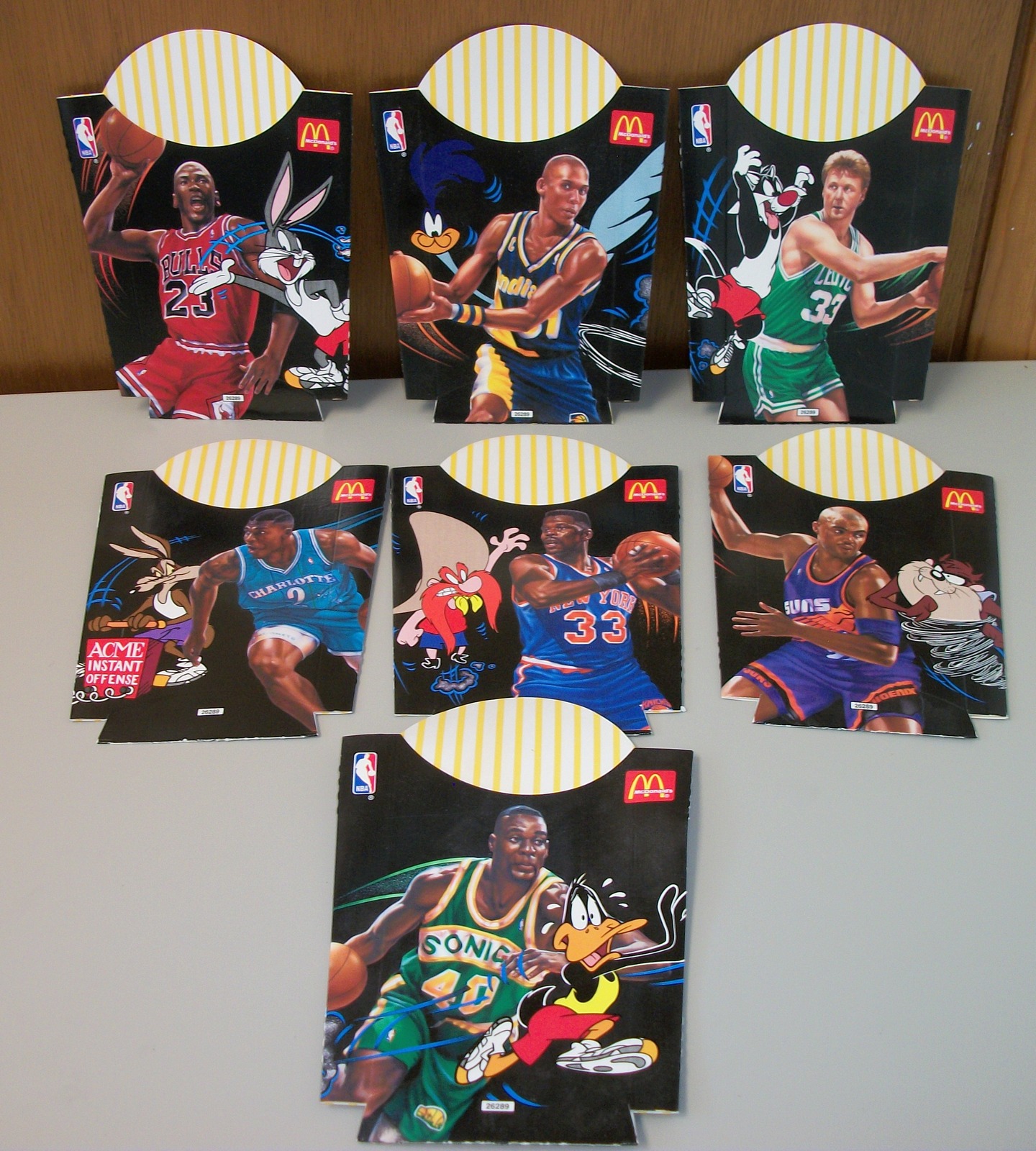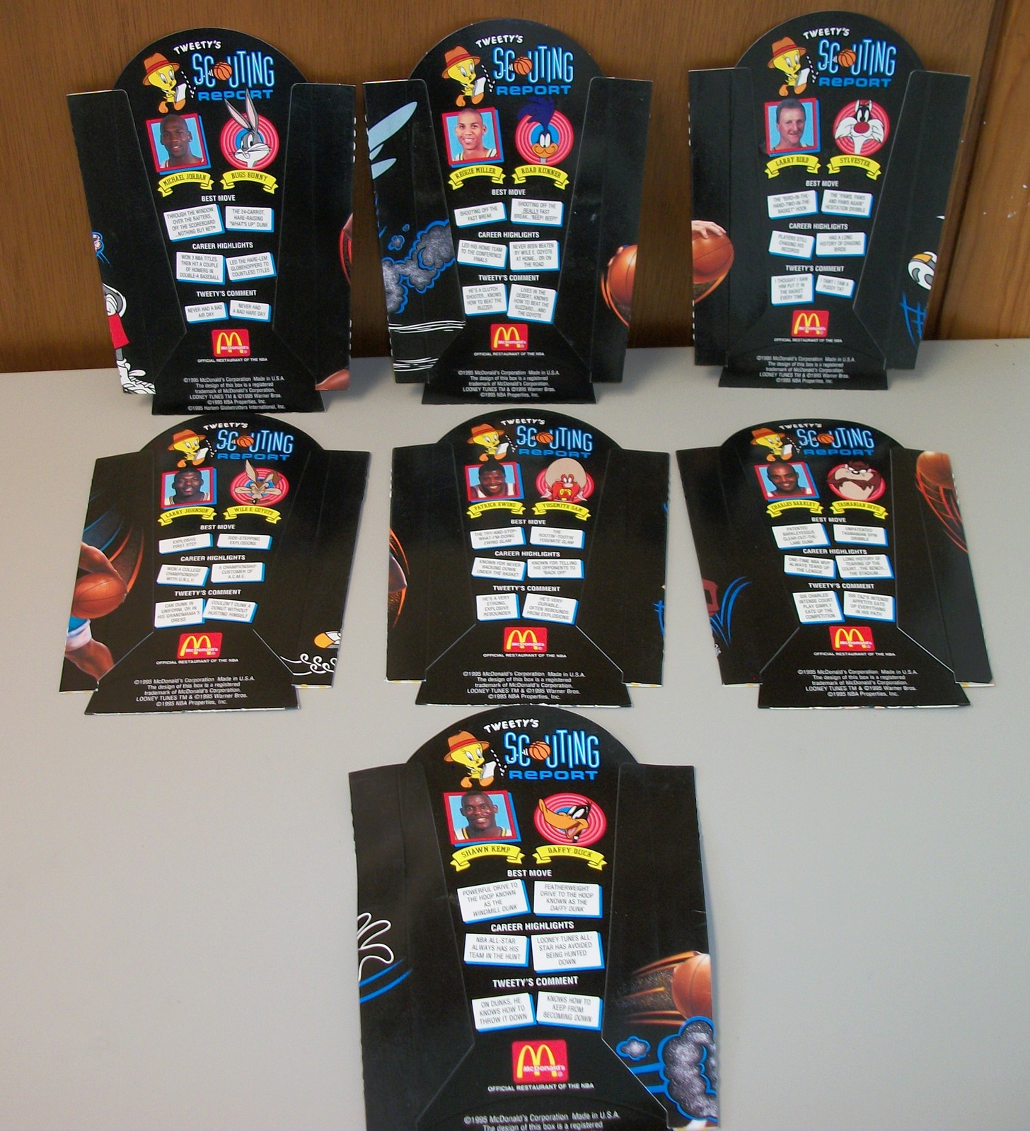 Up for sale is a lot of 7 new McDonald’s Super Size fry boxes from 1995. These are from 1995 and feature Looney Toons characters and professional basketball players. These are all in unused condition (never had any fries in them) and the Shawn Kemp box has some warping from age (See picture!) – what you see in the pictures is what you get: