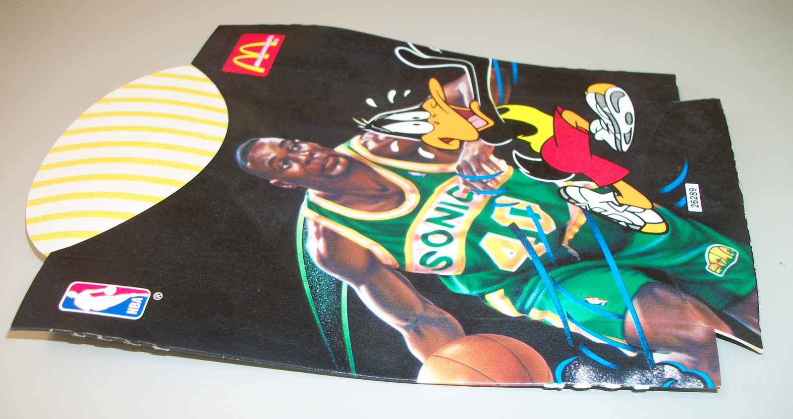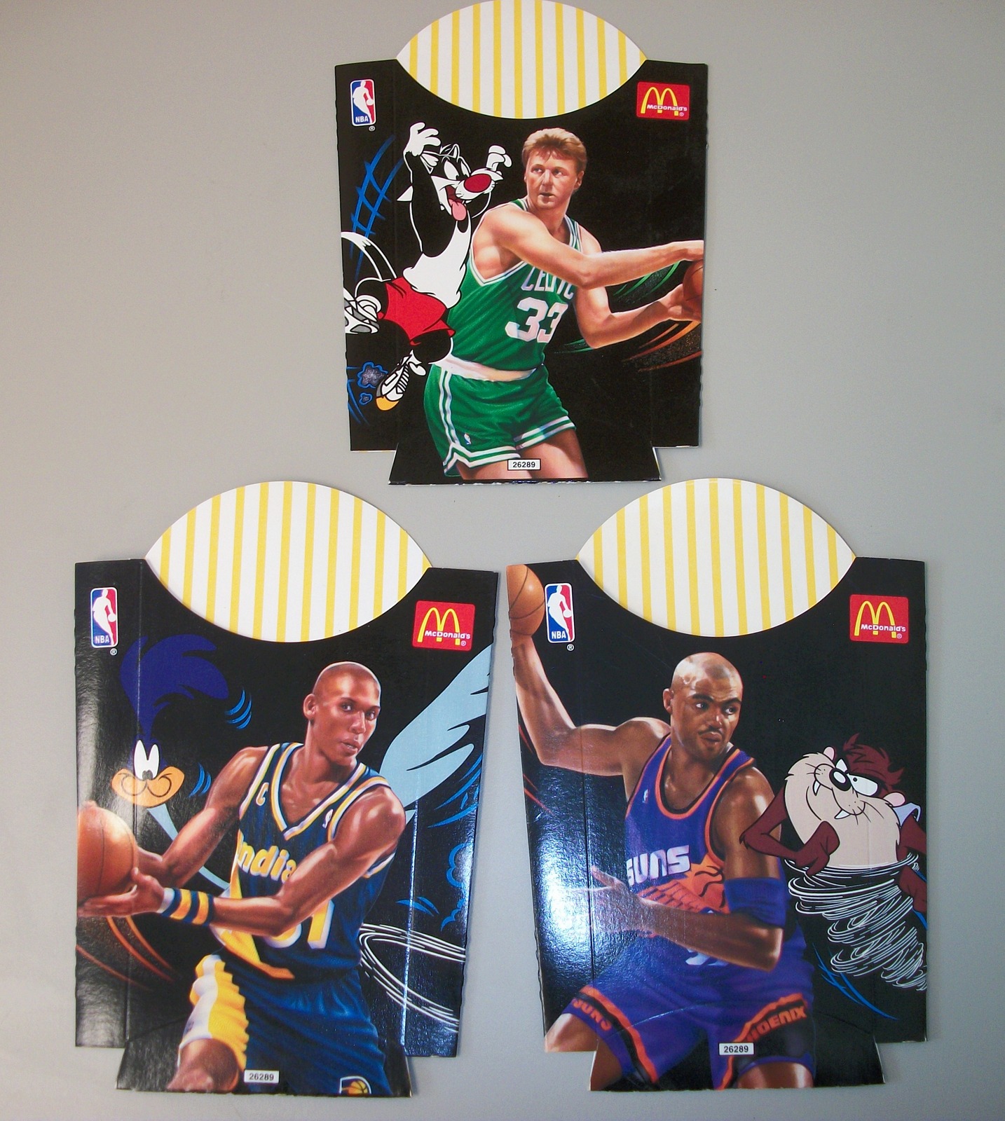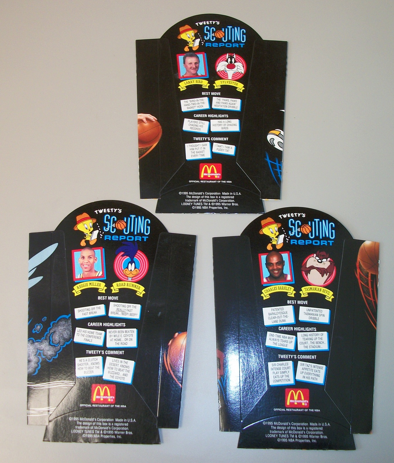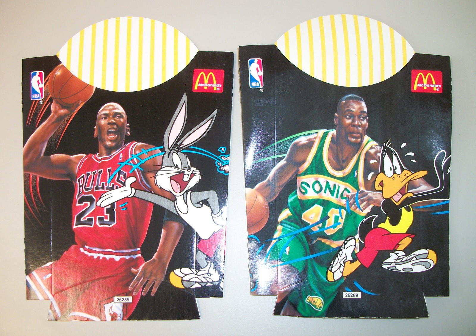 Up for sale is a lot of 7 new McDonald’s Super Size fry boxes from 1995. These are from 1995 and feature Looney Toons characters and professional basketball players. These are all in unused condition (never had any fries in them) and the Shawn Kemp box has some warping from age (See picture!) – what you see in the pictures is what you get:
