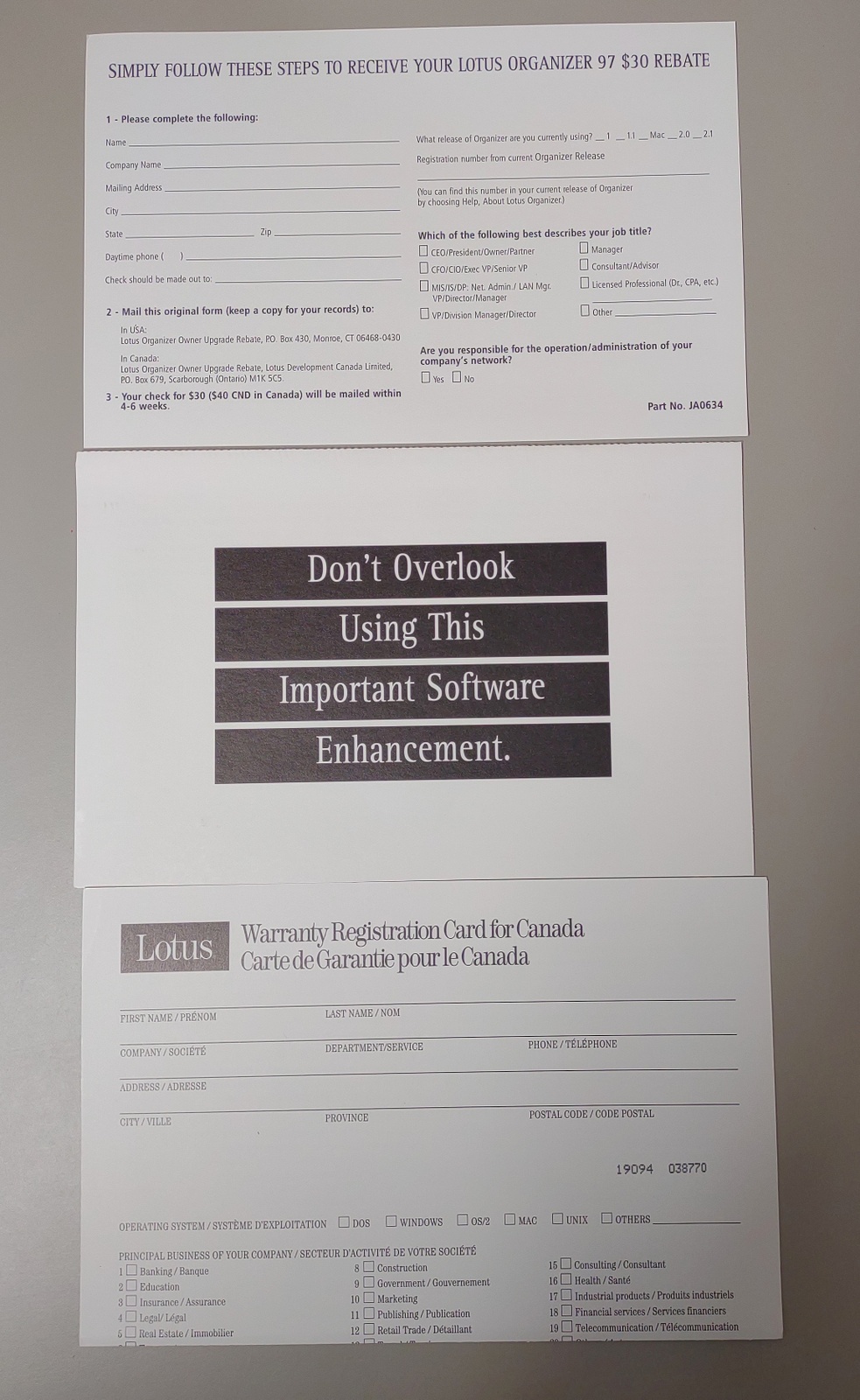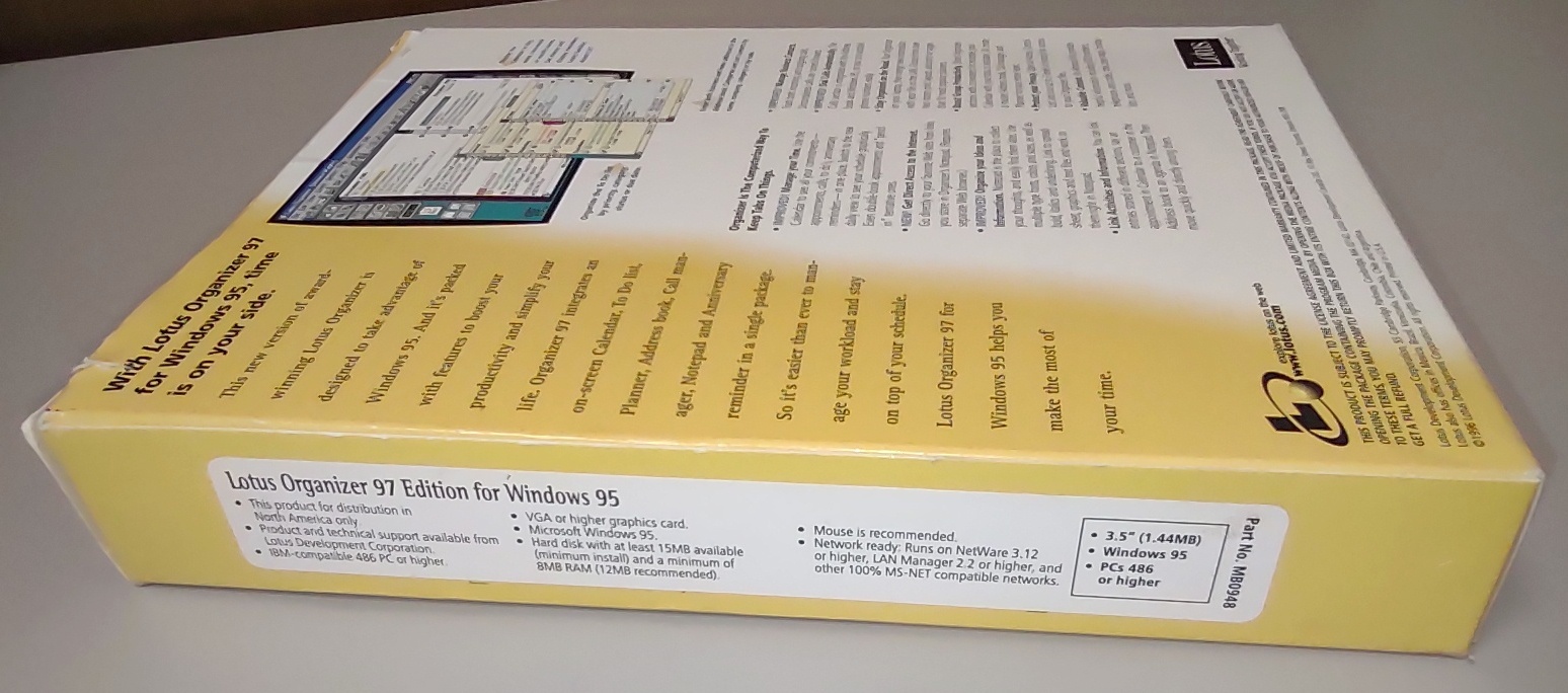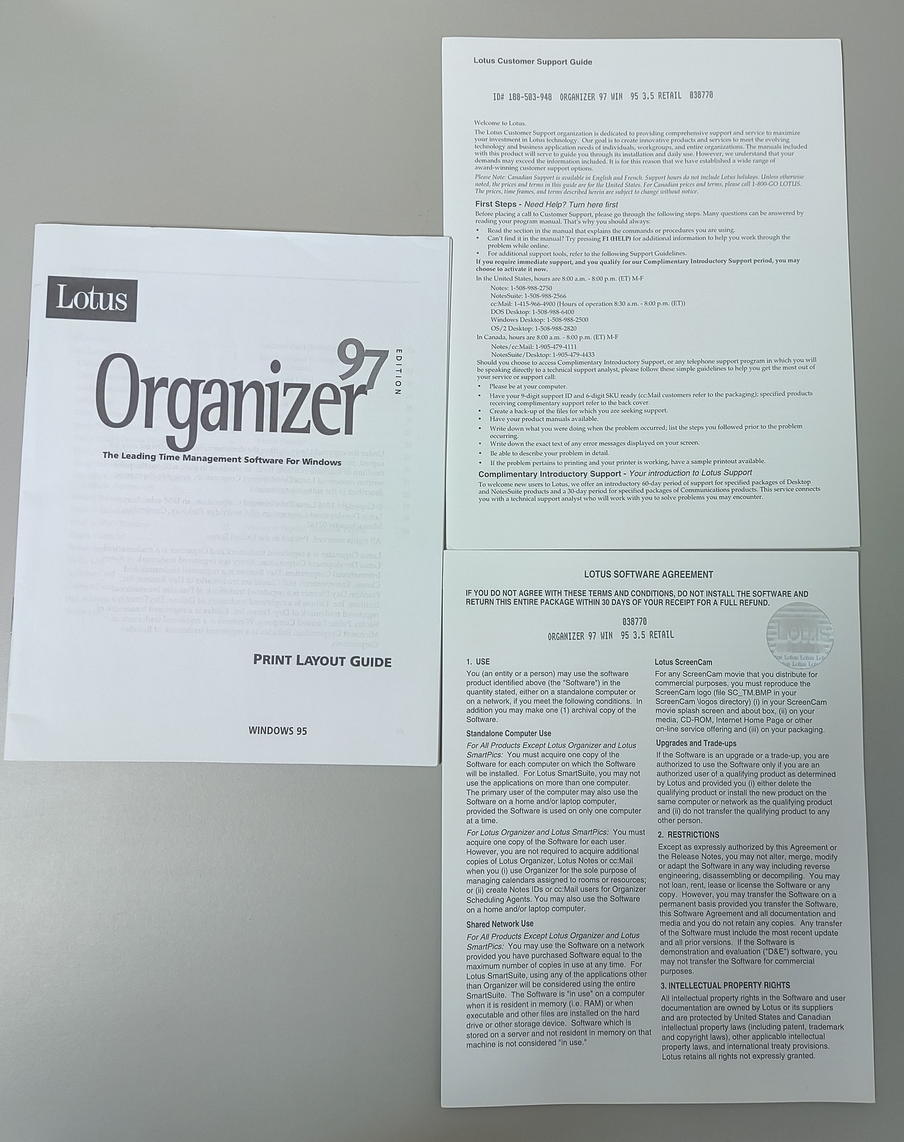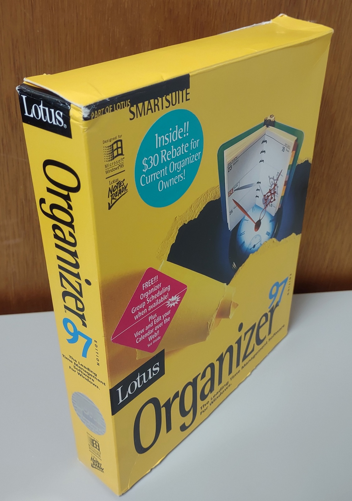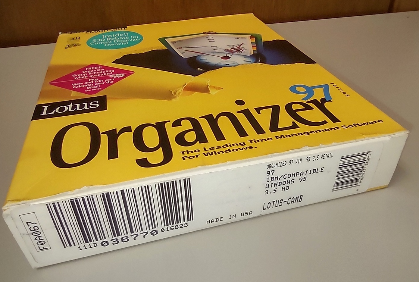 Up for sale is the original box, manual, and diskettes for Lotus Organizer 97 PIM (Personal Information Manager) from 1996 – ‘With Lotus Organizer 97 for Windows 95, time is on your side.’ We don’t have any vintage computers suitable to try and test this, so it’s sold as-is for a collectable only – please bid accordingly – it’s decades old. What you see in the pictures is what you get.