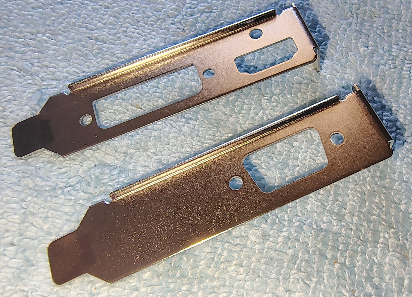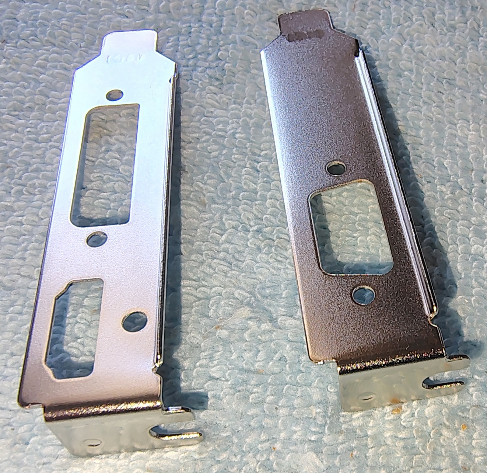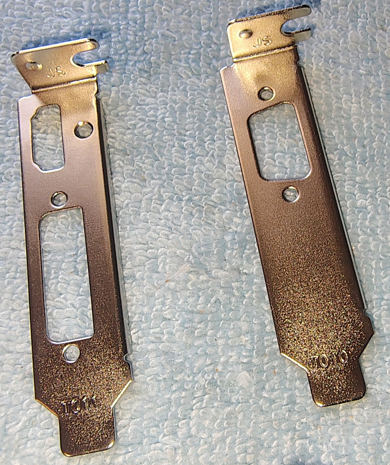 Up for sale is the low profile bracket set for use with XfX One ON-XFX1-DLX2 & ON-XFX1-STDR graphics cards – VGA bracket is #T010 & DVI / HDMI bracket is #T011. This set is also compatible with R5-230A-CLH2, HD-545X-ZQH2, and HD-645X-ZQHP. It may be compatible with other graphics cards – please check with XFX for compatibility for your card BEFORE you purchase this item.
