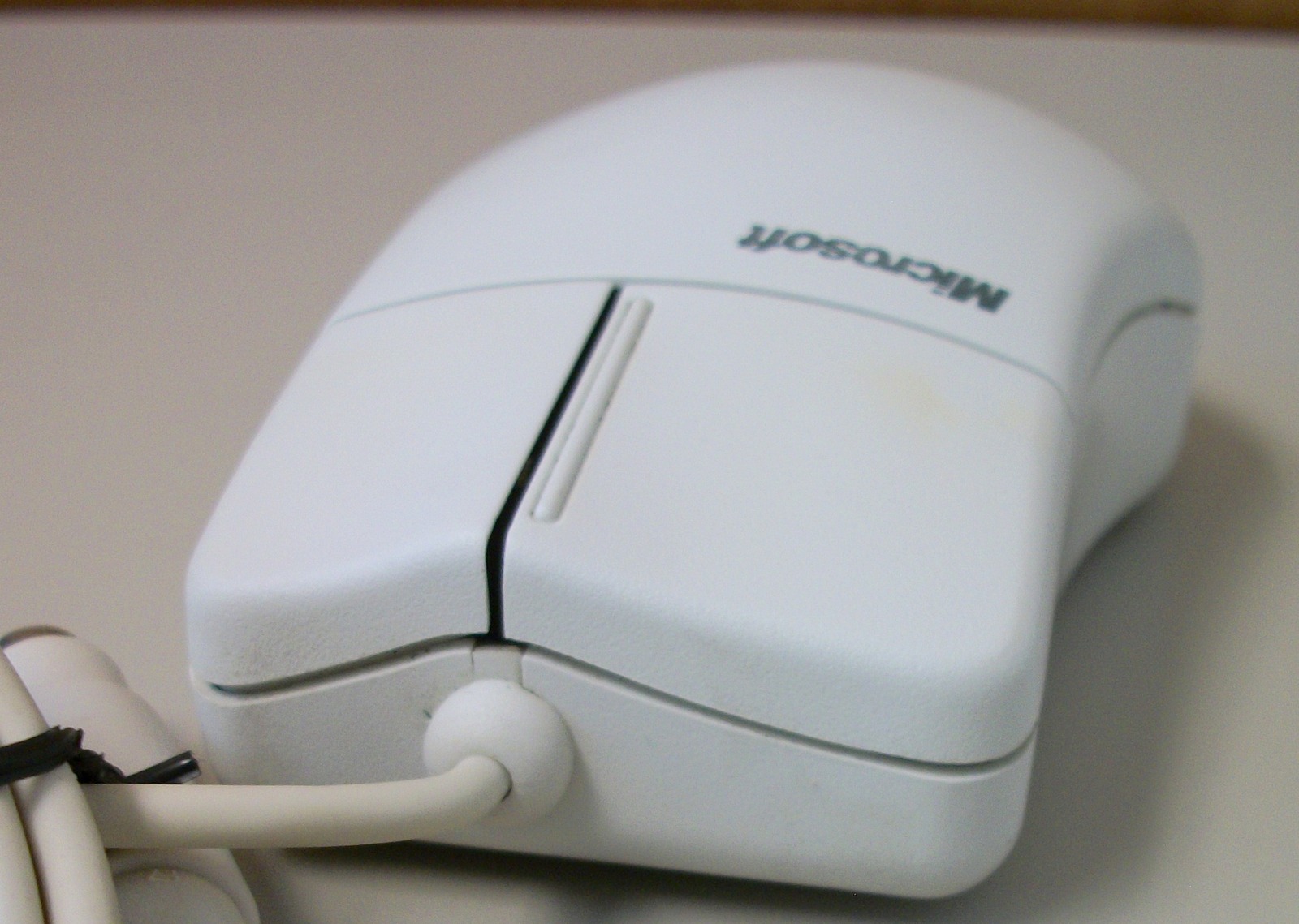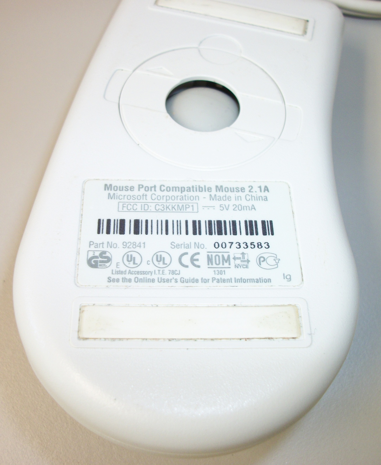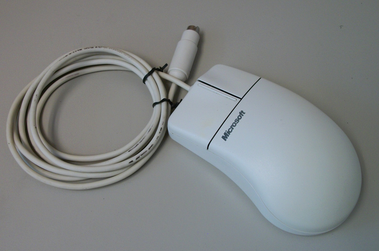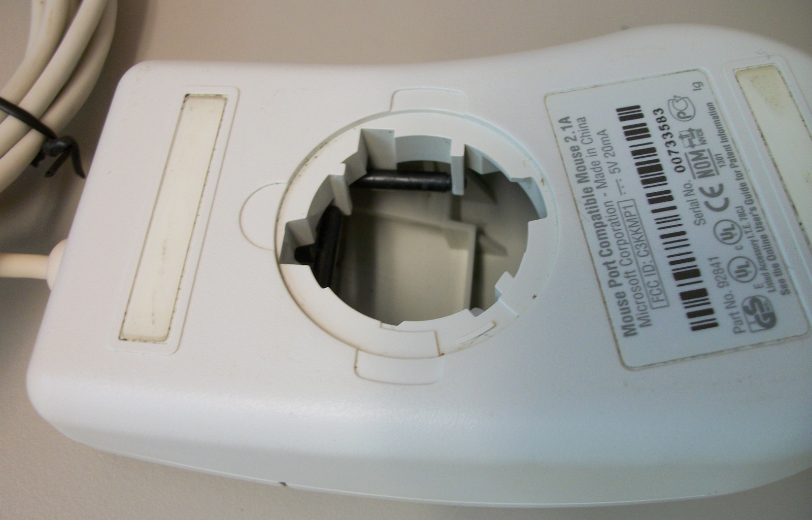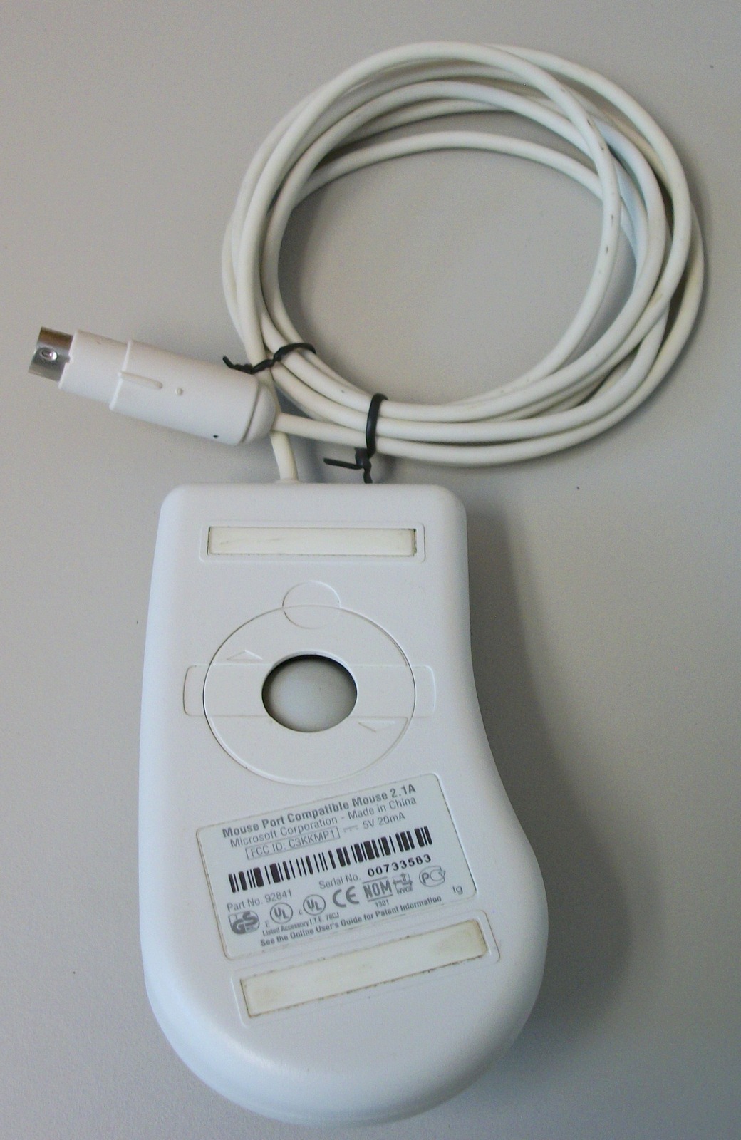 Up for sale is a white Microsoft 2-button Mouse Port Compatible ball mouse 2.1A. Part number 92841. SN: 00733583. We connected this to the PS/2 port of our old Windows XP Machine and it seemed to work just fine – as well as can be expected from an old ball-type mouse. We did not have a mouse port computer available to try it out on. Just remember to power off your PC before connecting PS/2 peripherals. Hope someone out there on the interwebs can put it to use, or collect it!