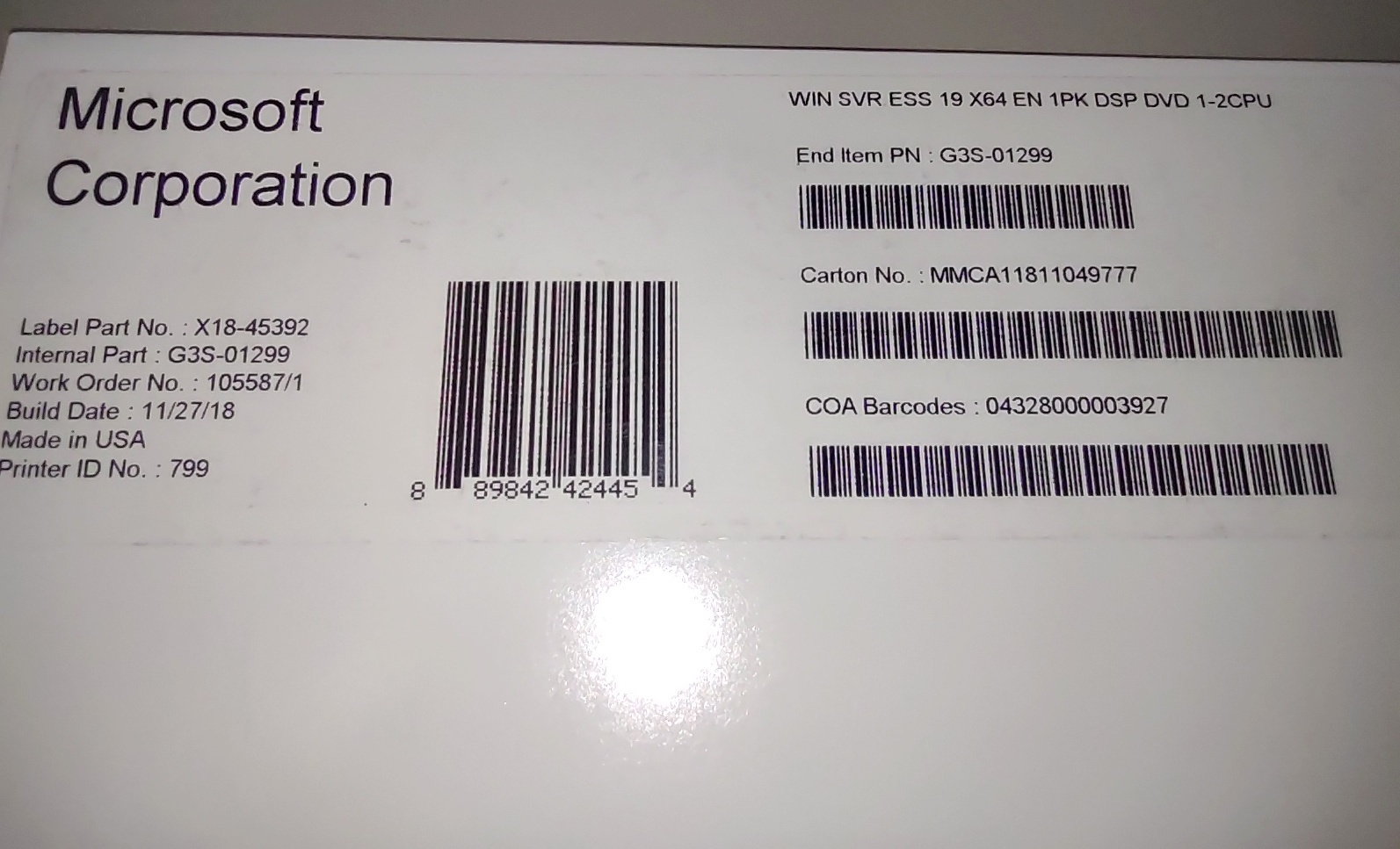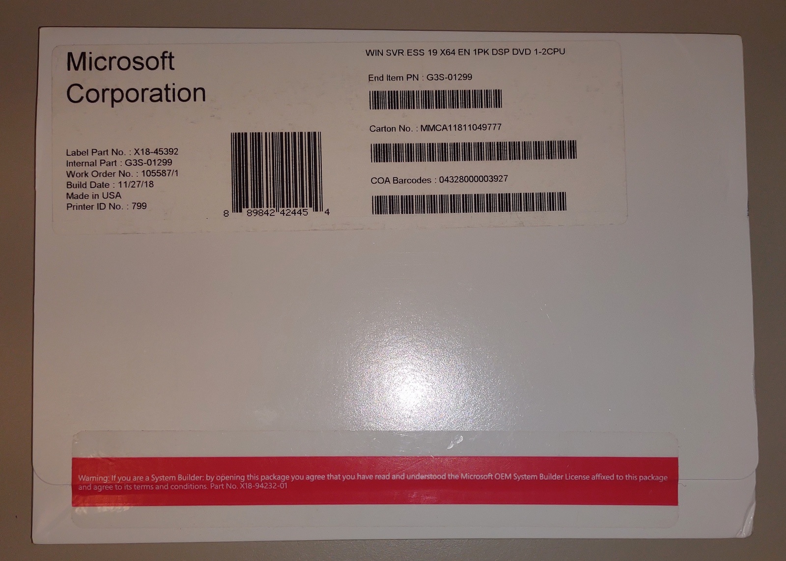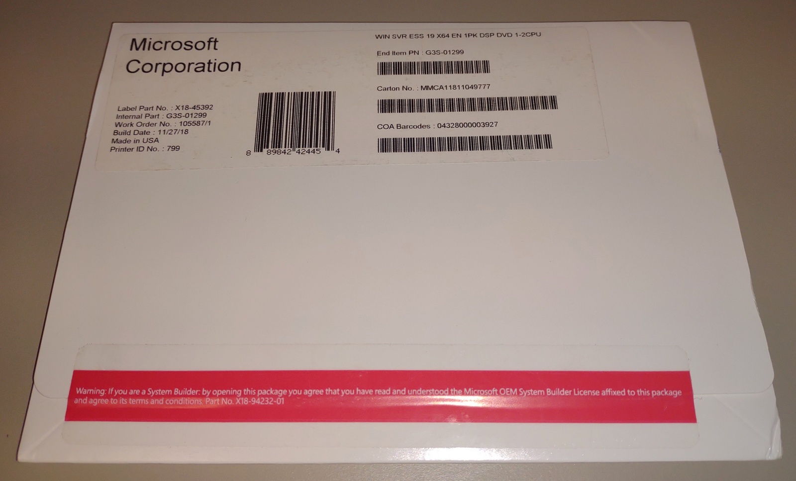 Up for sale is a new Microsoft Windows Server 2019 Essentials 64-bit original install DVD from 2018. This is for installing Windows Server 2019 Essentials on your home-built server. X18-45392, G3S-01299, Build Date: 11/27/18, Made in USA. This is in new, old stock condition – SEE PICTURES!
