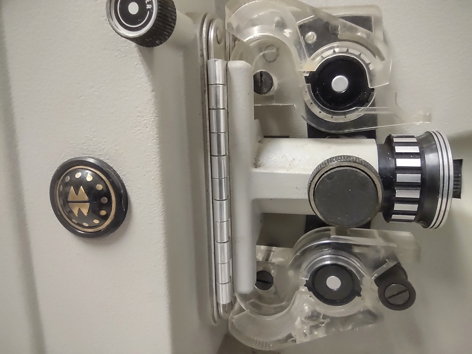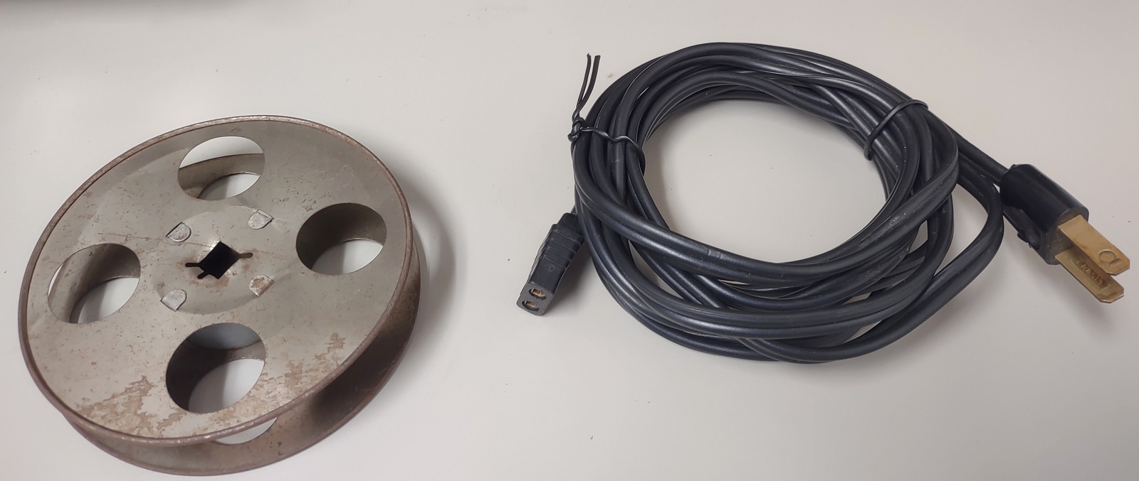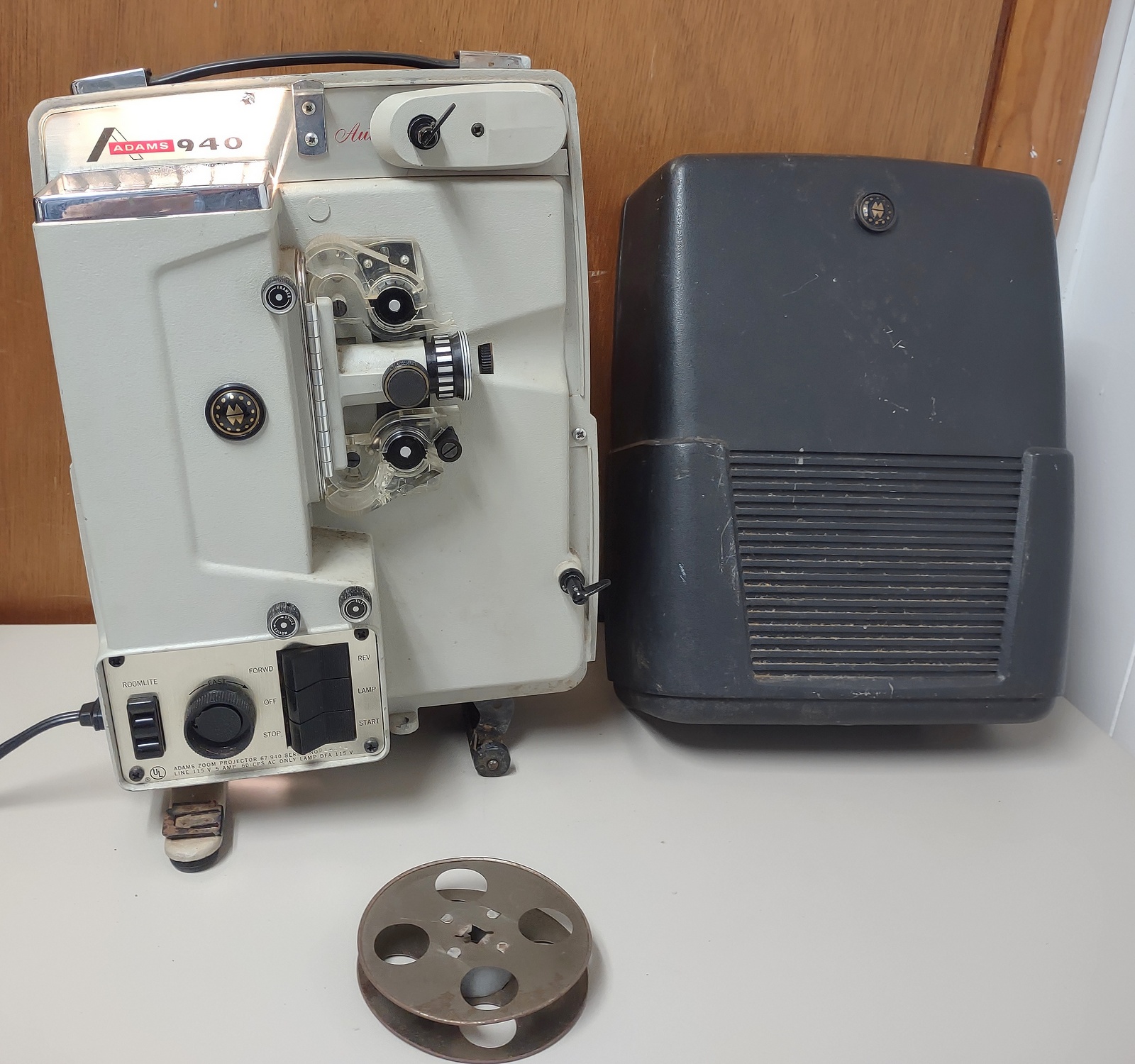 Up for sale is a vintage Montgomery Ward Adams 8mm film projector. Included is the original power cable and one spool – LOOK AT THE PICTURES. The projector powers on, the light came on and there was some whirring inside, but it started smelling so it was turned off. We suspect that the smell was from dust getting hot on the bulb, but we’ll leave it up to the next owner to properly refurbish it. This might be useful for parts or to repair.