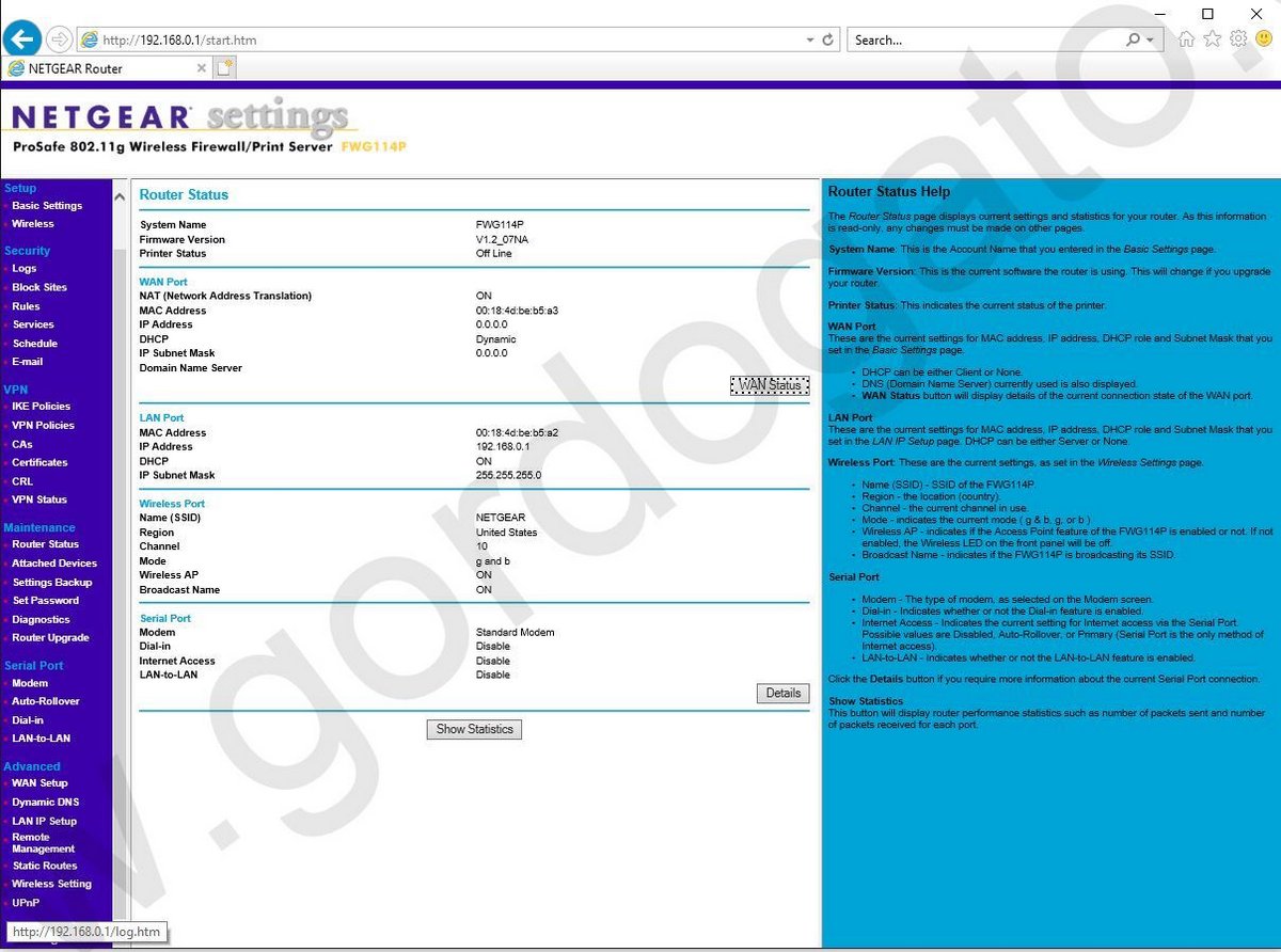 Up for sale is a Netgear ProSafe FWG114P v2 wireless VPN router which has been reset to the defaults. It is ready for you to configure and use as you like. This was used for several years and has now been replaced with a newer, faster firewall. Hope someone out there can use it! Configuration can all be done through the web interface – it seems to work better with Internet Explorer. It supports 2 simultaneous VPN tunnels, SPI Firewall, WPA Enterprise, compatible with Netgear ProSafe VPN client software VPN011 and VPN05L. It also has a serial port which we used to share an ISDN internet connection years ago.