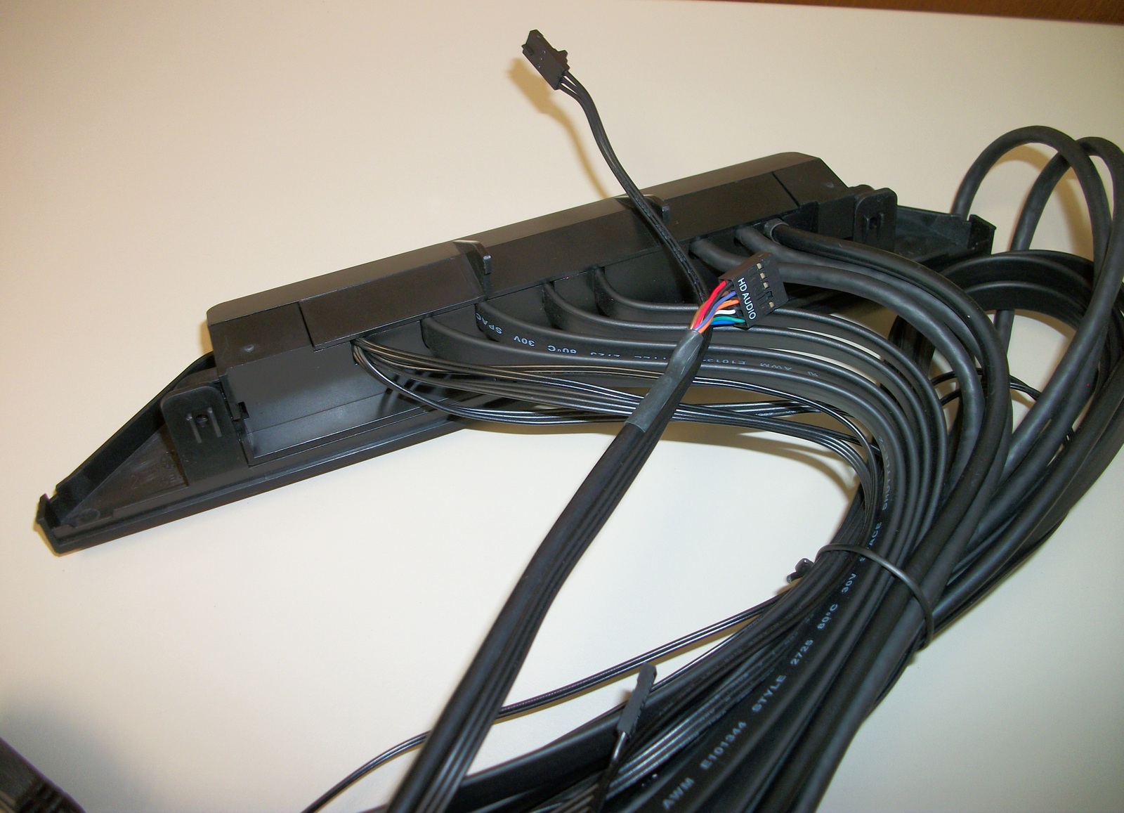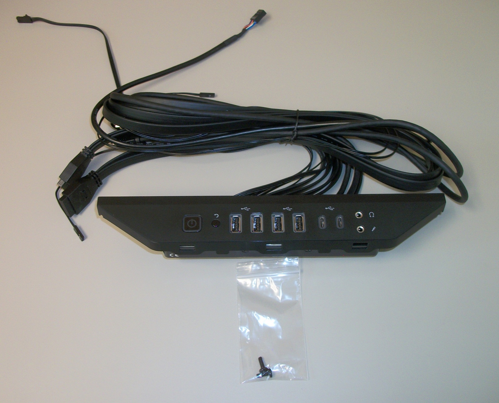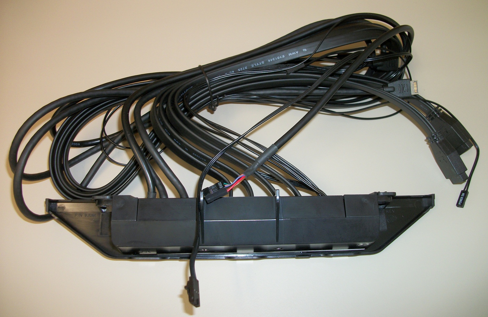 Up for sale is an I/O panel for use with Corsair Obsidian 1000D cases. It may fit other cases, but we’re not for certain – you should check with Corsair for compatibility with your case BEFORE you purchase this one. It also may be useful in your own project or custom case. The cables on this are pretty long as the 1000D is a large case – the longest is the HD audio connector and it is about 49″ long. The reset / power / USB plugs are about 9″ shorter at about 40″ long. The shortest is about 12″ long and the 2nd shortest is about 20″ long – we’re not sure what connects to these – maybe Corsair Link / RGB / Power / Fan Control?? The panel measures about 10 13/16″ on the long edge by about 7″ long on the short edge by about 2 5/16″ on the obliques by about 3/8″ between the long edge and the start of the obliques by about 1 3/4″ tall (not counting the extra space required behind the panel for the exit of the cables) by about 1 1/2″ thick.