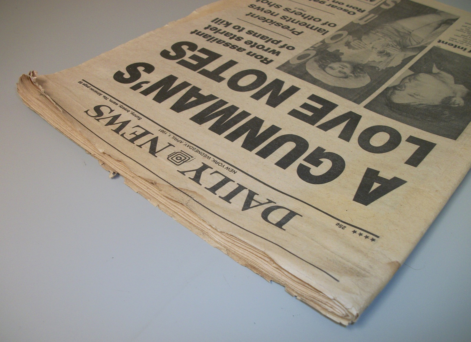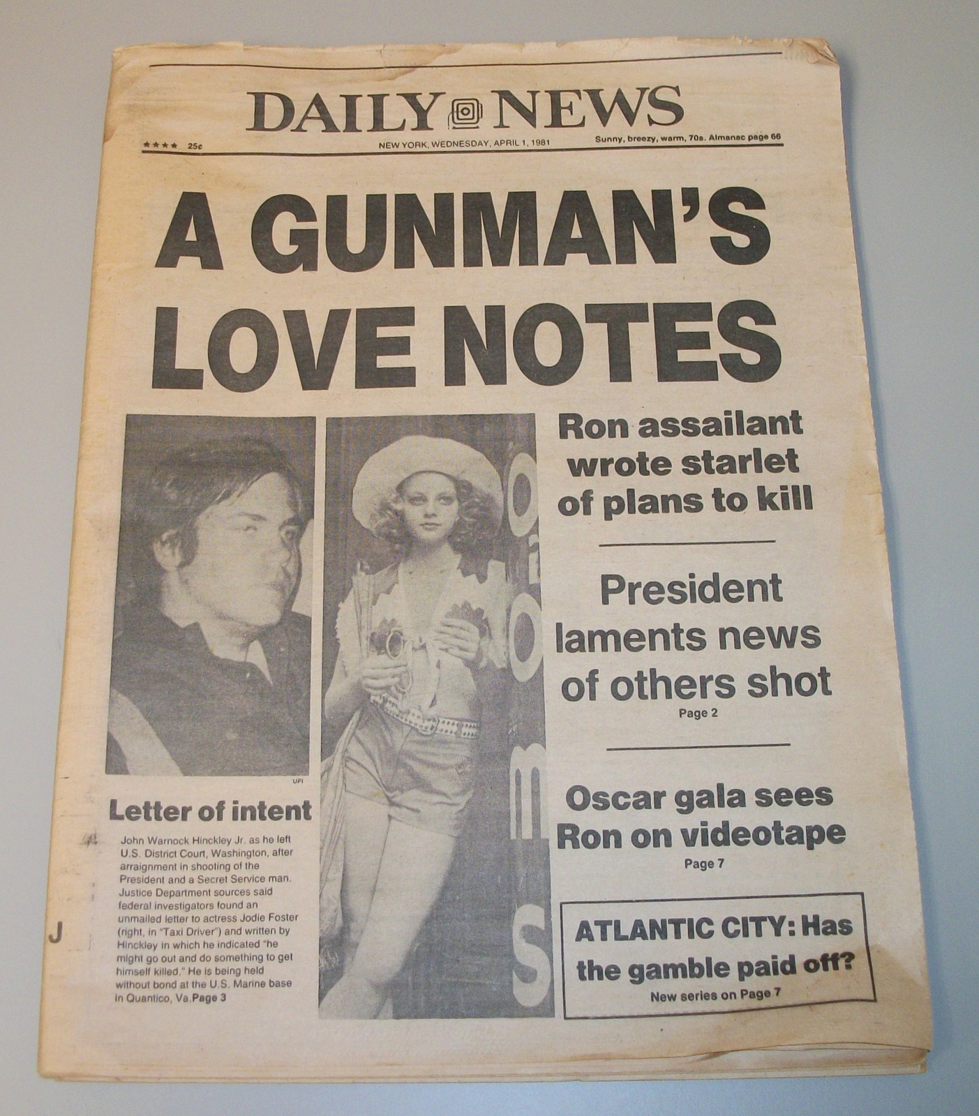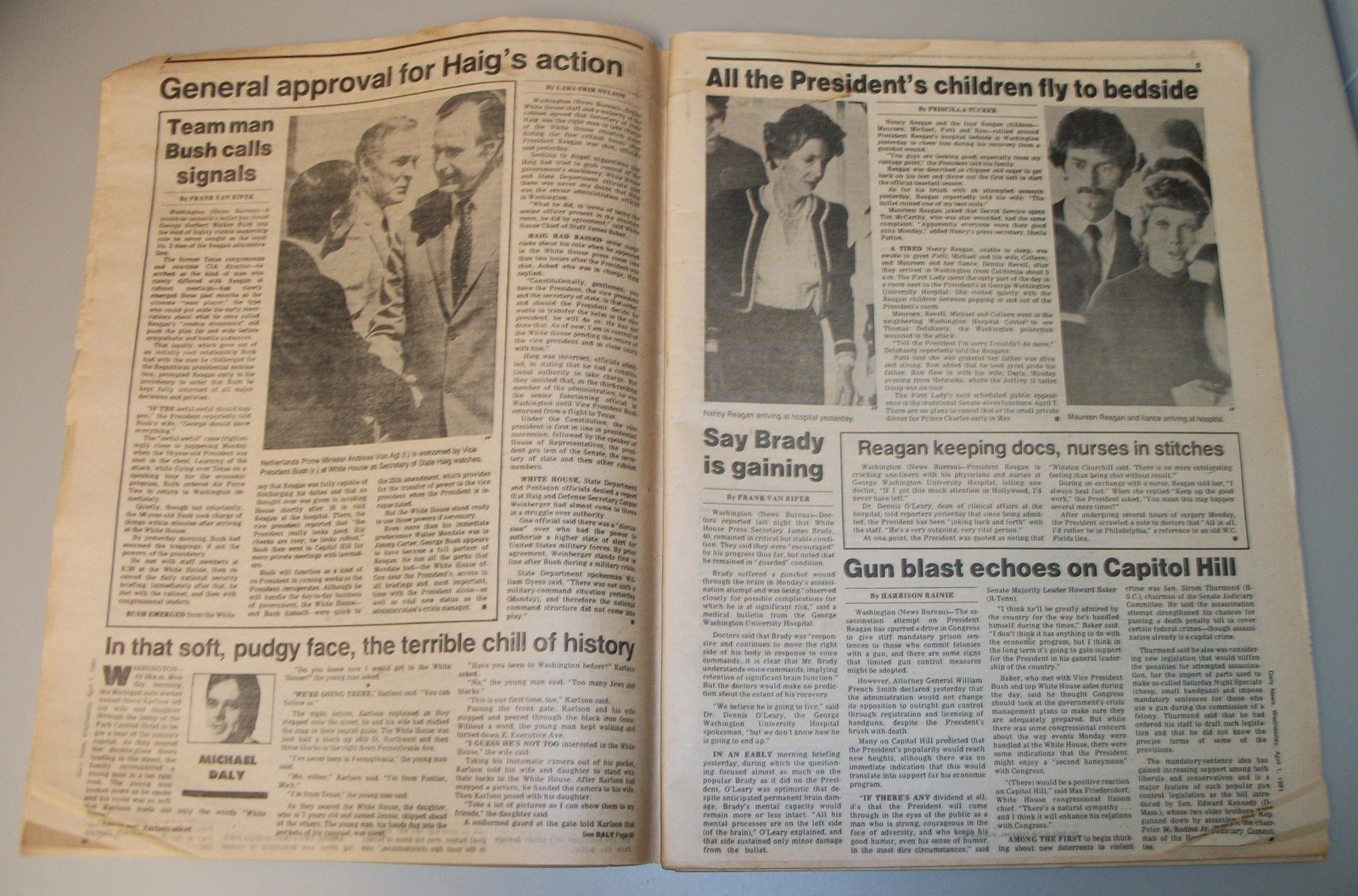 New York (New Jersey edition) Daily News – Wednesday April 1, 1981. Headlines include: ‘A GUNMAN’S LOVE NOTES’ ‘Ron’s assailant wrote starlet of plans to kill’ ‘President laments news of others shot’ . What you see in the pictures is what you get.