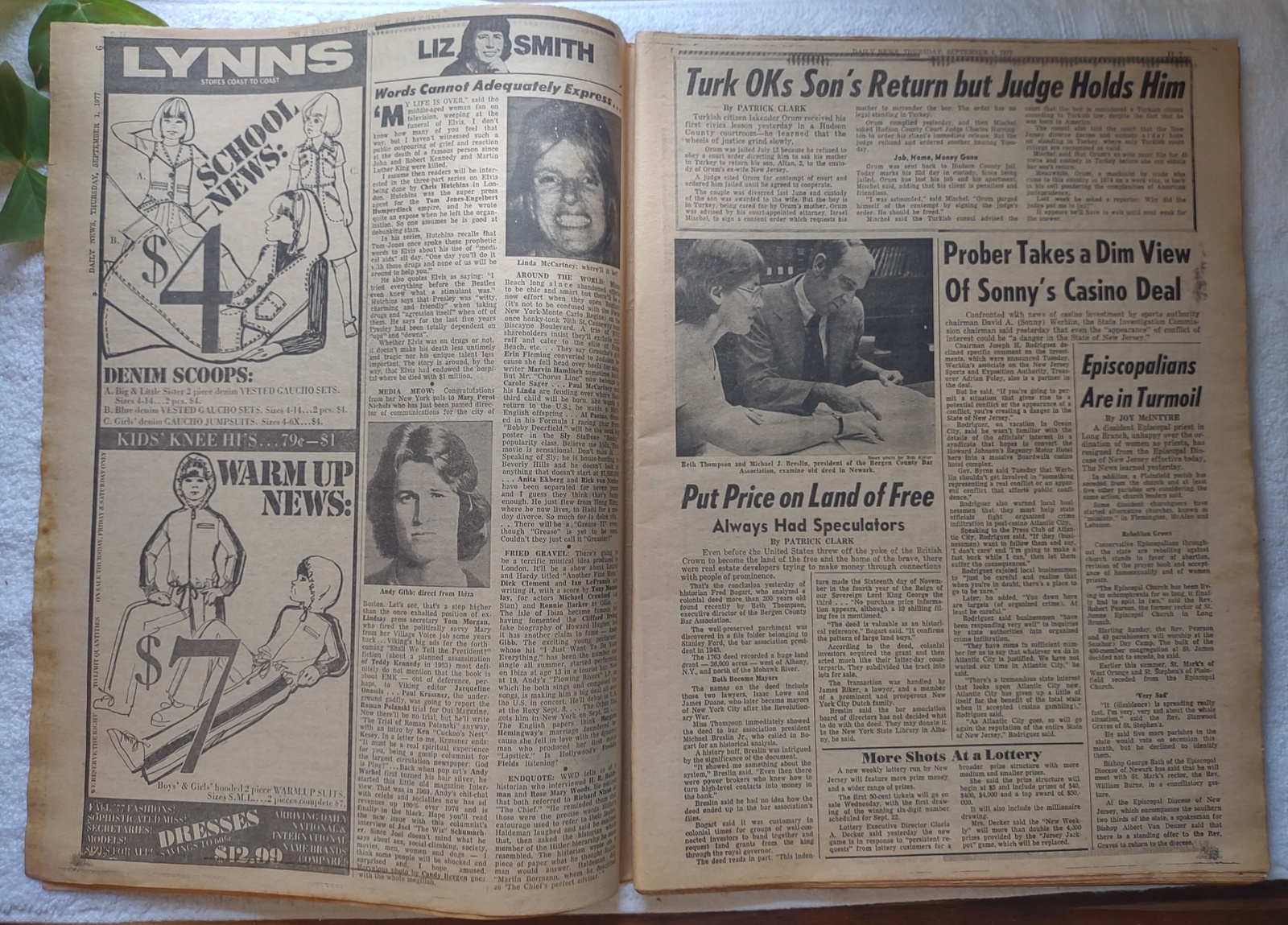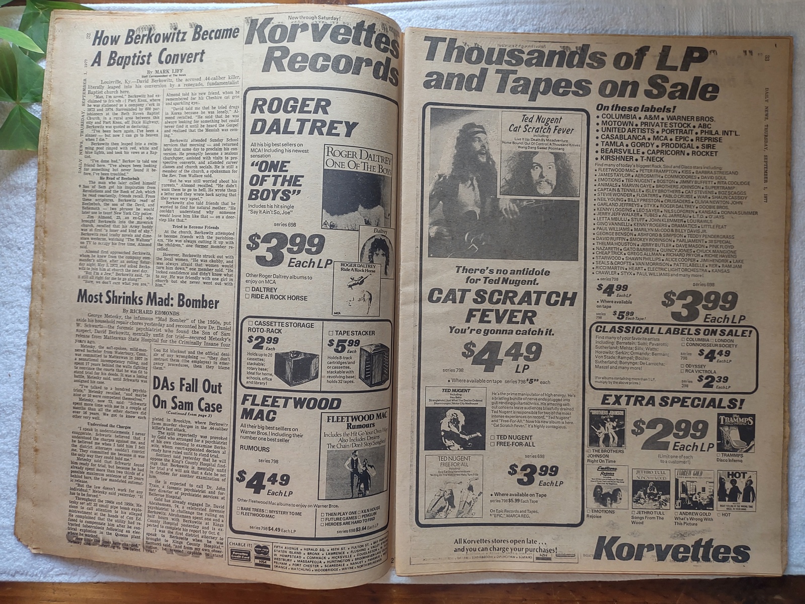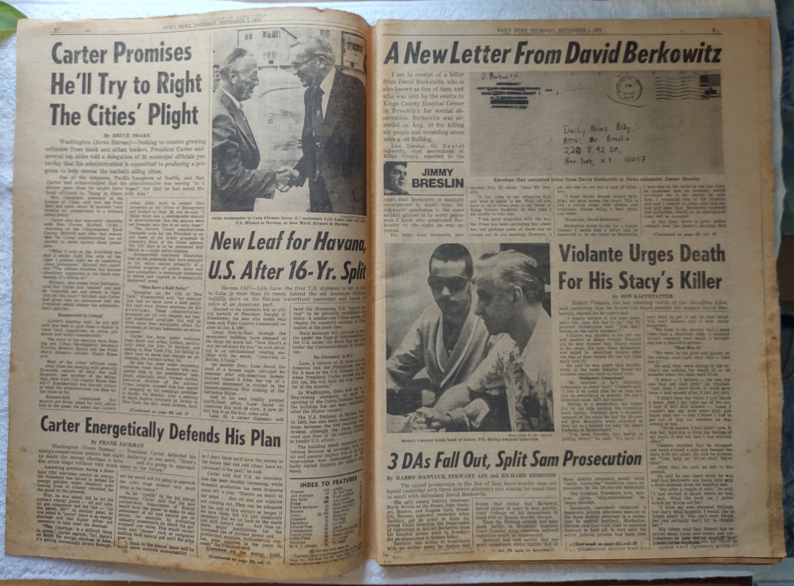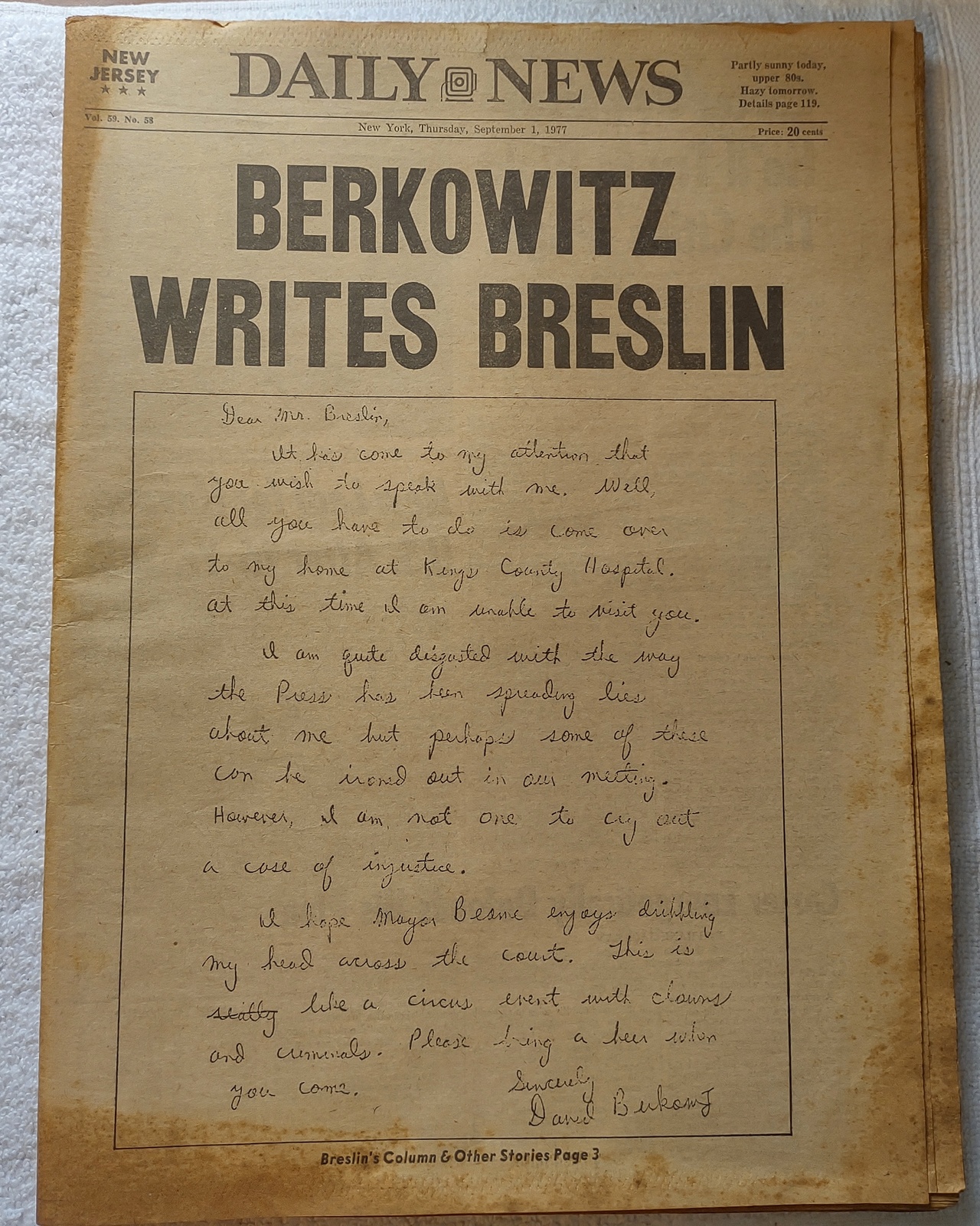 New York Daily News (New Jersey Edition) – Thursday, September 1, 1977. This old newspaper features on the front page a picture of Son of Sam serial killer’s letter to News columnist Jimmy Breslin in response to a letter written to David Berkowitz from Breslin. The headline is: ‘Berkowitz Writes Breslin’ What you see in the pictures is what you get.