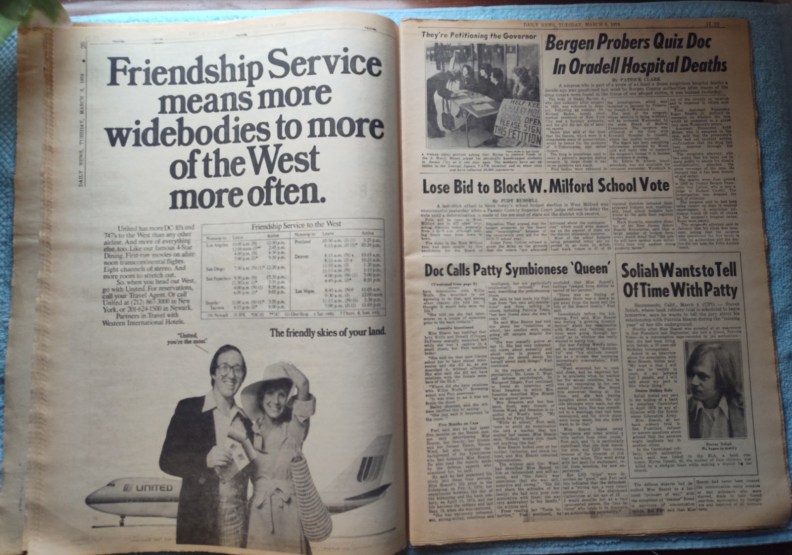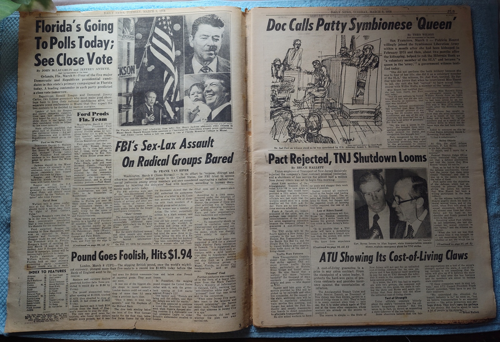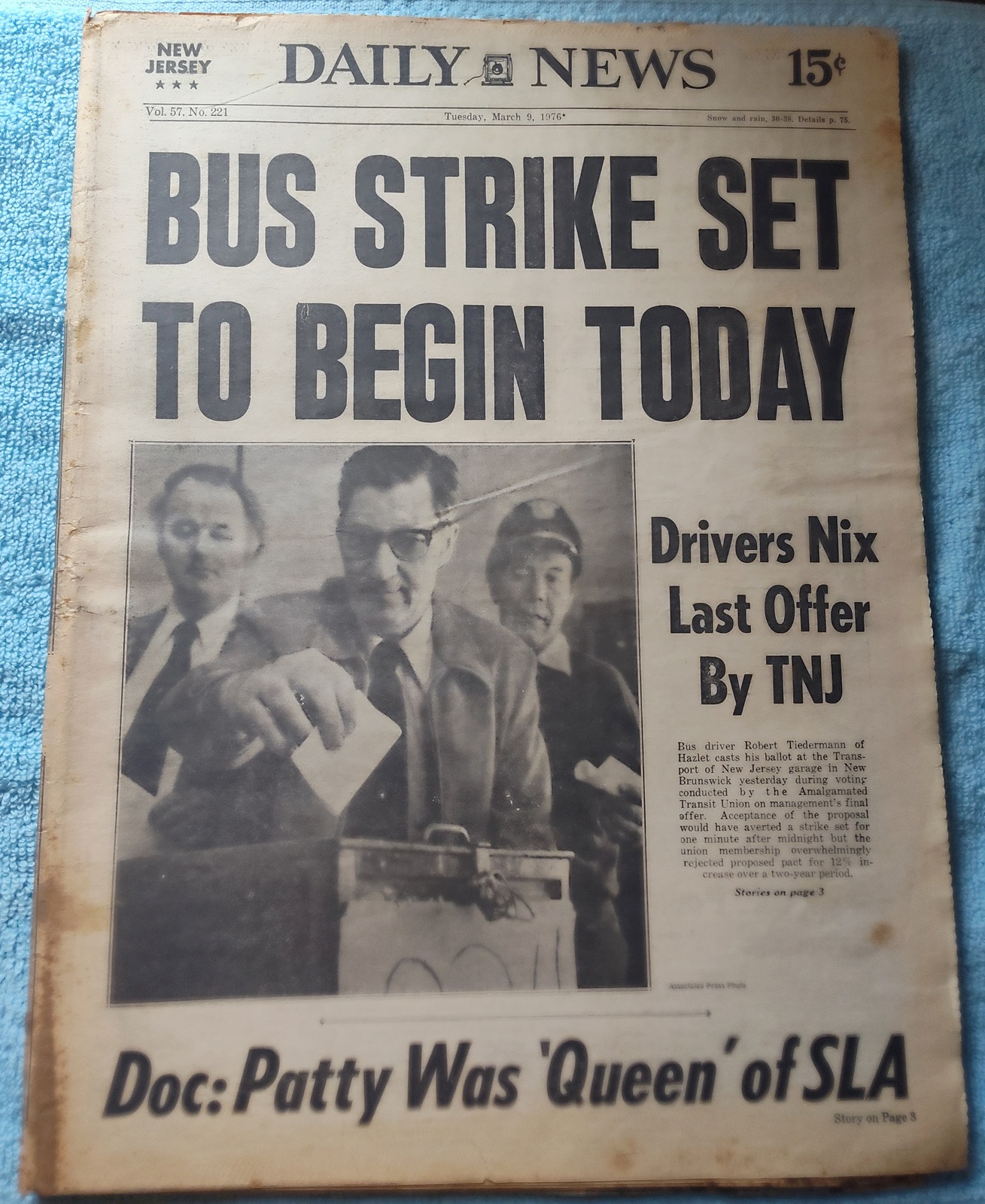 New York Daily News (New Jersey Edition) – Tuesday, February 9, 1976. This old newspaper features on the front page a picture of bus driver Robert Tiedermann of Hazlet casting his ballot as a member of the Amalgamated Transit Union. The headline is: ‘Bus Strike Set To Begin Today’ and ‘Drivers Nix Last Offer by TNJ’ and ‘Doc: Patty Was ‘Queen’ of SLA’ – What you see in the pictures is what you get.