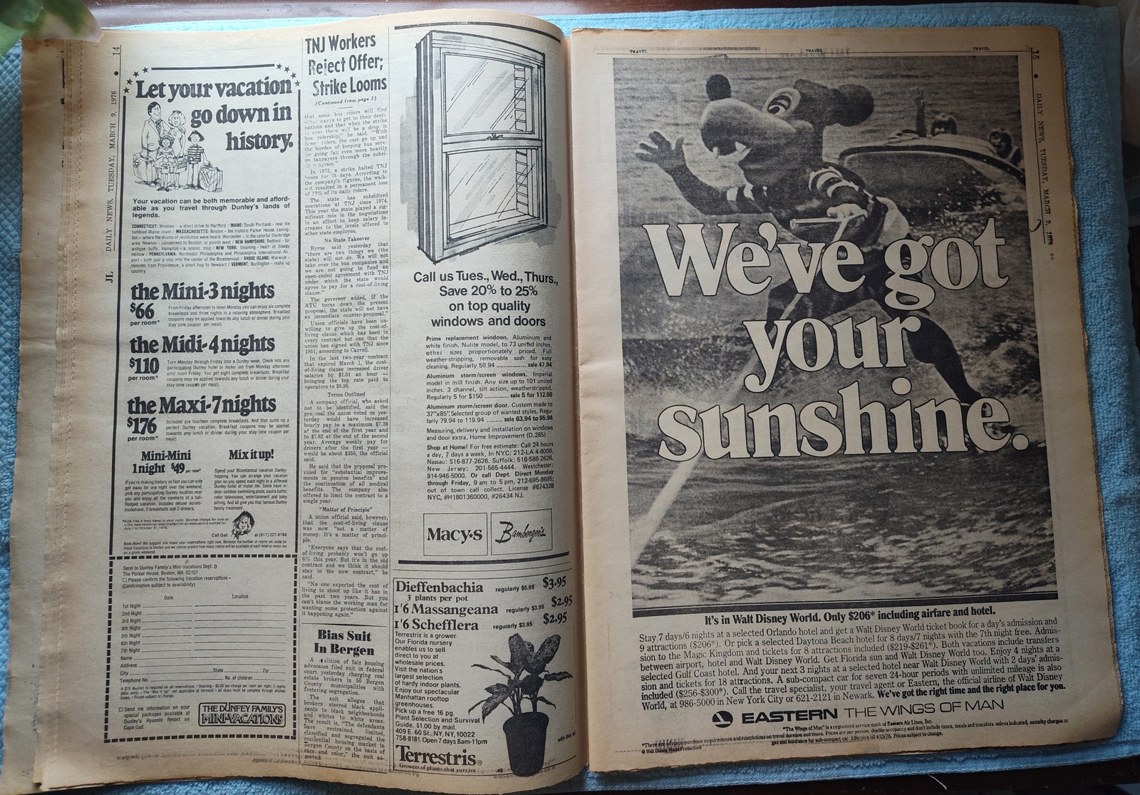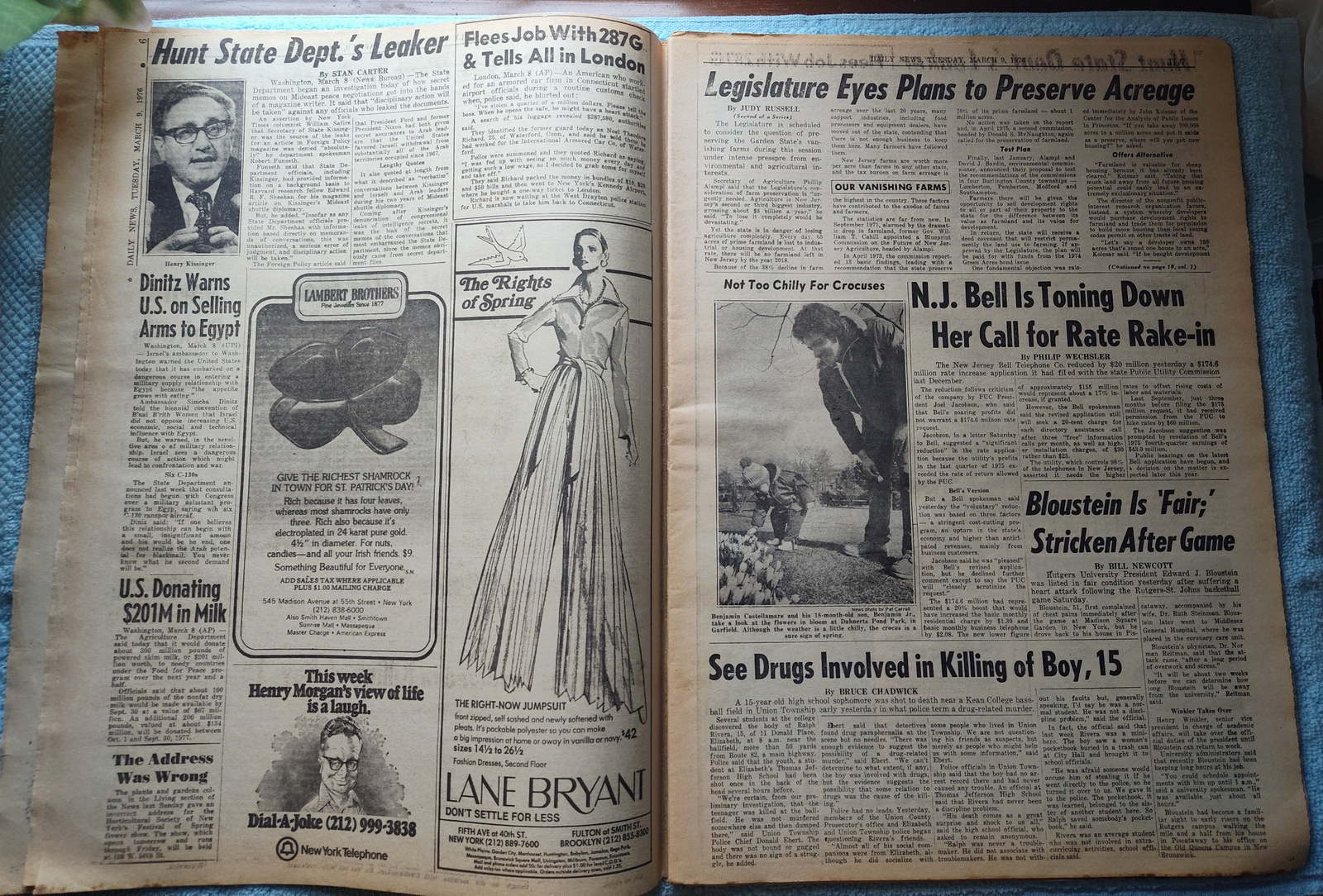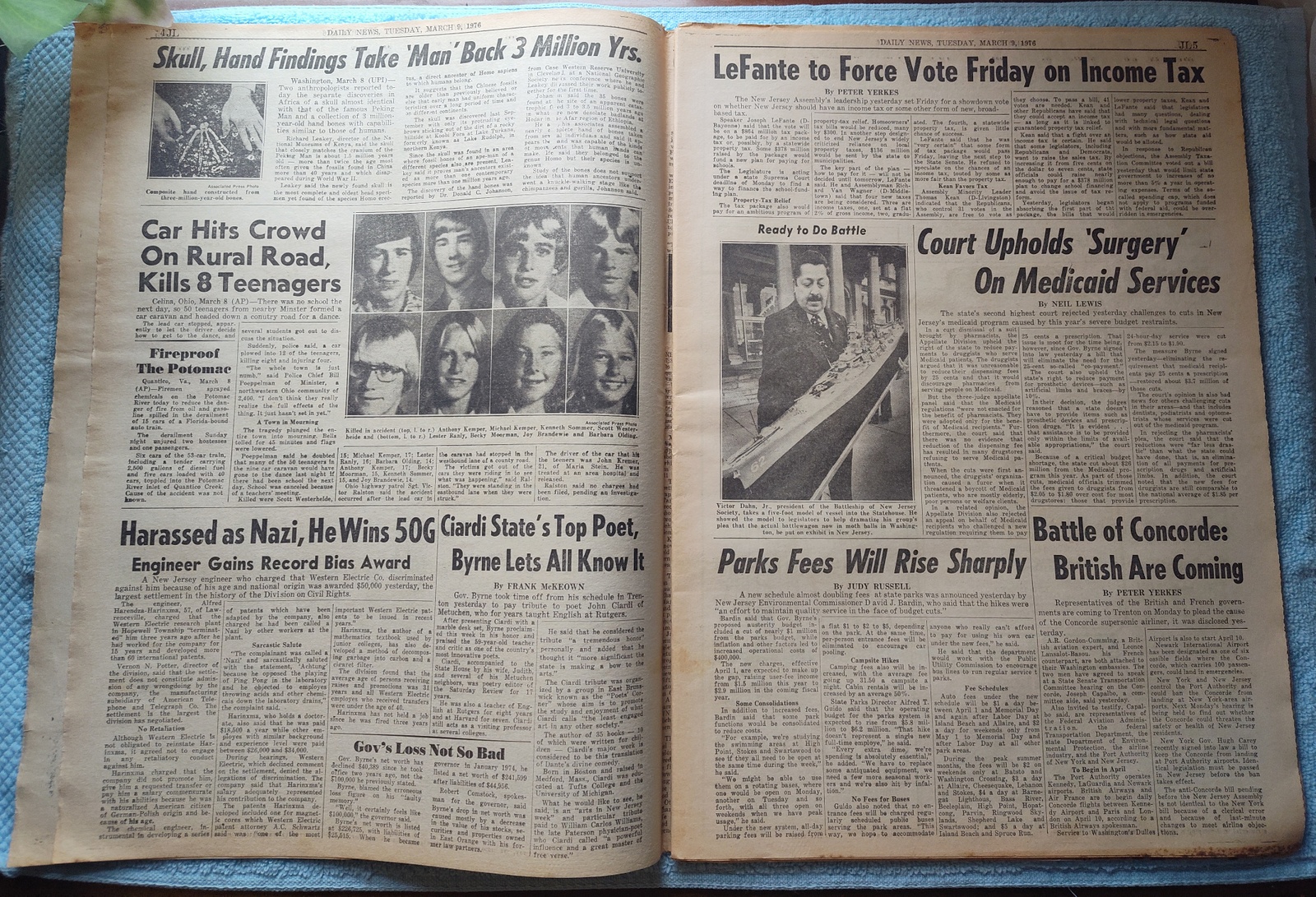 New York Daily News (New Jersey Edition) – Tuesday, February 9, 1976. This old newspaper features on the front page a picture of bus driver Robert Tiedermann of Hazlet casting his ballot as a member of the Amalgamated Transit Union. The headline is: ‘Bus Strike Set To Begin Today’ and ‘Drivers Nix Last Offer by TNJ’ and ‘Doc: Patty Was ‘Queen’ of SLA’ – What you see in the pictures is what you get.