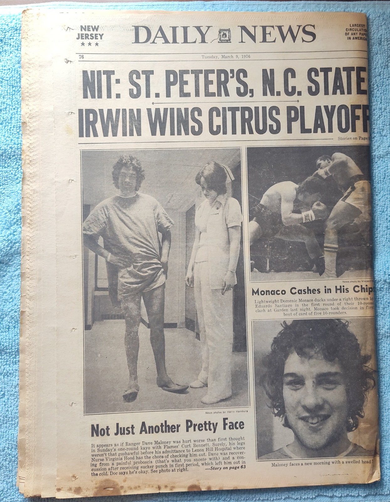 - The back page features a pictures of boxers: Ranger Dave Maloney in hospital gown, and Domenic Monaco and Eduardo Santiago throwing punches at each other.