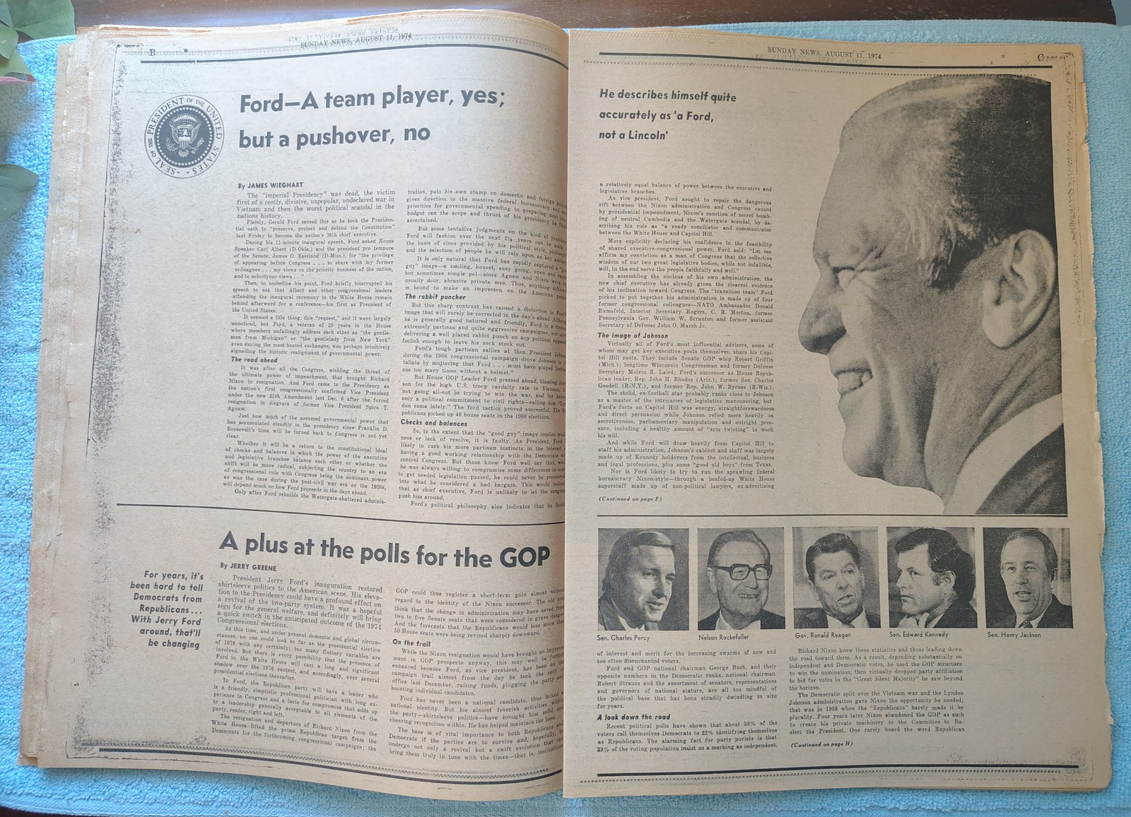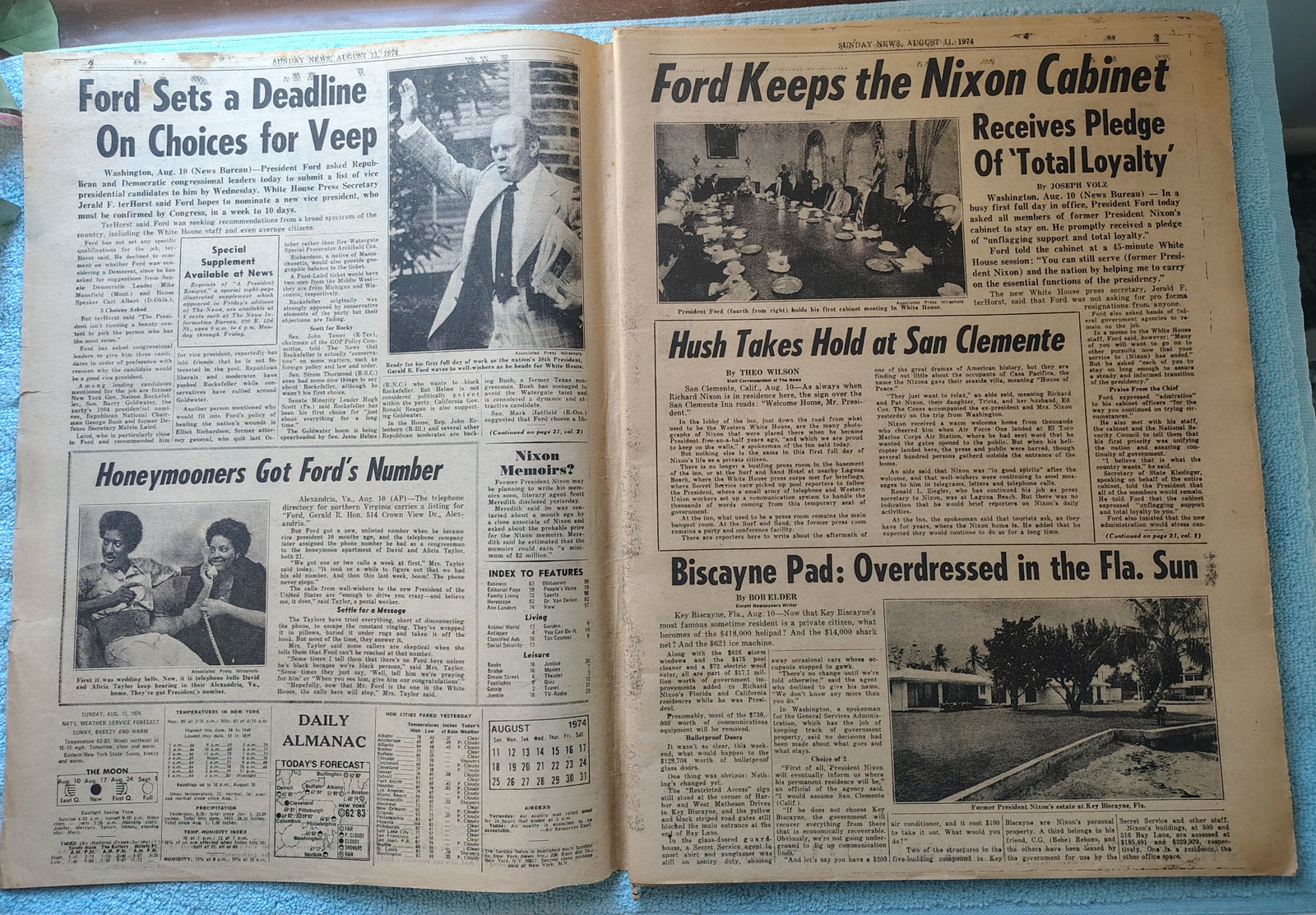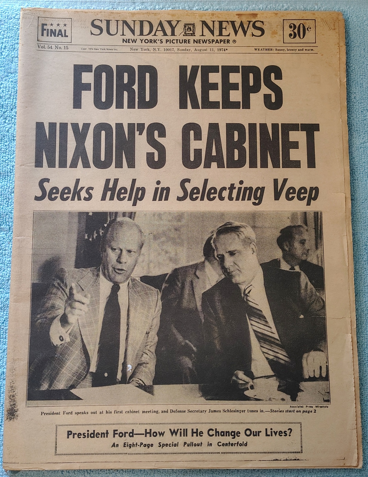 New York Daily News – Sunday, August 11, 1974. The headline is: ‘Ford Keeps Nixon’s Cabinet’ and ‘Seeks Help in Selecting Veep’ – What you see in the pictures is what you get.