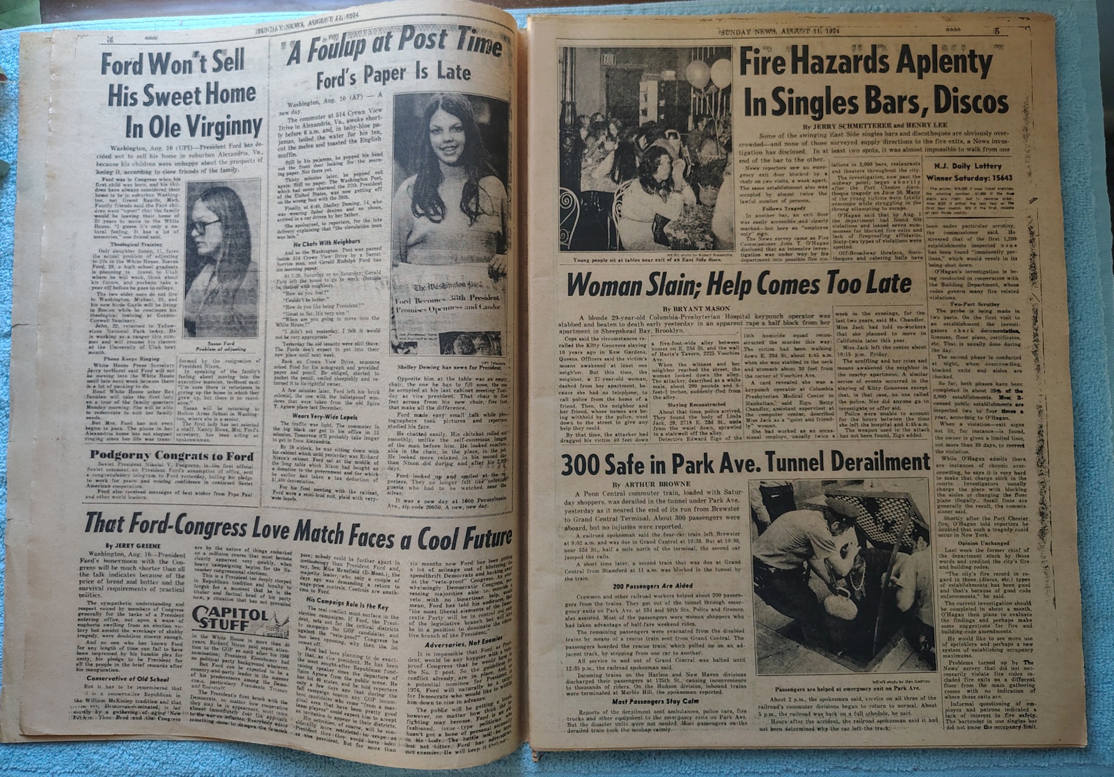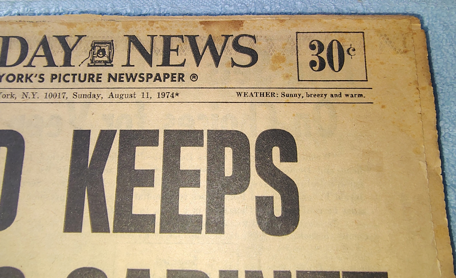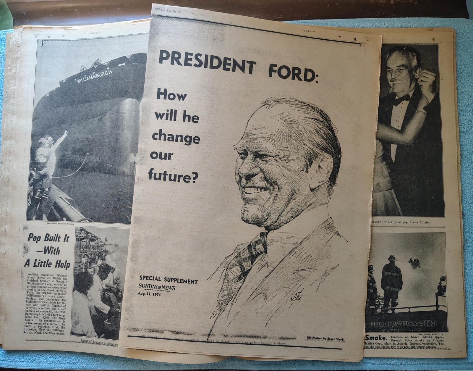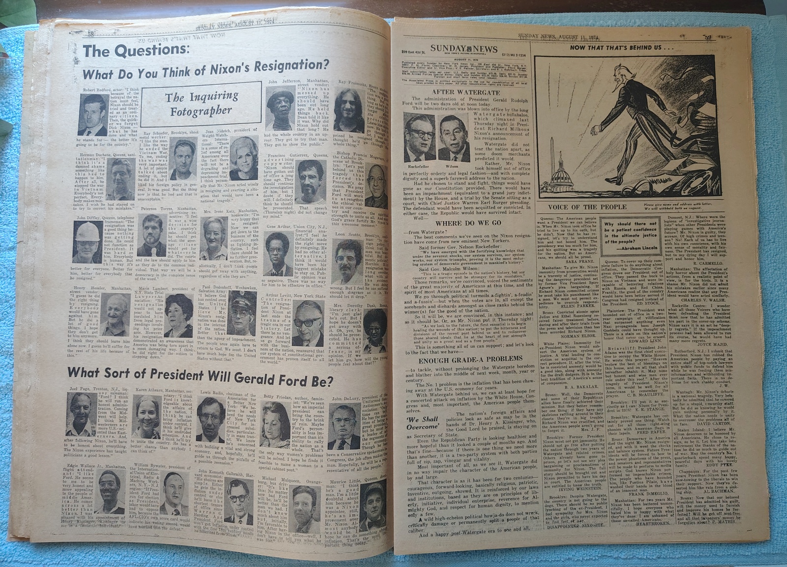 New York Daily News – Sunday, August 11, 1974. The headline is: ‘Ford Keeps Nixon’s Cabinet’ and ‘Seeks Help in Selecting Veep’ – What you see in the pictures is what you get.