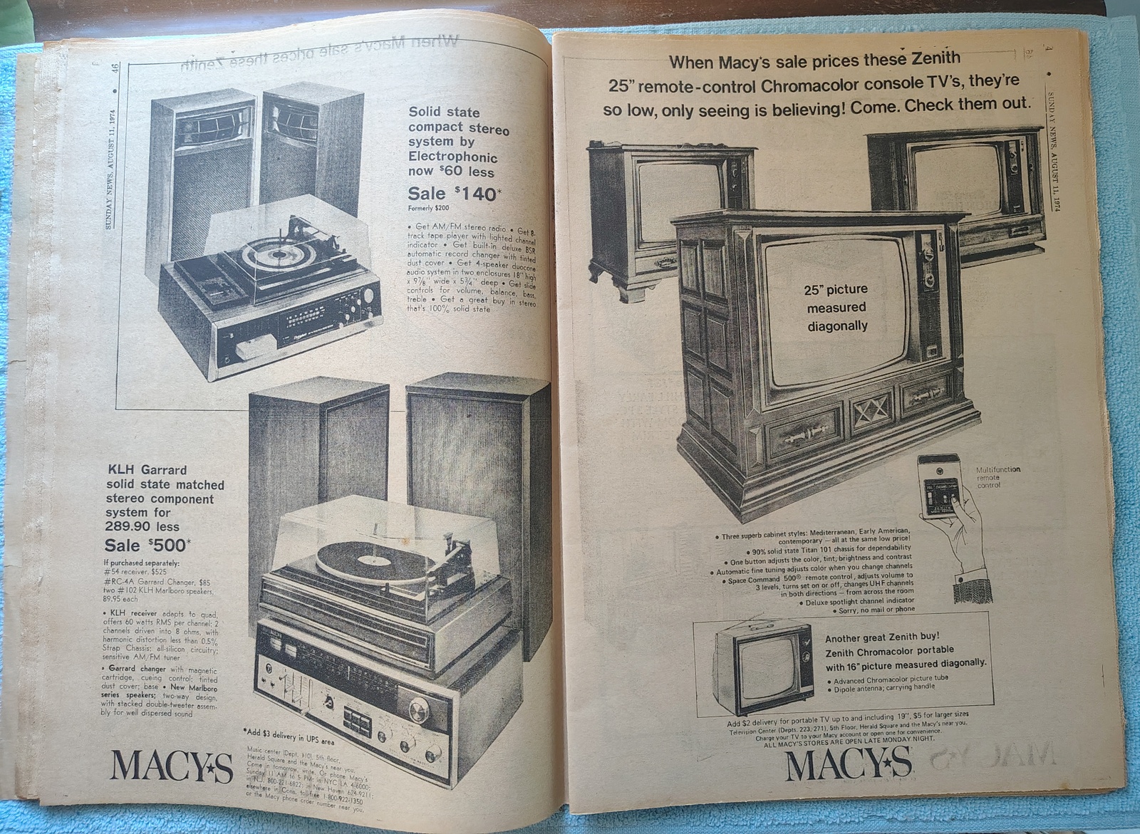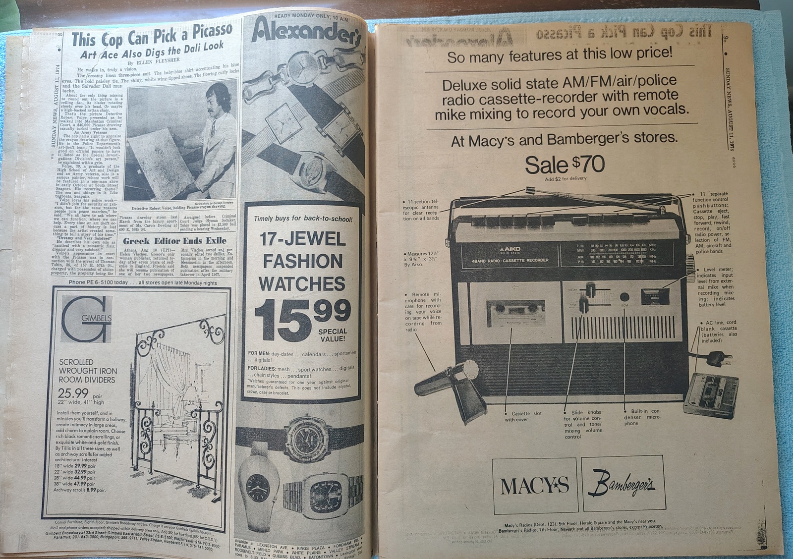 - Macy’s and Bamberger’s have ‘Deluxe solid state AM/FM/air/police radio cassette-recorder with remote mike mixing to record your own vocals’ for only $70.