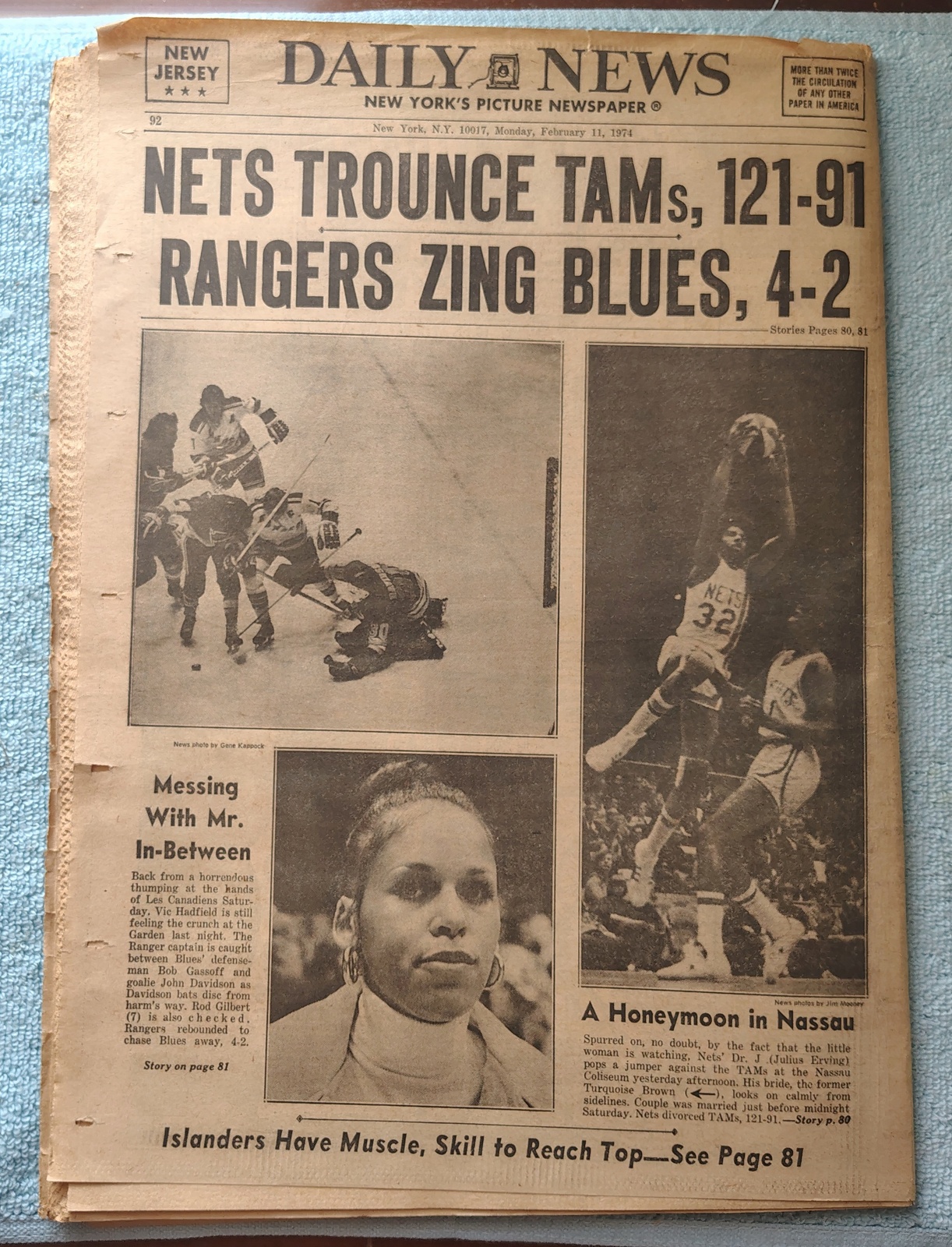 - The back page features a picture of Dr. J, Julius Erving in the air with the ball and his new bride, Turquoise Brown as well as some pro Hockey action.