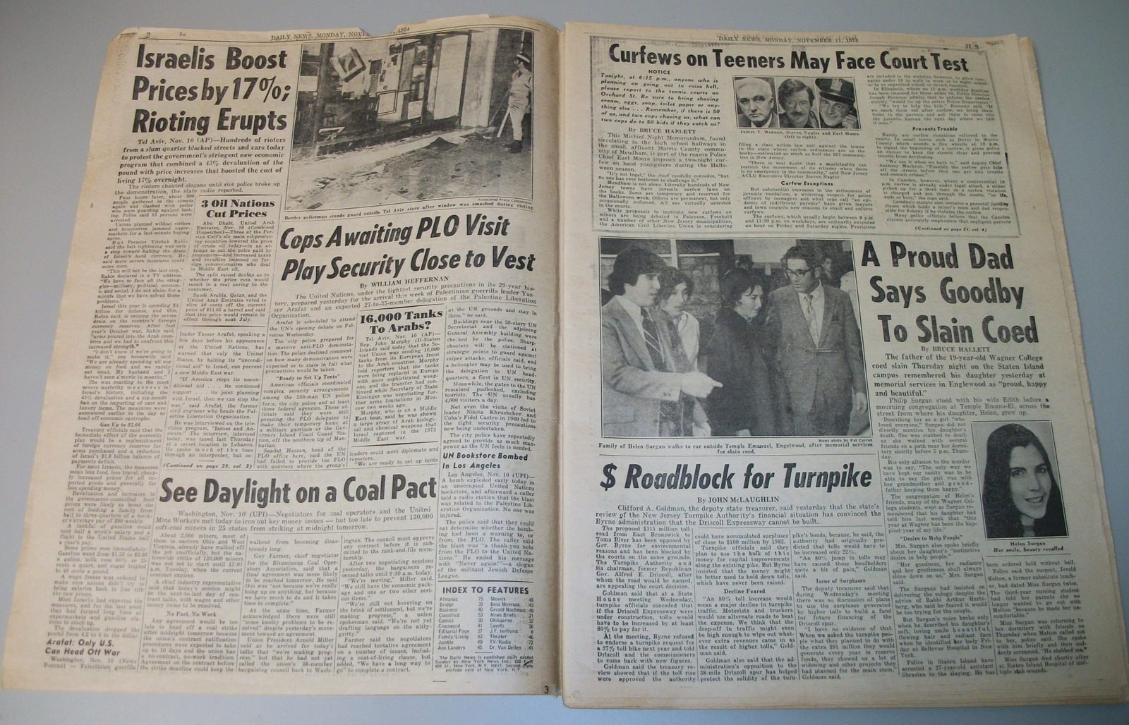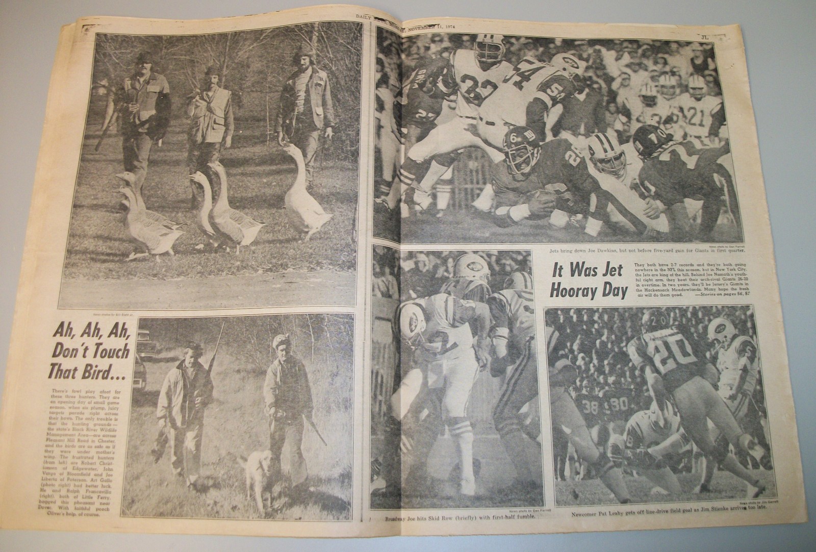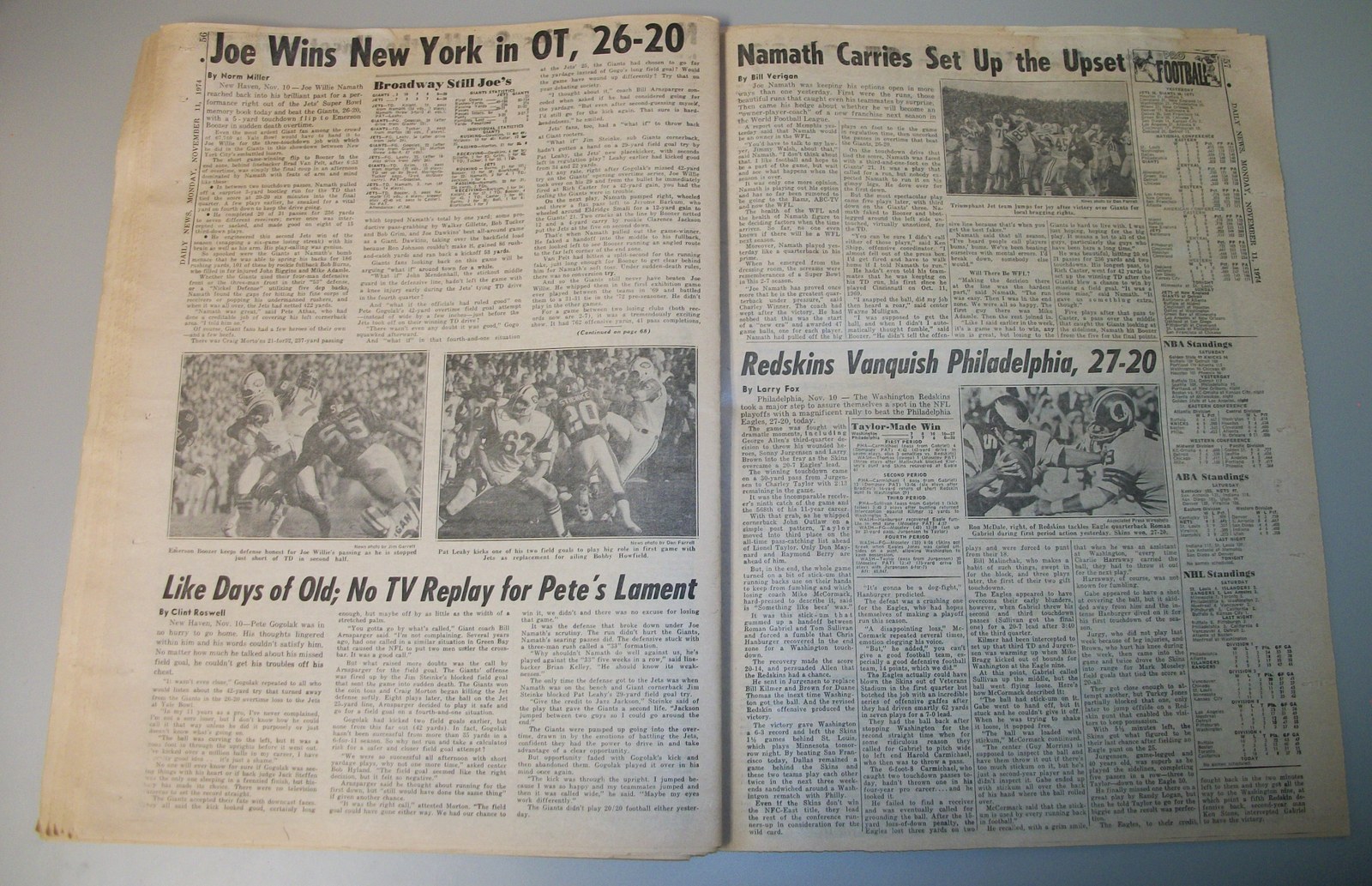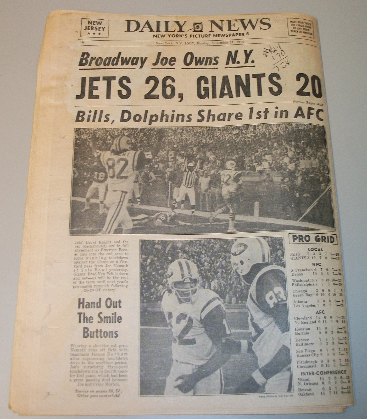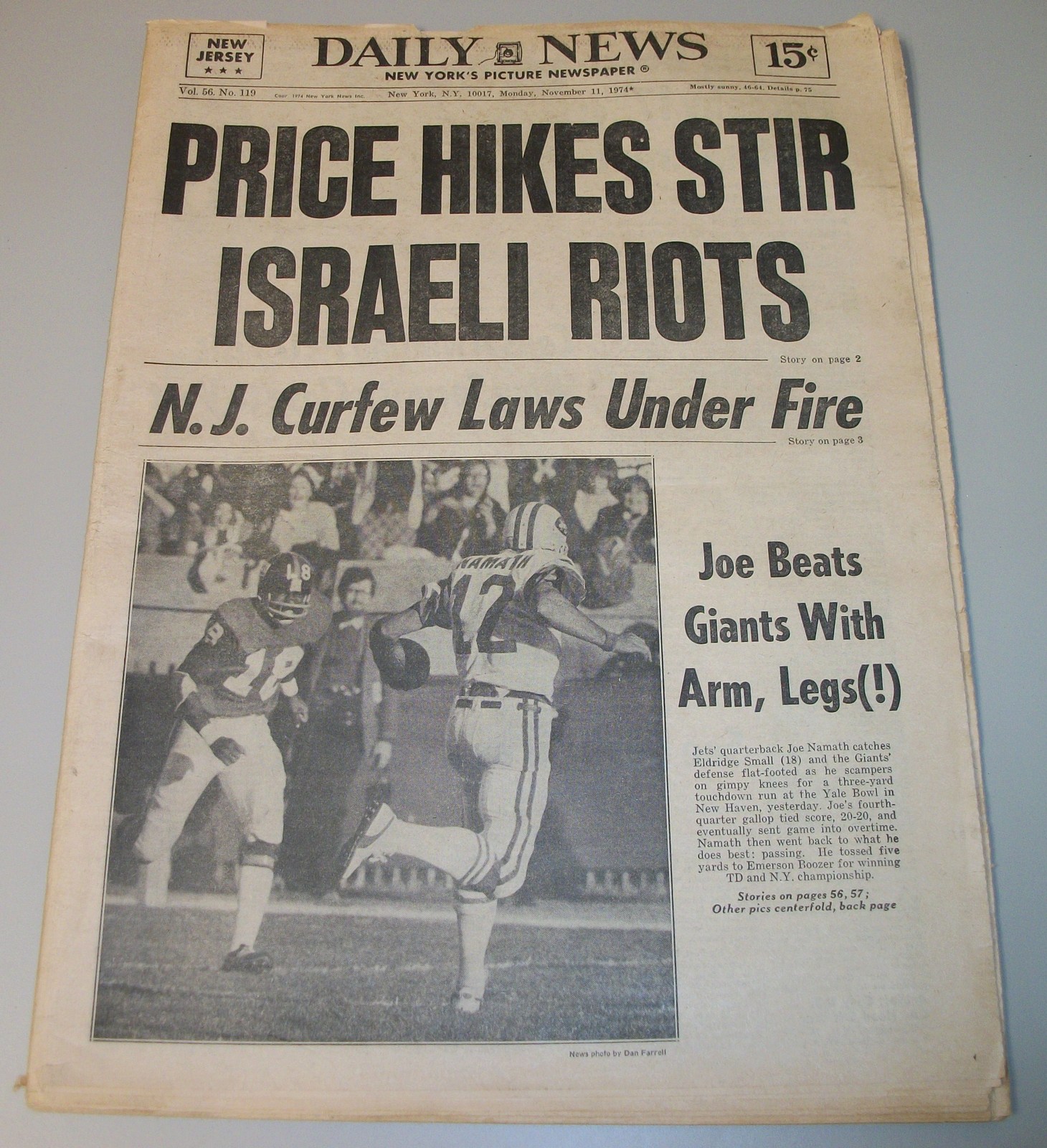 New York Daily News (New Jersey) – Monday November 11, 1974. What you see in the pictures is what you get. This is a very interesting old newspaper which features as the front page stories: PRICE HIKES STIR ISRAELI RIOTS | N.J. Curfew Laws Under Fire | Joe (Namath) Beats Giants With Arm, Lega(!). The sports section features coverage of professional football. 76 Pages.
