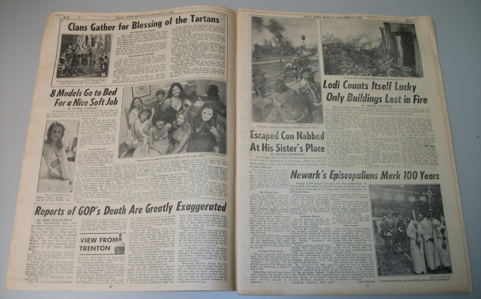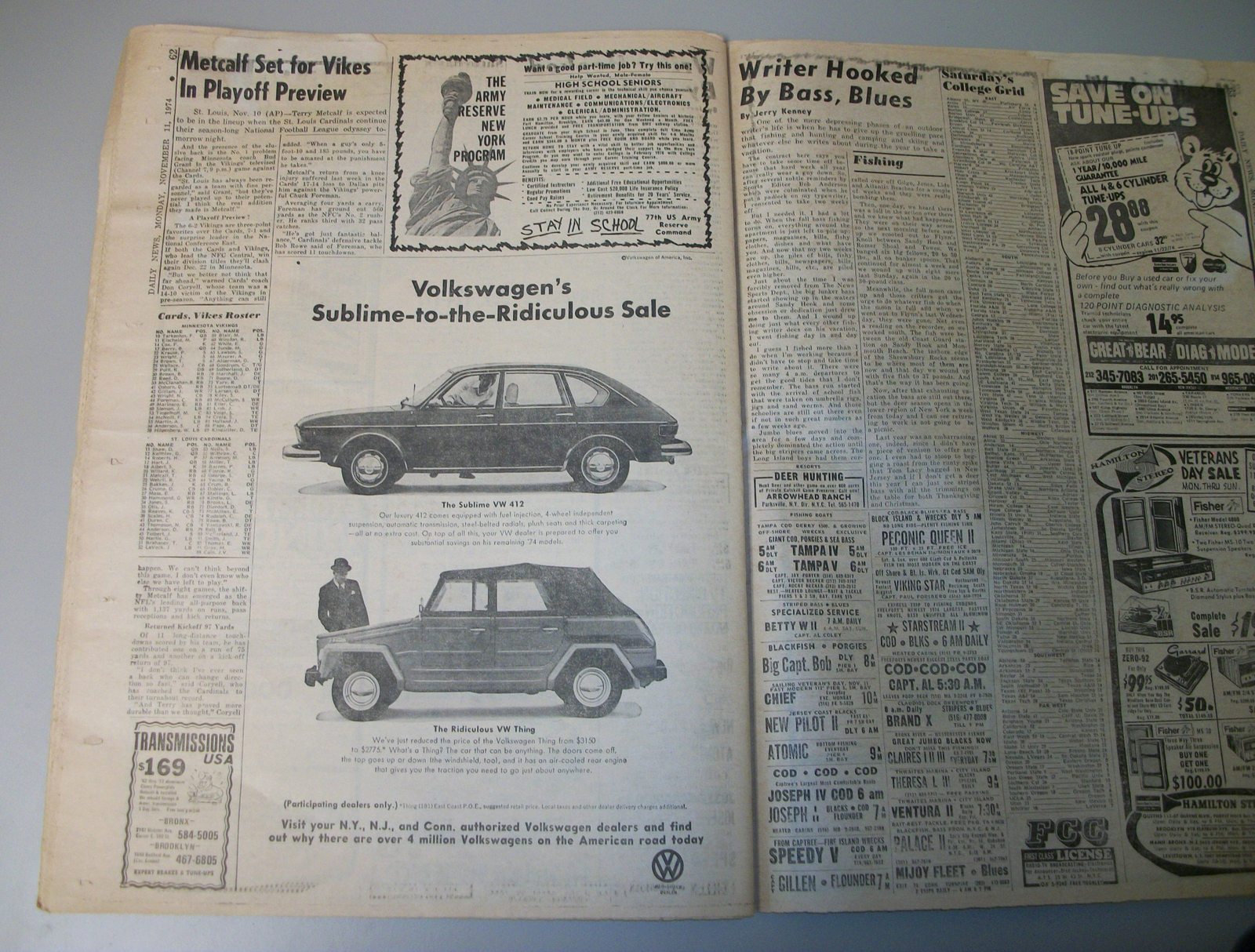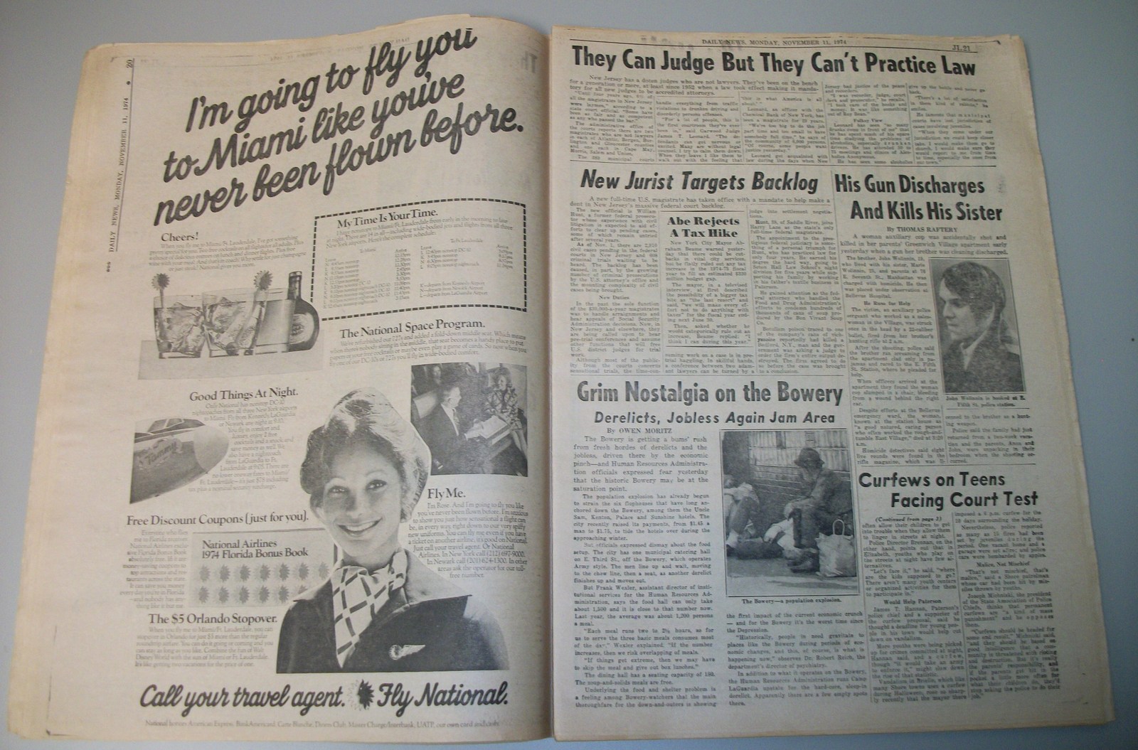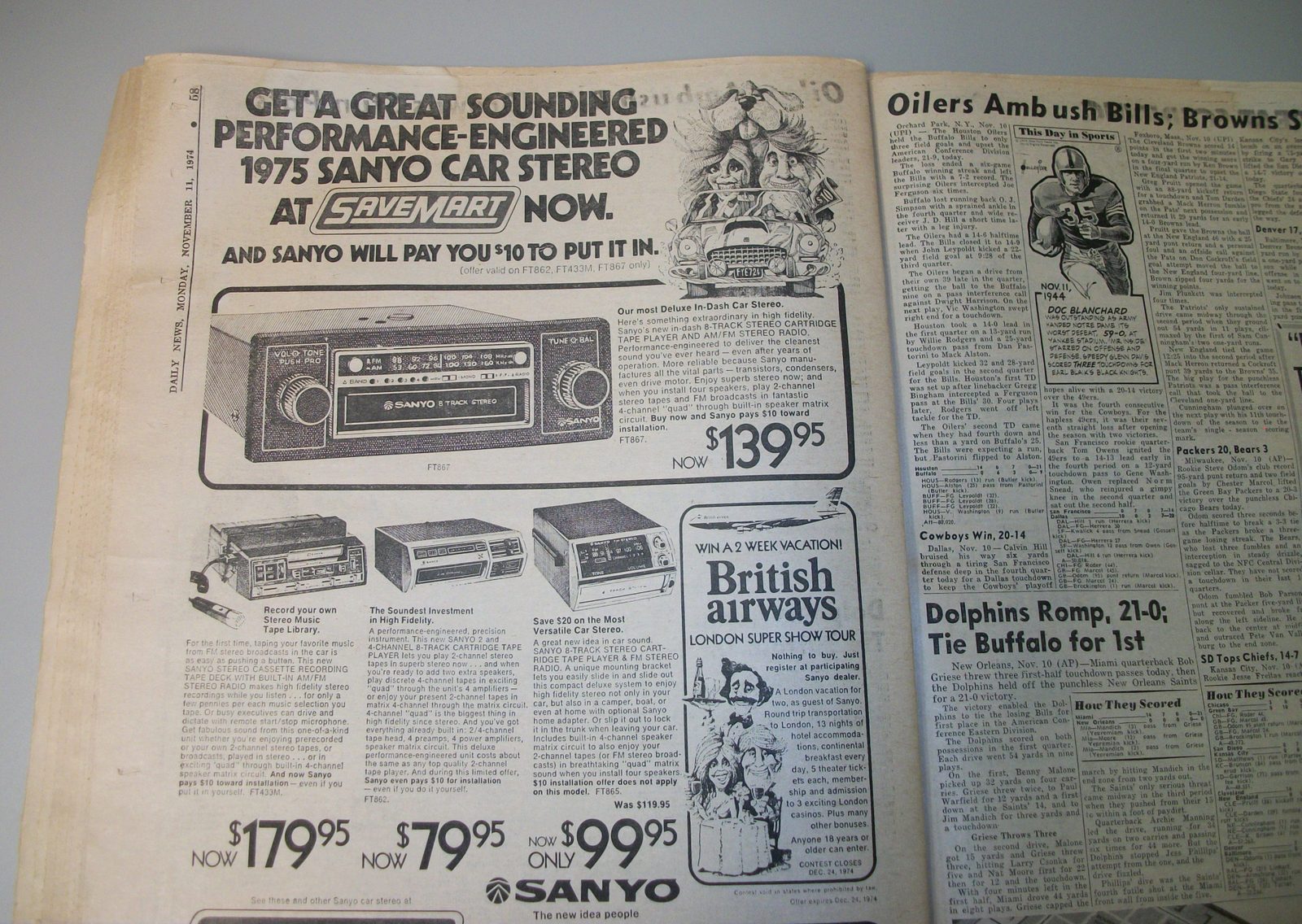 New York Daily News (New Jersey) – Monday November 11, 1974. What you see in the pictures is what you get. This is a very interesting old newspaper which features as the front page stories: PRICE HIKES STIR ISRAELI RIOTS | N.J. Curfew Laws Under Fire | Joe (Namath) Beats Giants With Arm, Lega(!). The sports section features coverage of professional football. 76 Pages.